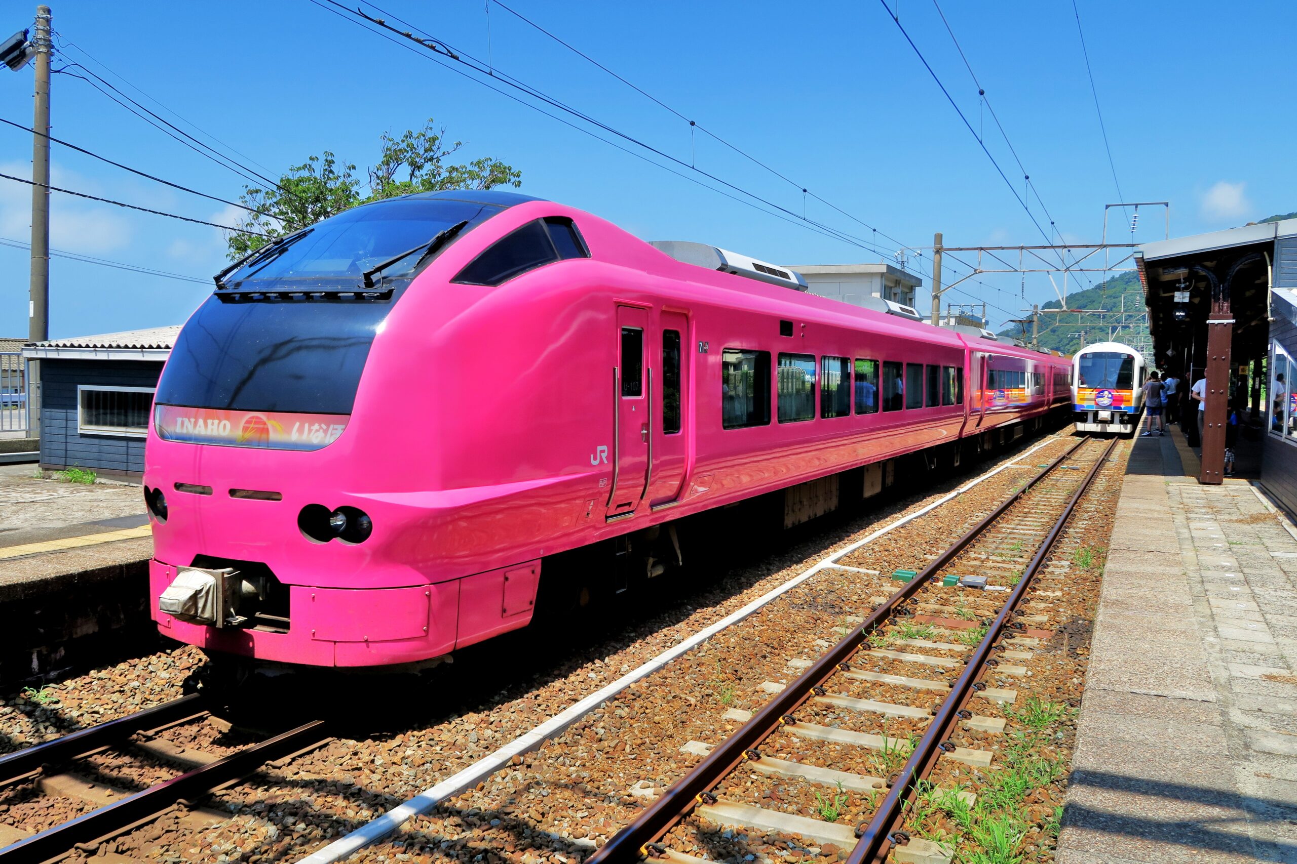 特急「いなほ」のショッキングピンクの車体が鮮やかです。