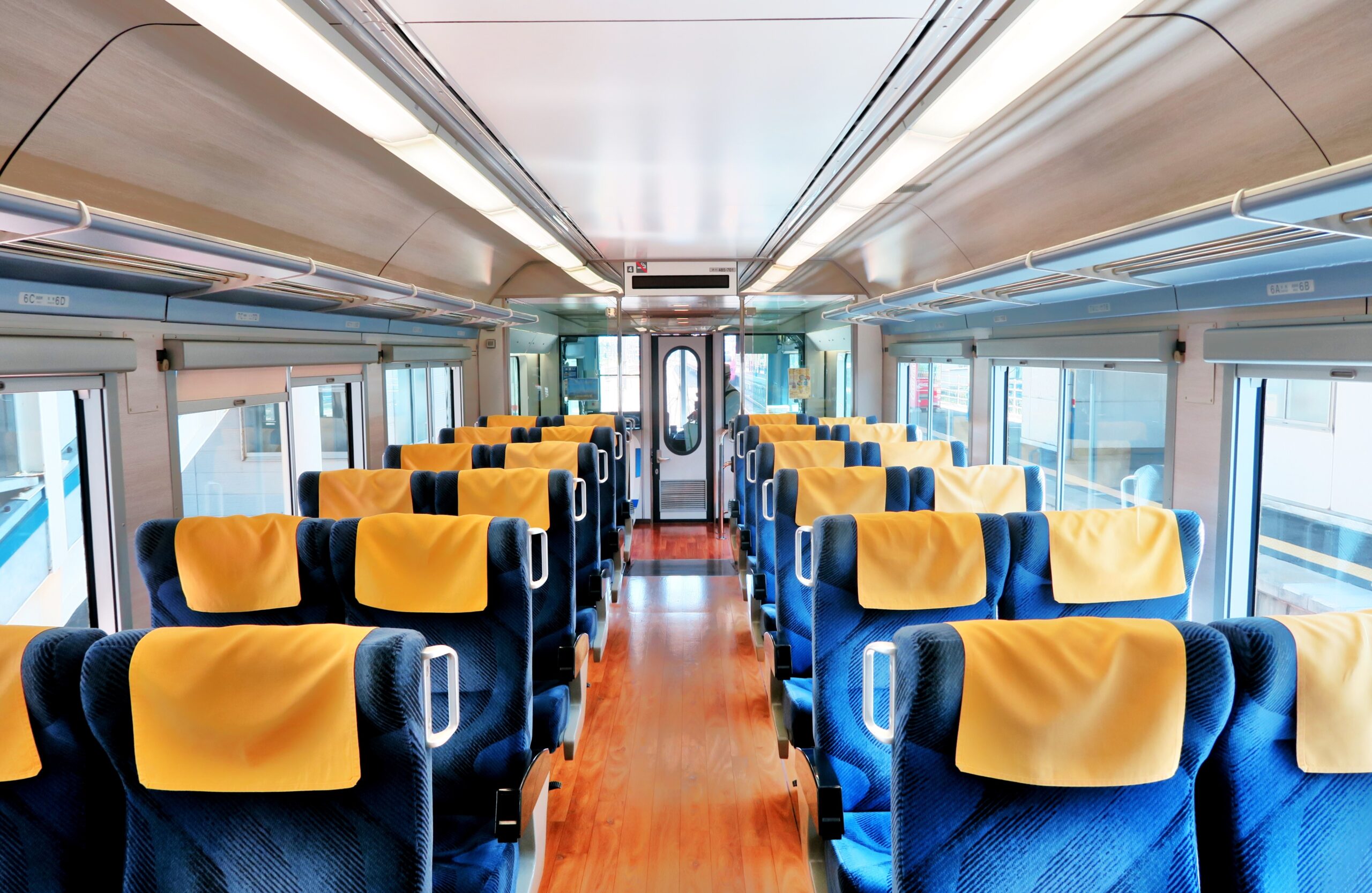客室のシートは、リクライニング式を採用し、席と席の間はグリーン車なみのゆとりを確保しています。また車両内部は通常よりも天井と床が高く、窓も大型タイプになっていて、ゆったりとくつろぎながら、日本海の雄大なパノラマを思う存分楽しむことができます。酒田方面行きの場合1号車が先頭車両となり車両左側A座席窓側が海側になります。また新潟行きは4号車が先頭になりますがこちらもA席窓側が海側になります。