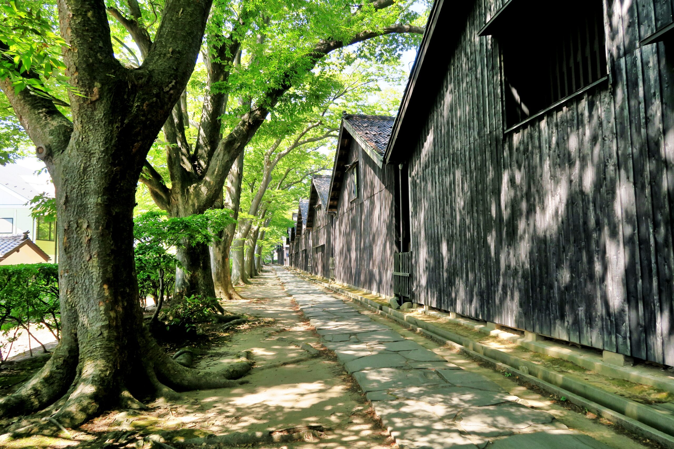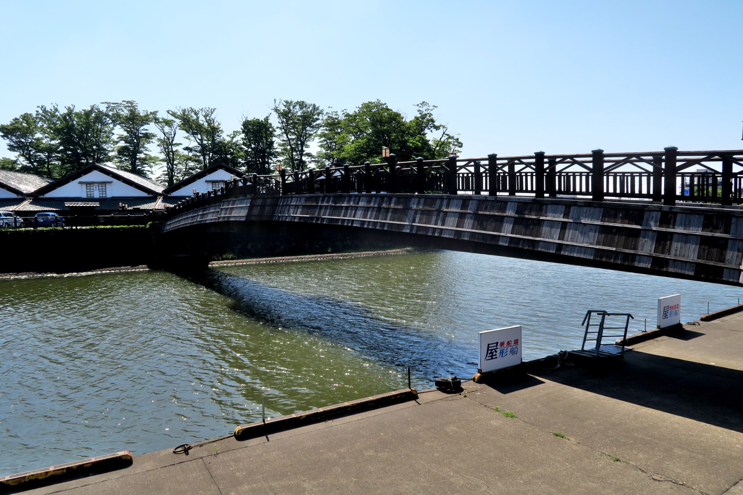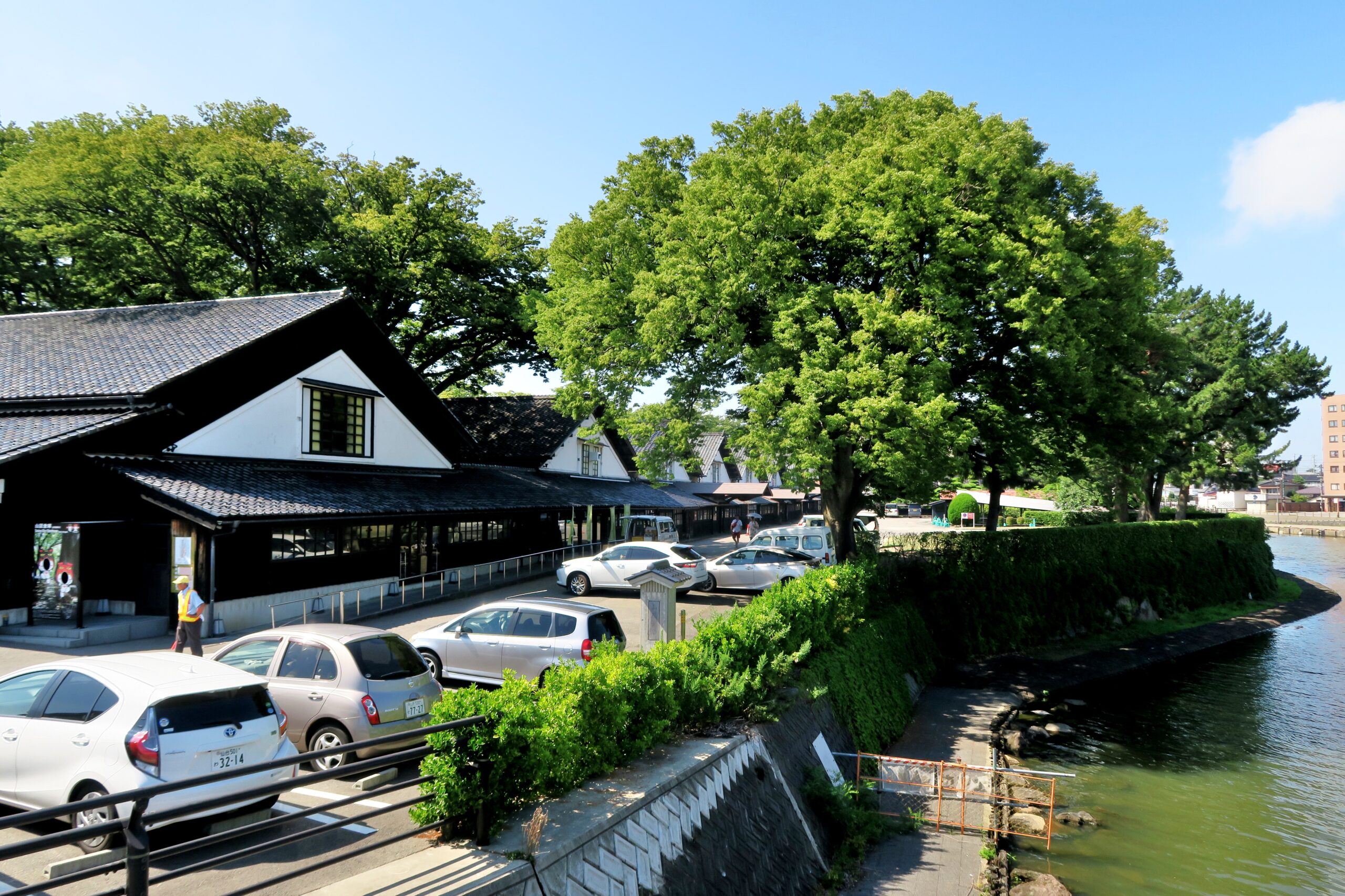 そんな北前船の歴史を引き継ぐ施設ともいえる酒田の一番人気観光スポットが、ケヤキ並木が彩る酒田のシンボル「山居倉庫」です。明治26年(1893)に旧藩主酒井家によって建てられた山居倉庫は、江戸時代に米の積み出しで栄えた庄内で今も現役の米穀保管庫です。大正時代には、倉庫の前の船着場は、最上川の支流新井田川で、舟運の重要な拠点になっていました。NHK『おしん』のロケ地でもあります。新井田川にかかる「新内橋」のたもとに着くと、左右にのこぎりの歯のような屋根が連なる黒い倉庫が見えます。