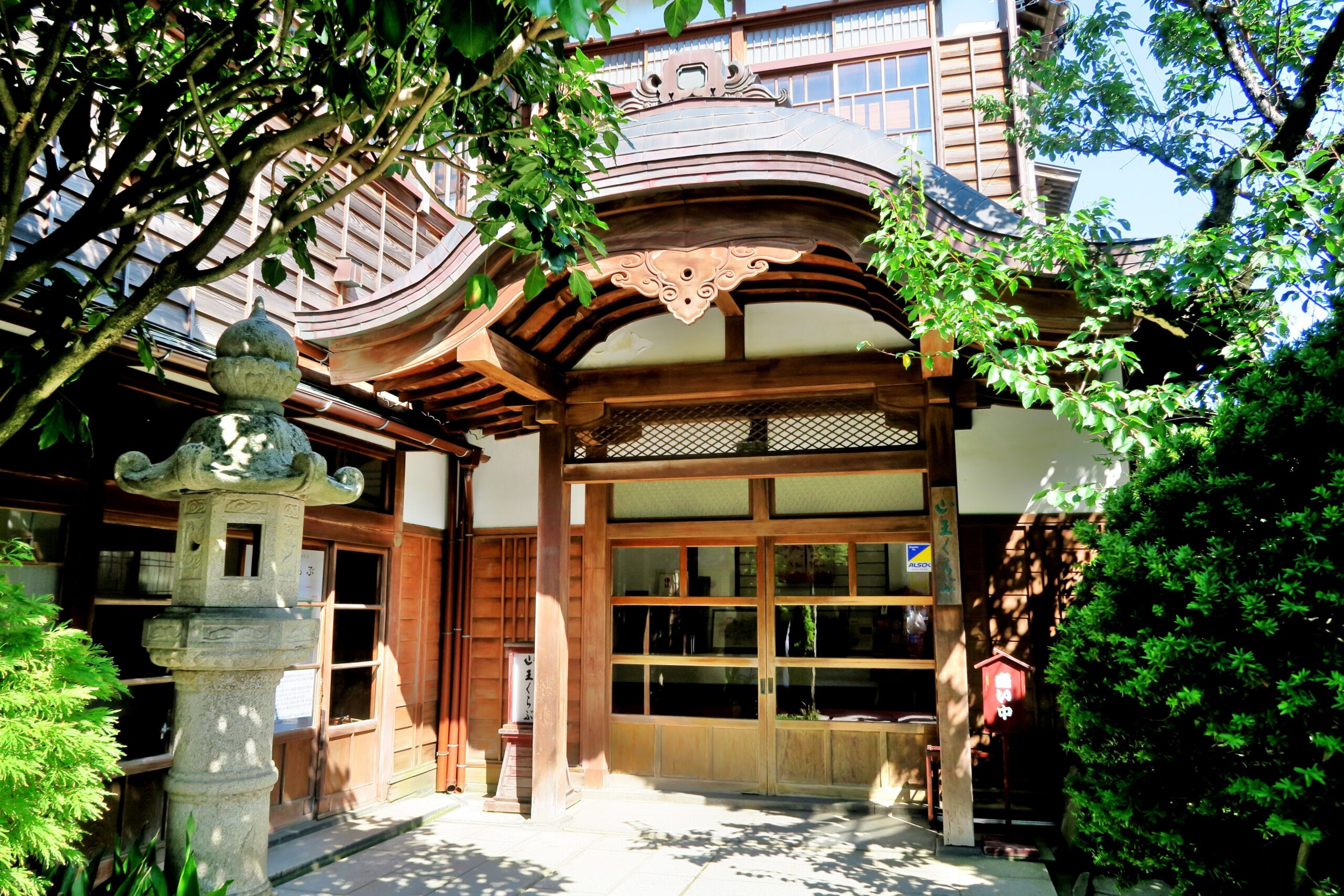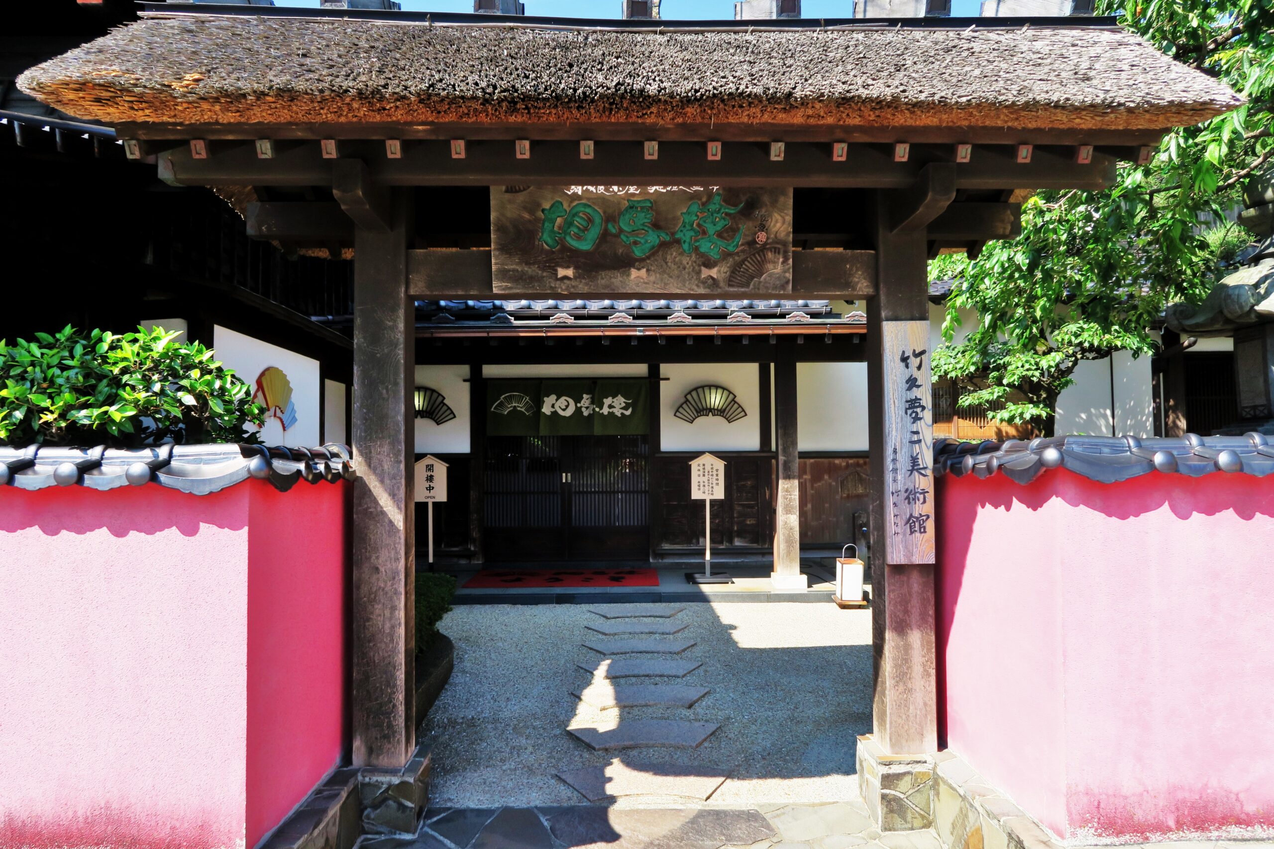 昔のガス灯を彷彿とさせるレトロな街灯が立つ、石畳の小路。ひときわ目を引くのが、江戸時代に賑わった料亭「相馬屋」を修復して平成12年、舞妓茶屋として開樓した建物「舞妓茶屋 相馬楼」の紅花色の塀と趣のある茅葺きの門です。現在残る建物は、明治27年(1894)の庄内地震で焼失した後、残った土蔵を取り囲んで建てられたもの。