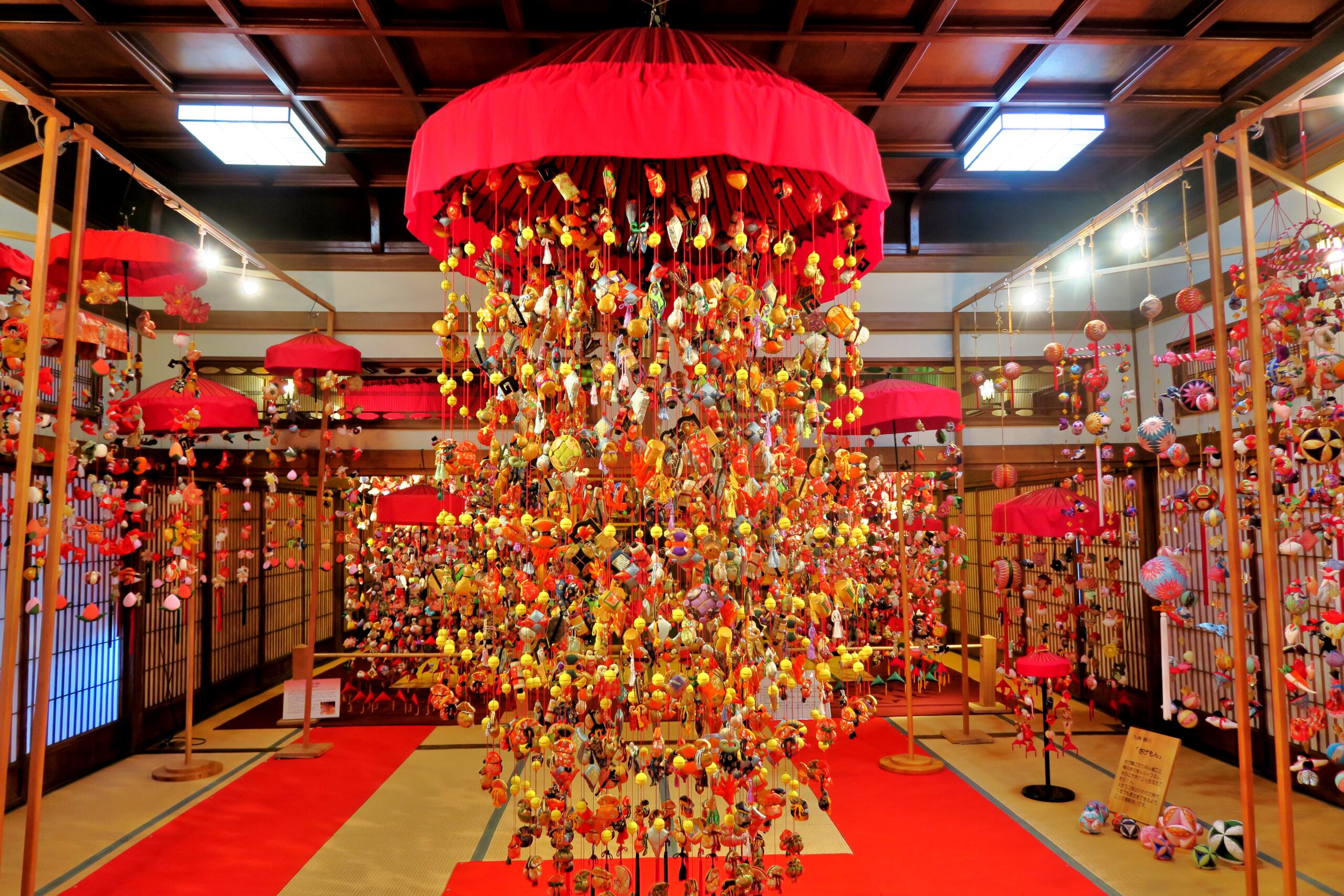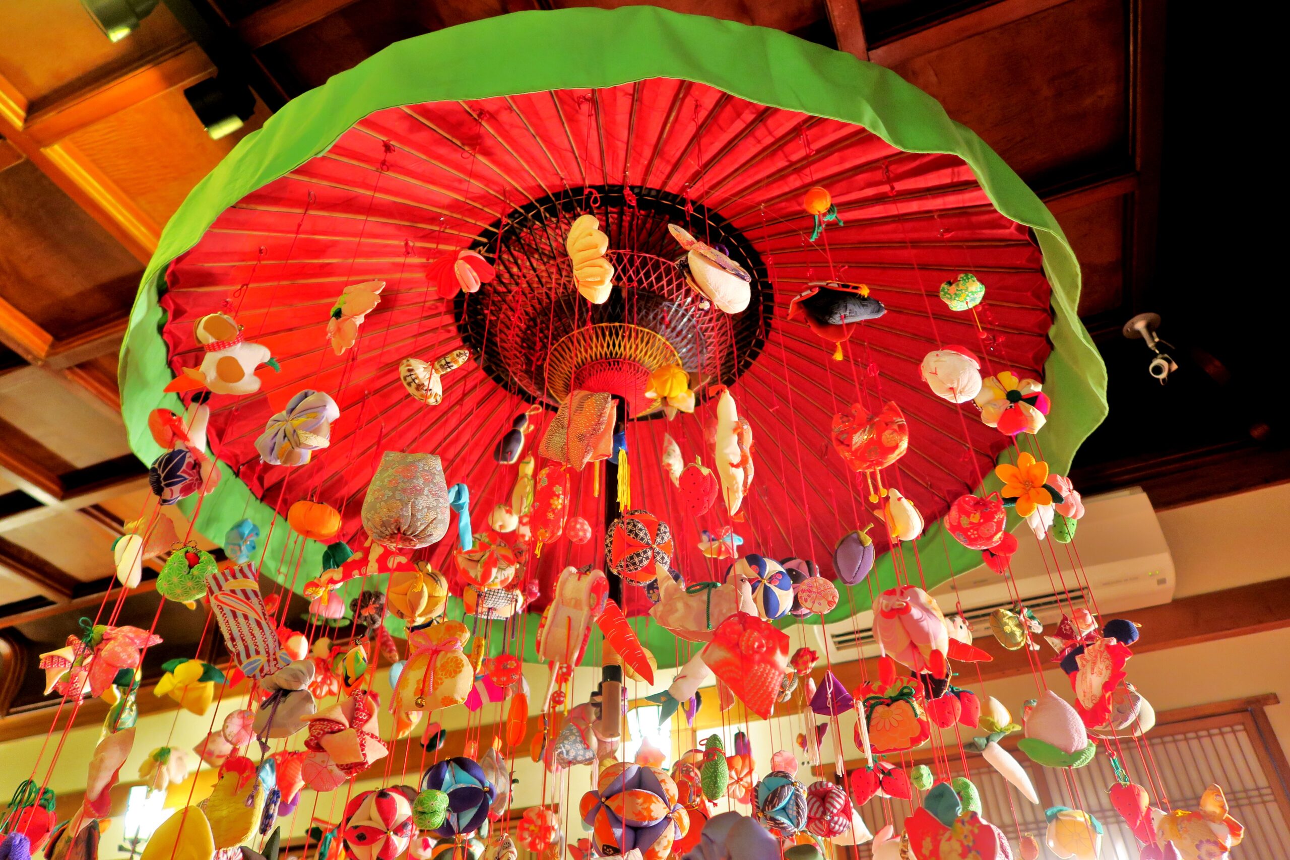 天井から吊るされた鮮やかな傘福。飾り1つ1つにさまざまな意味や願いが込められています。