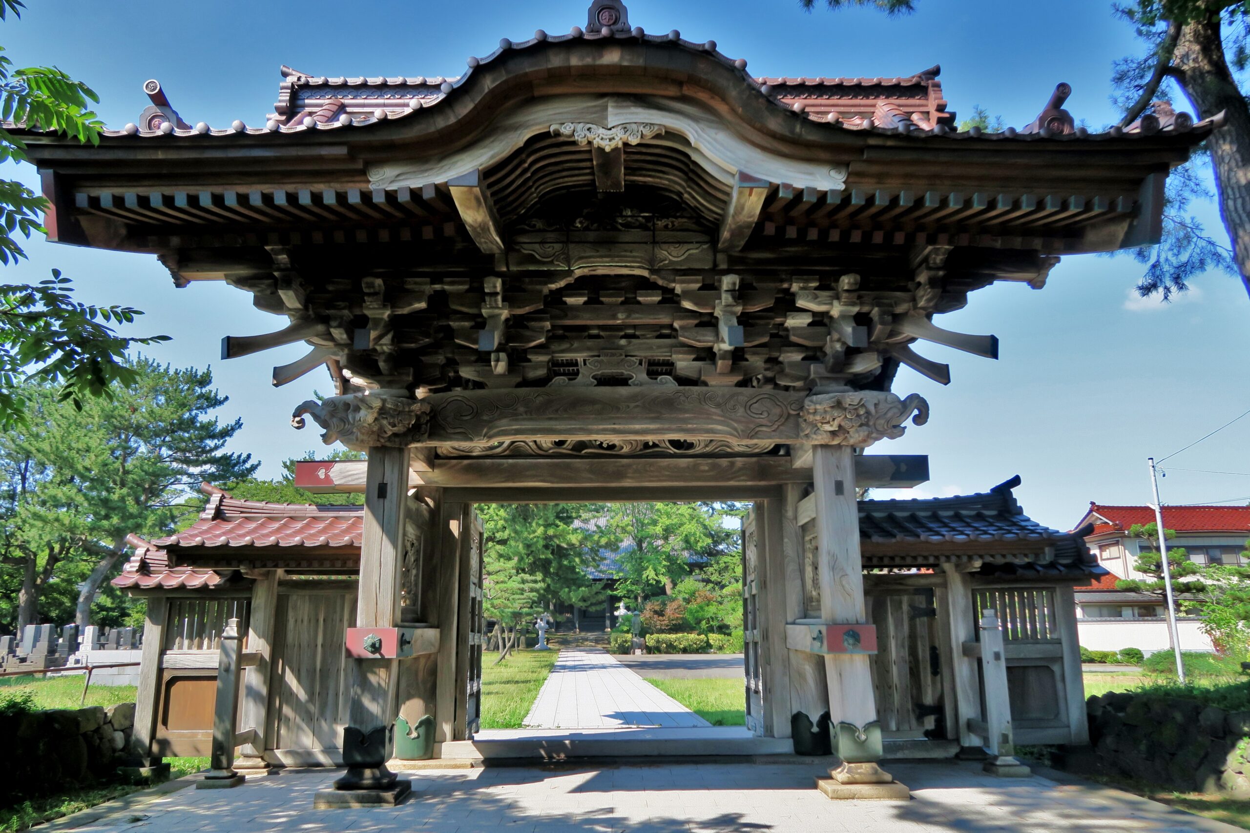 駅に戻る途中に立ち寄ったのが浄土真宗の古刹「浄福寺」です。後に歌で「本間様には及びもせぬが、せめてなりたや殿様に」とうたわれるまでになった酒田の豪商、本間家。その三代当主光丘は本間家中興の士祖として知られます。その本間光丘が、寛政12年(1800)に寄進したのが、浄福寺 唐門です。京都の東本願寺大谷祖廟を模して、「四脚向唐門」という建築様式の総ケヤキ造の流麗な門です。