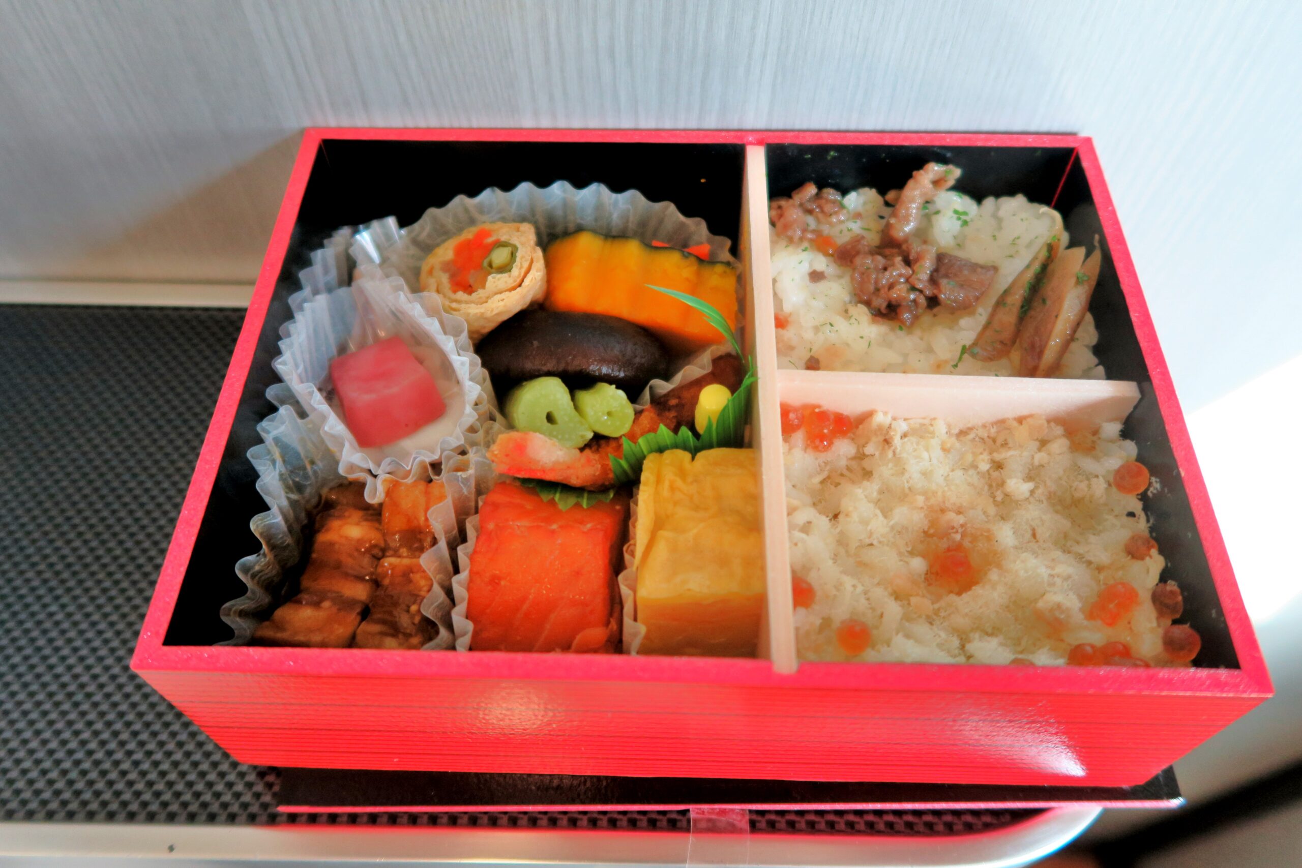 右側には新潟産コシヒカリを上下段ともに敷き詰め、上段には新潟和牛牛牛蒡を、下段には自家製鯛めしにいくらを散らしています。左側のおかずには鮭の焼漬、厚焼き玉子、豚角煮、佐渡産一夜干しイカ、田舎巻き等がちりばめられています。