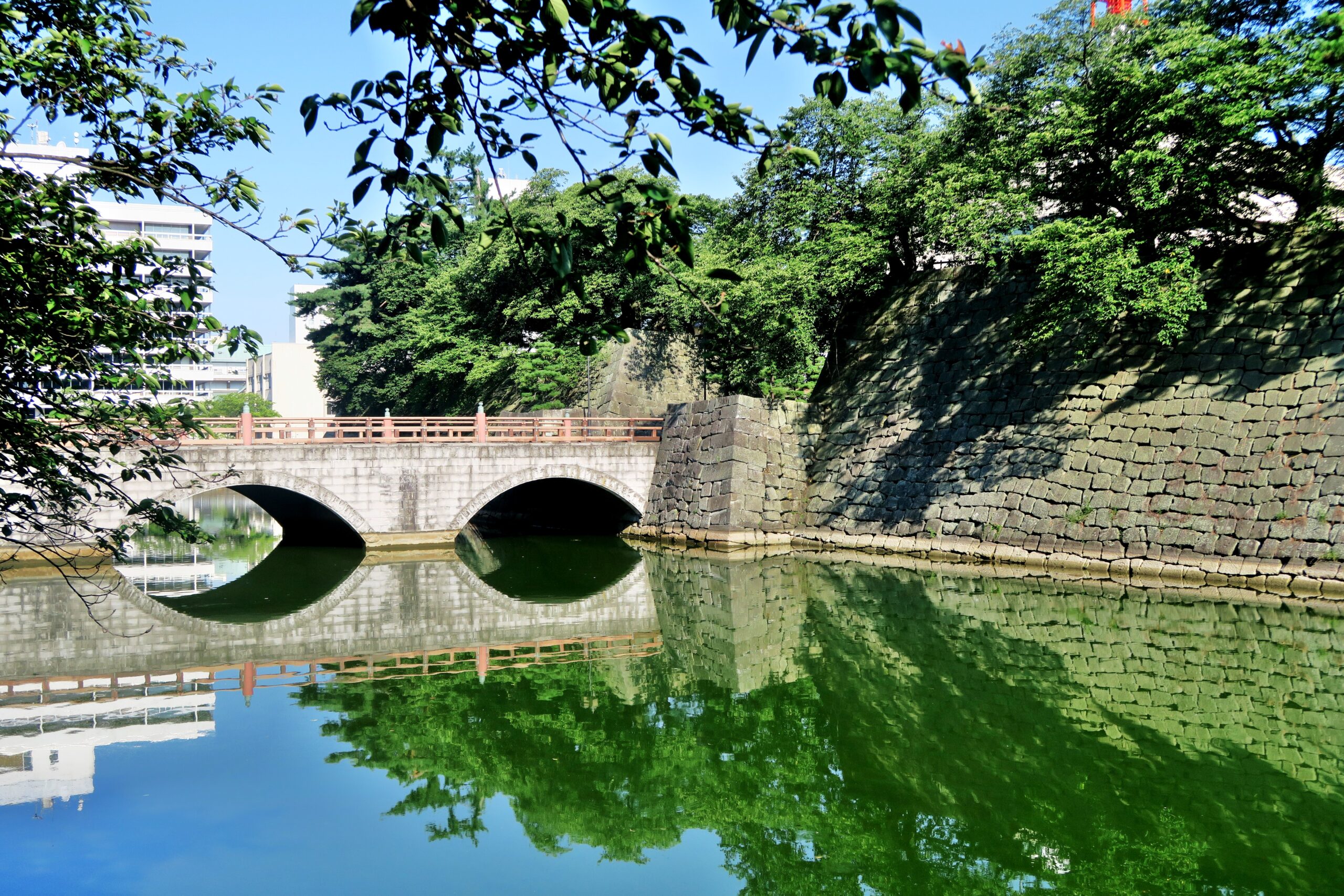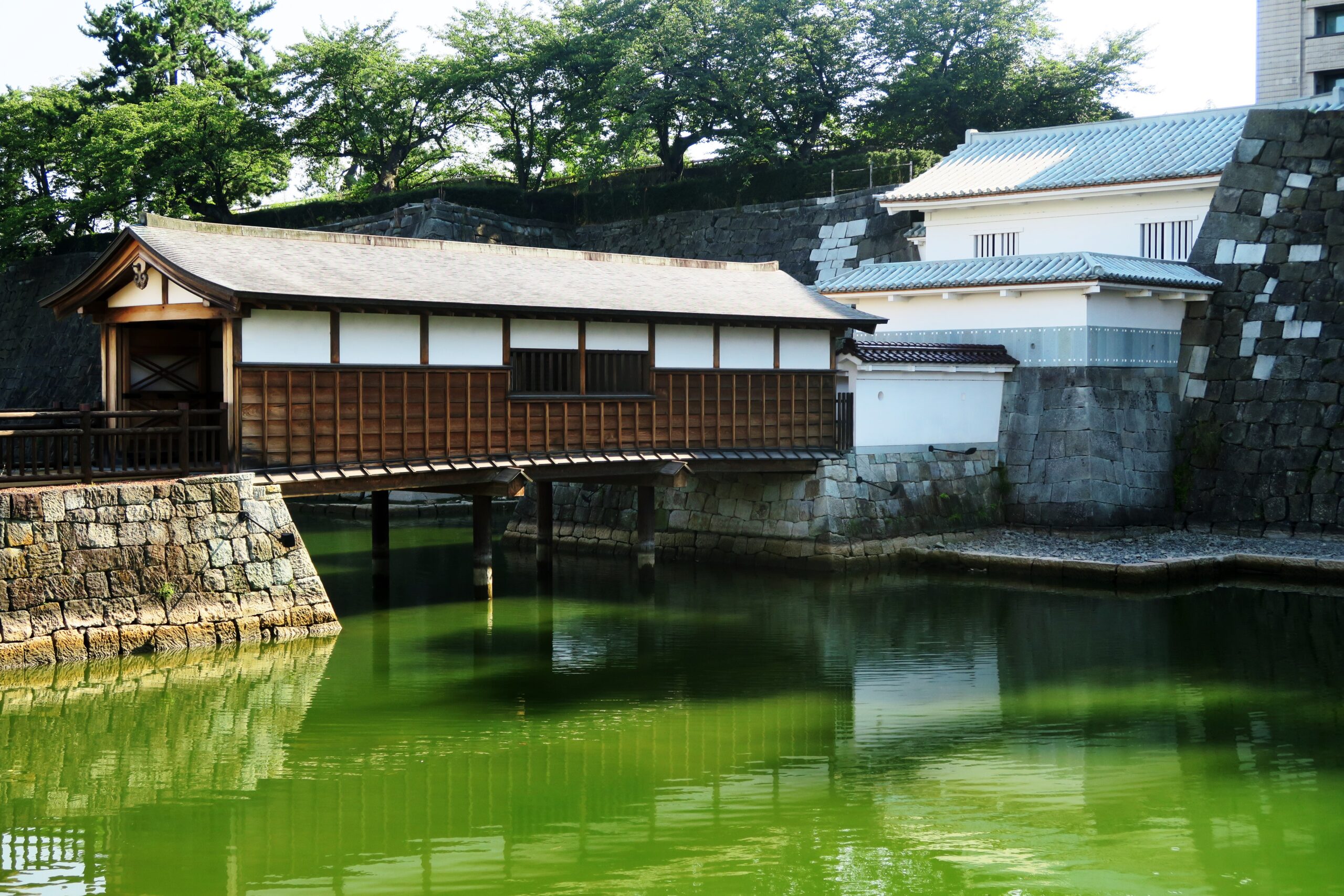寛文9年(1669)に発生した大火により多くの櫓や城門とともに天守も消失してしまいましたが、一帯には今も天守台などの遺構が残ります。本丸内には、政庁と藩主の居住部分を合わせた床面積1千坪を超える御殿がありました。歴代藩主の内、昌親(のち吉品)・重富・治好・慶永(春嶽)・茂昭の5代の時代は、藩主の住居であった御座所が西三之丸にあった時代で、藩主が御座所から政庁のある本丸へ渡った西側のお堀に架かる藩主専用の橋「御廊下橋」が2017年に復元されています。内堀にかかる屋根付きの橋が印象的で、本丸への重要な通用口だったことが想像できます。
