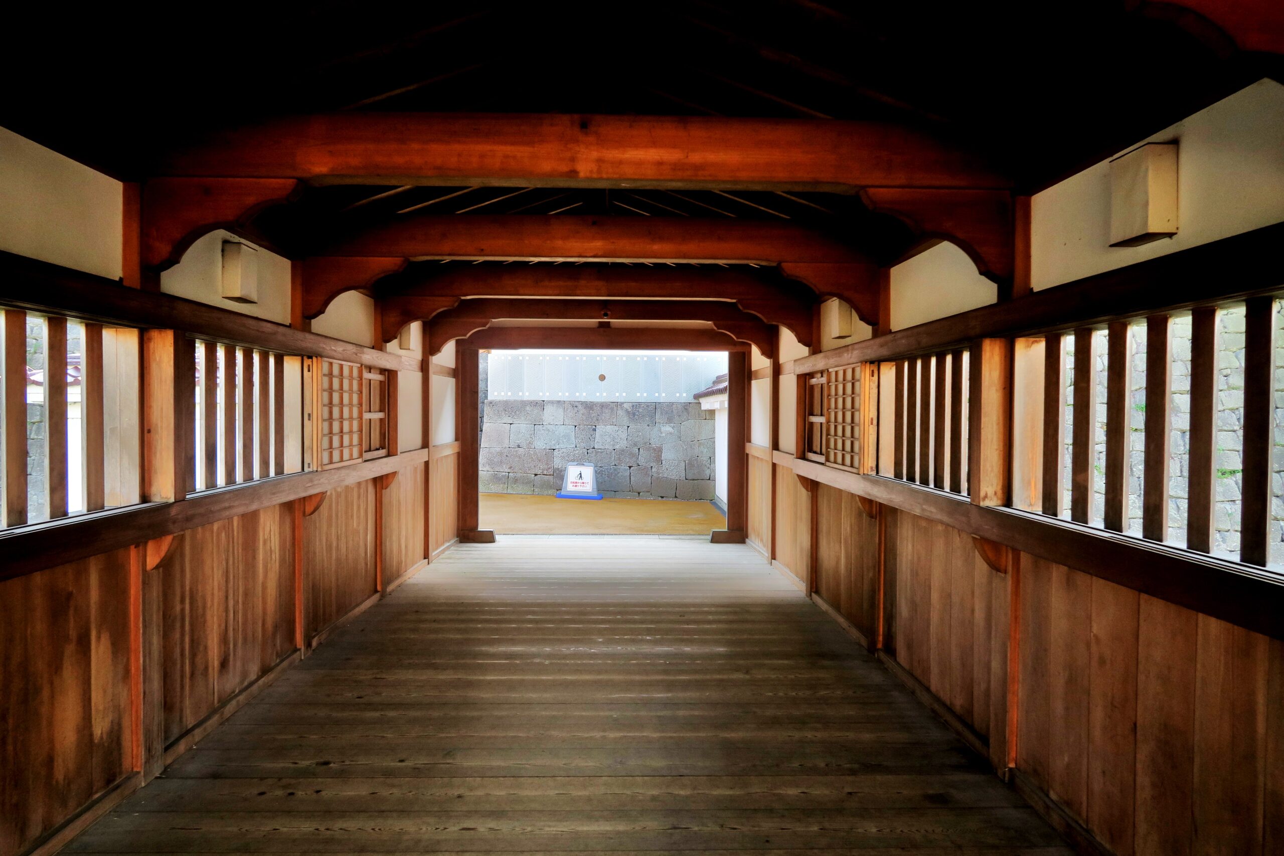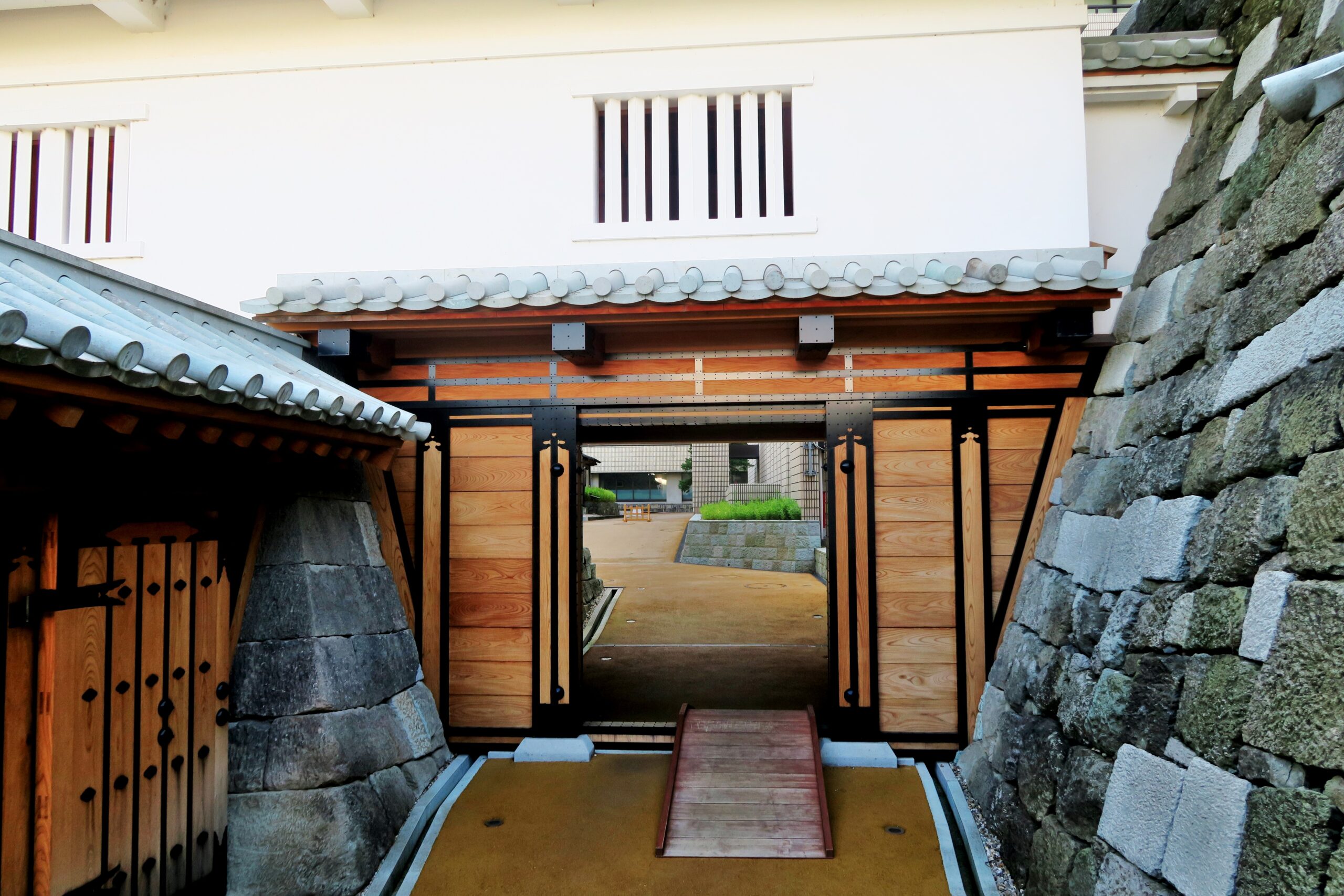 棟門は枡形に入る最初の門で2本の柱とその上部を連結する冠木で切妻造りの屋根を支える構えをしています。門扉や門を支える柱などには欅材を用いています。土塀の屋根には瓦が葺かれ、腰板石が張られていました。櫓門は高石垣に挟まれた場所に建っていて、門の上に櫓を設けた木造二階建て切妻造、本瓦葺、上階の外壁は漆喰で仕上がられています。桁行10.46m、梁間5.46m、高さは8.41mに及ぶ大きな構えをしています。写真は山里口御門の枡形内です。