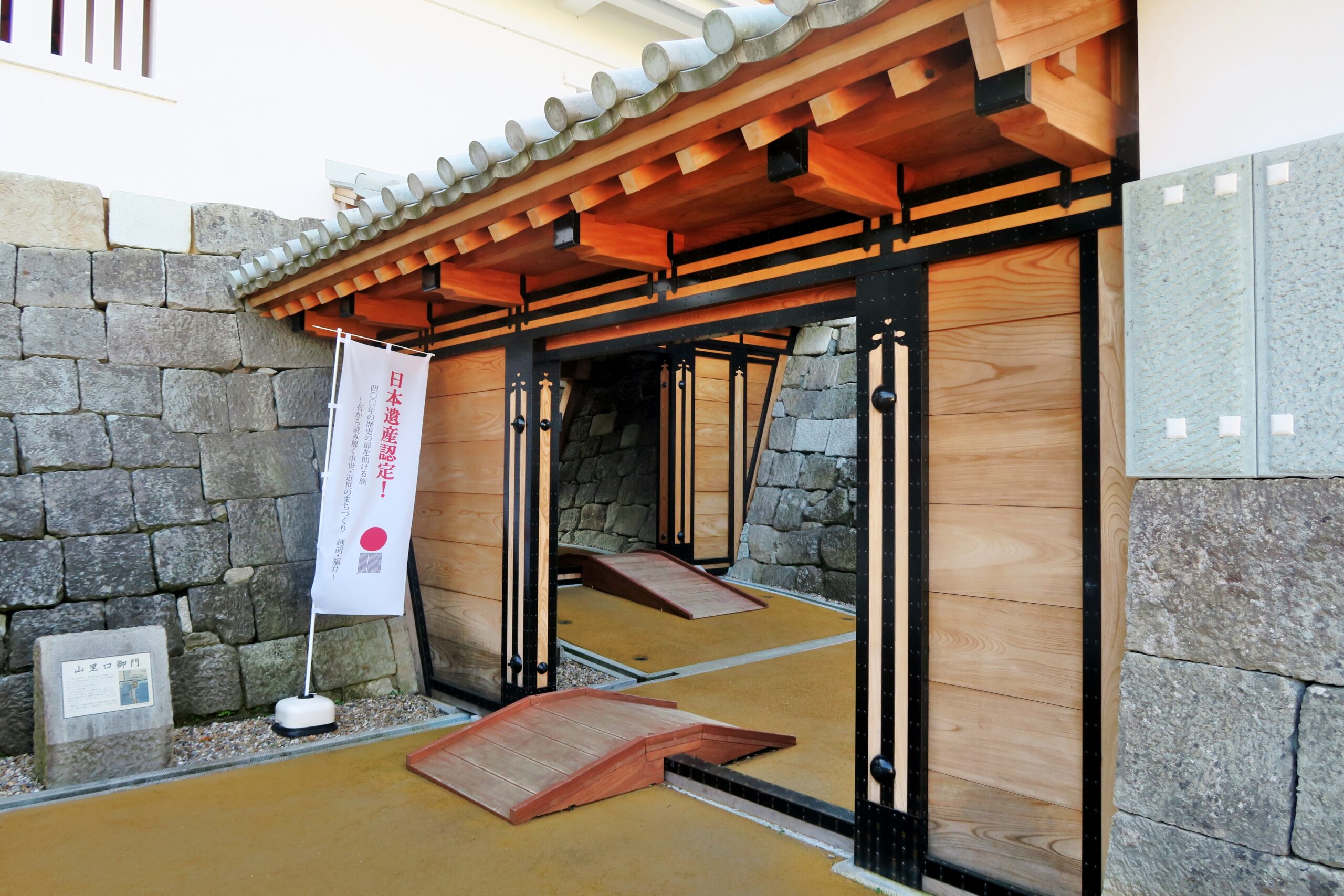 山里口御門はその構造と向きの異なる約3.5mの高さの棟門と二階建で約8mの高さの櫓門とで構成され、棟門を通過したところに方形の枡形という空間を作り、その先に櫓門を構えた枡形門形式を成しています。枡形門を更に石垣と土塀が囲む厳重な構造です。