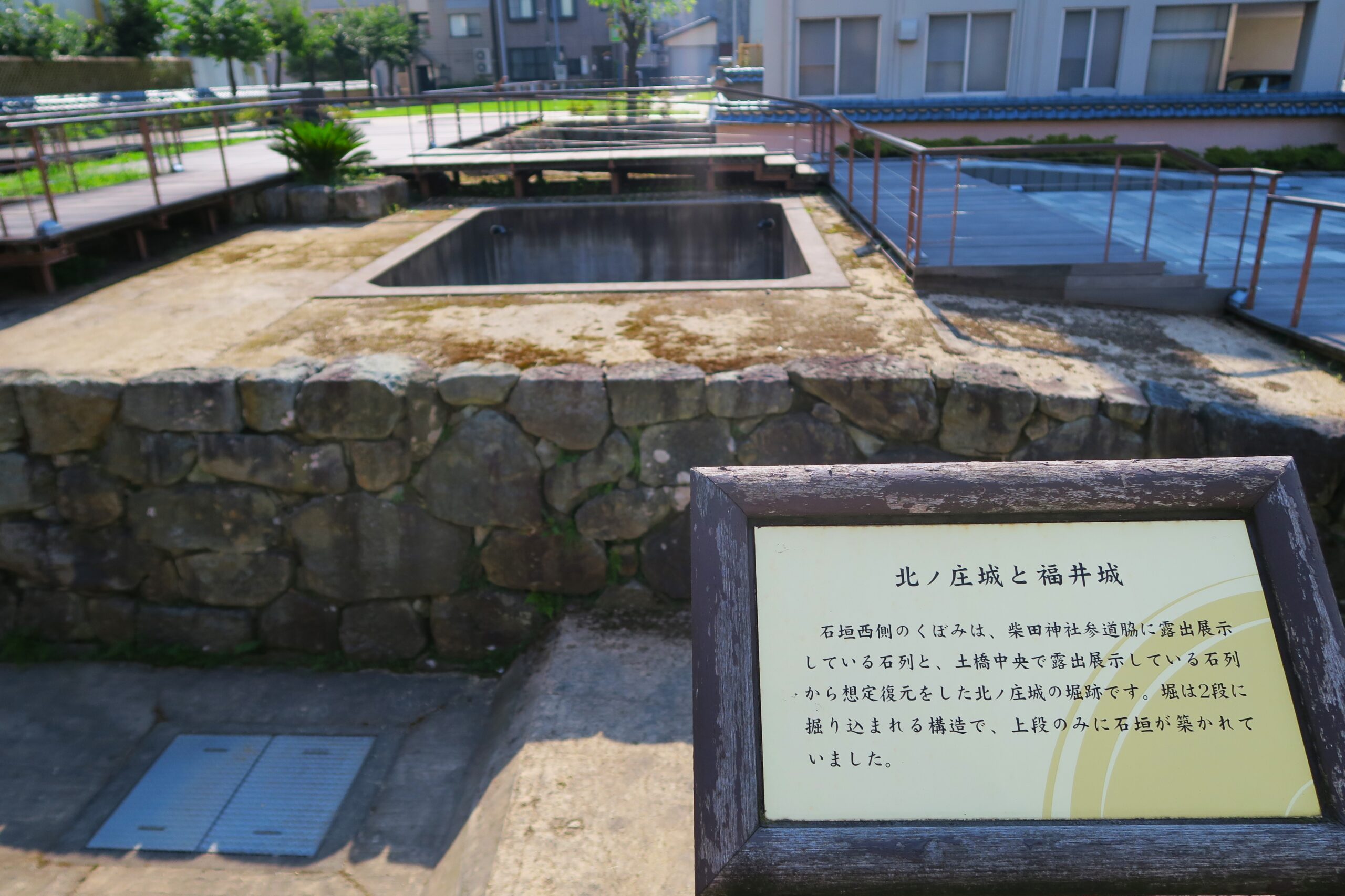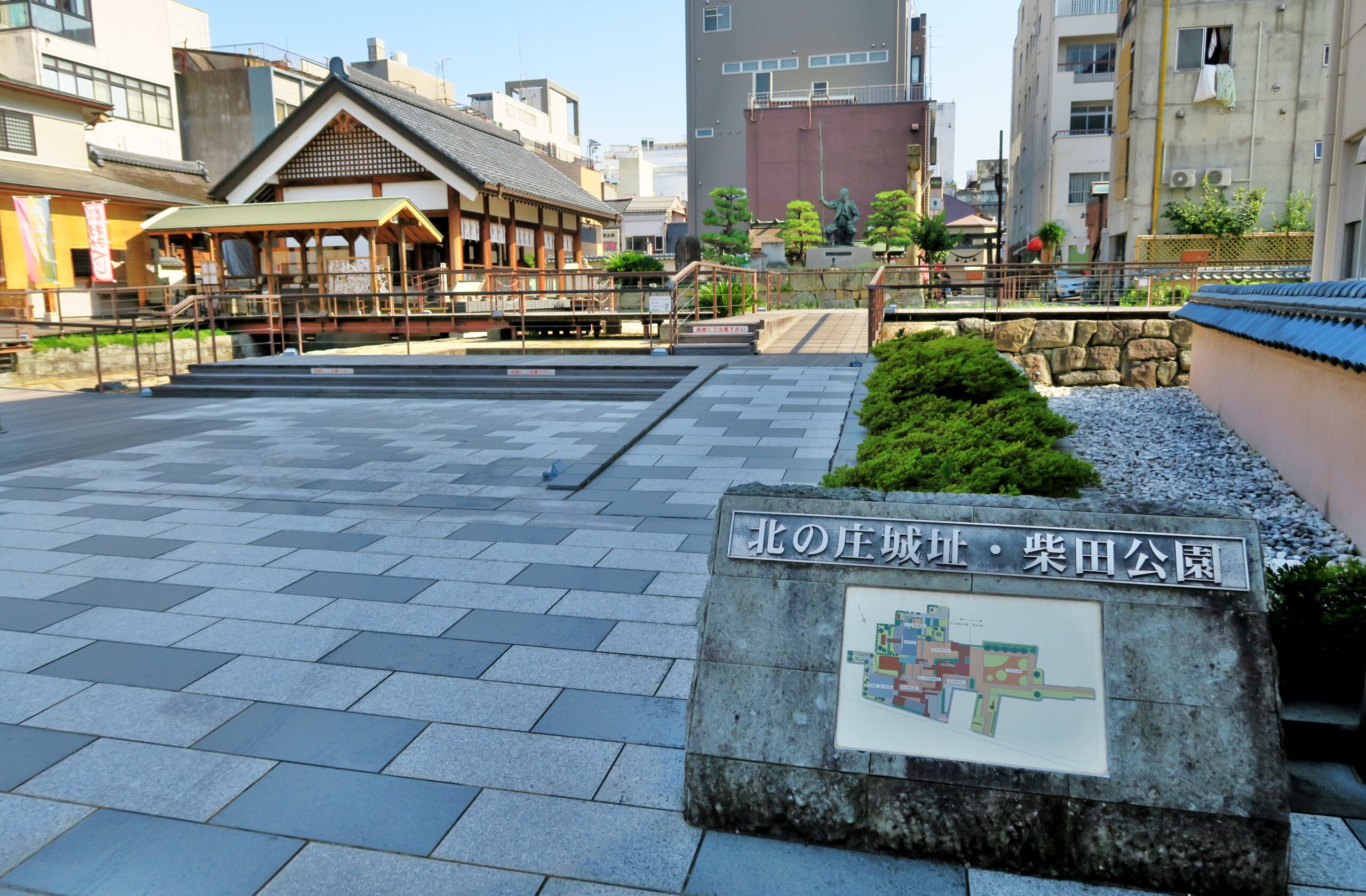 福井駅周辺の中央大通りを横切り、ガレリア元町アーケードを過ぎると現れるのが「北の庄城址・柴田公園」です。平成5年からの発掘調査によって朝倉氏滅亡後織田信長から越前8郡49万石を拝領した柴田勝家が、越後の上杉謙信に対抗するのが目的で、天正3年(1575)に築城を始めた新城は、経済発展の観点からも山間の一乗谷ではなく、足羽川と吉野川(のちの百閒堀)の合流地点を背にした場所に自ら縄張りをして築城されました。これが足羽庄という荘園がある足羽川の北にあったことから北ノ庄という地名から名付けられた北ノ庄城で織田家の北国支配の拠点となりその遺構の上に整備された公園です。