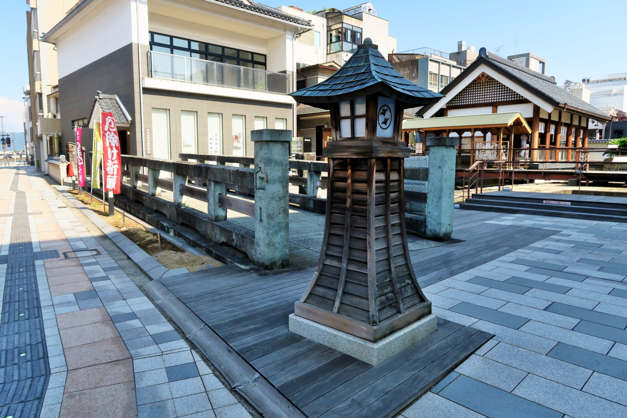 公園脇には朝倉時代にもあった九十九橋を柴田勝家が半石半木の橋として北陸道と足羽川が交わる地に架けたと伝わり、勝家公の事績として復元されています。江戸時代前期の貞淳2年(1685)の『越前国地理指南』では「大橋 長八拾八間 幅三間 板橋四拾七間 石橋四拾一間」と記載されています。また半石半木の珍しい橋として全国的にも知られていました。欄干部分は往時から残されていた旧石材が使用されています。