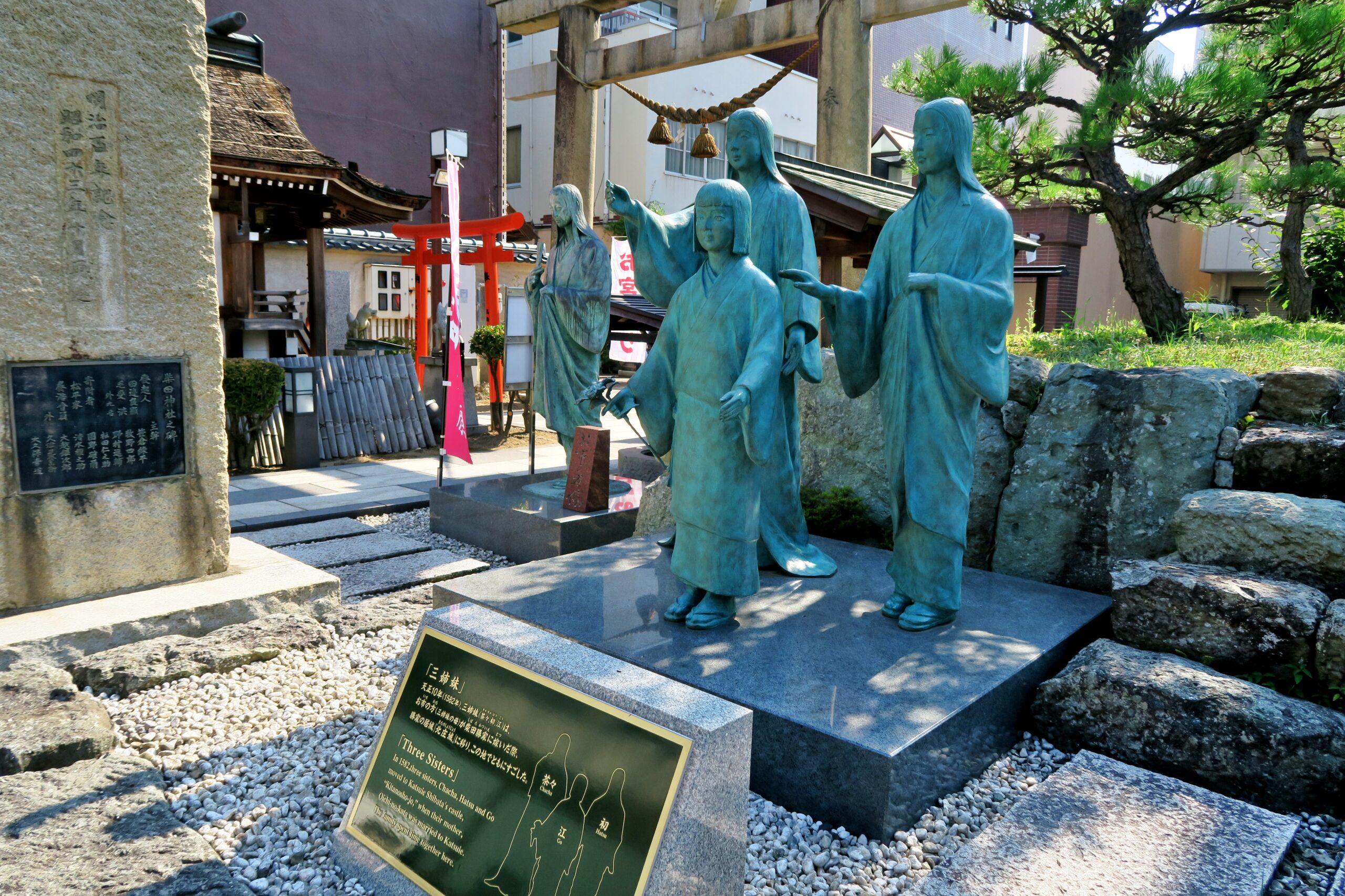 また参道の向かいには、お市と三姉妹の銅像が建てらています。奥にお市の銅像がありますが、左から茶々、江、初とい並んでいます。
