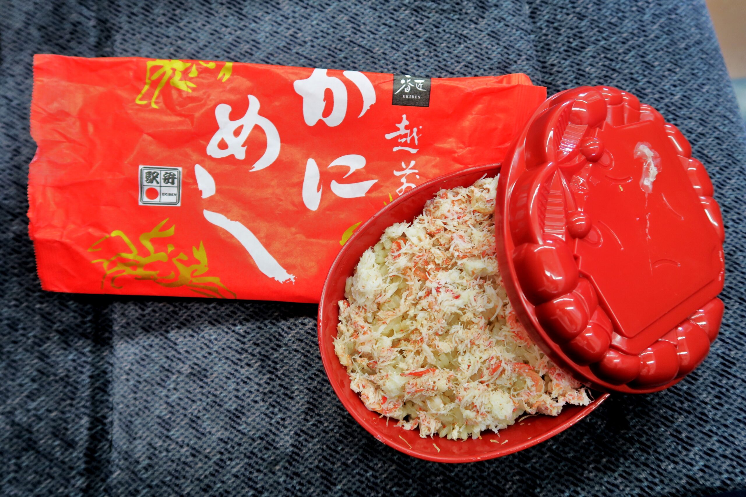 福井市内の城郭めぐりも終わり福井駅に戻り駅弁といえば「かにめし」を買って電車に乗り込みます。