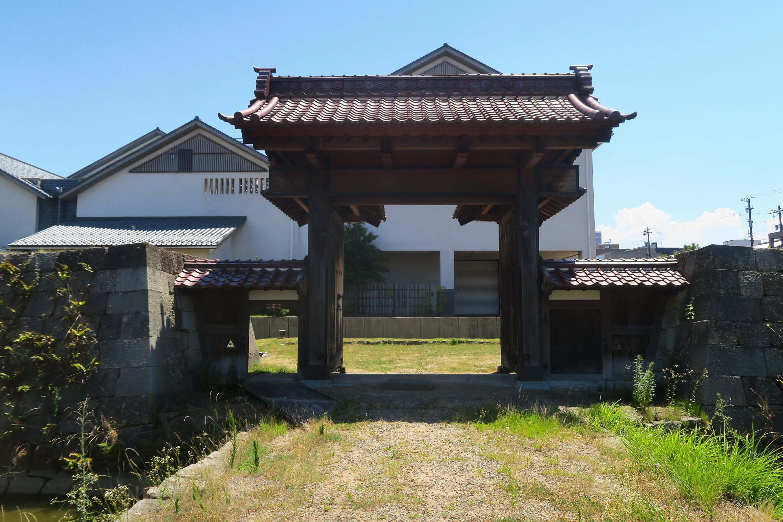 舎人門は福井城の外堀に設けられた門のひとつです。舎人門という名は江戸時代の終わり頃の様子を描いた福井城下絵図にでてくる名称で、ほかにも「清兵衛町見附御門」、「江戸野口御門」、「御泉水御門」などと呼ばれていたようです。木造瓦葺の高麗門形式で復元された舎人門は、高さ約6m、幅は脇塀を合わせて約10m、屋根は出土遺物をモデルに当時越前で作られていた越前赤瓦を復元して葺いています。