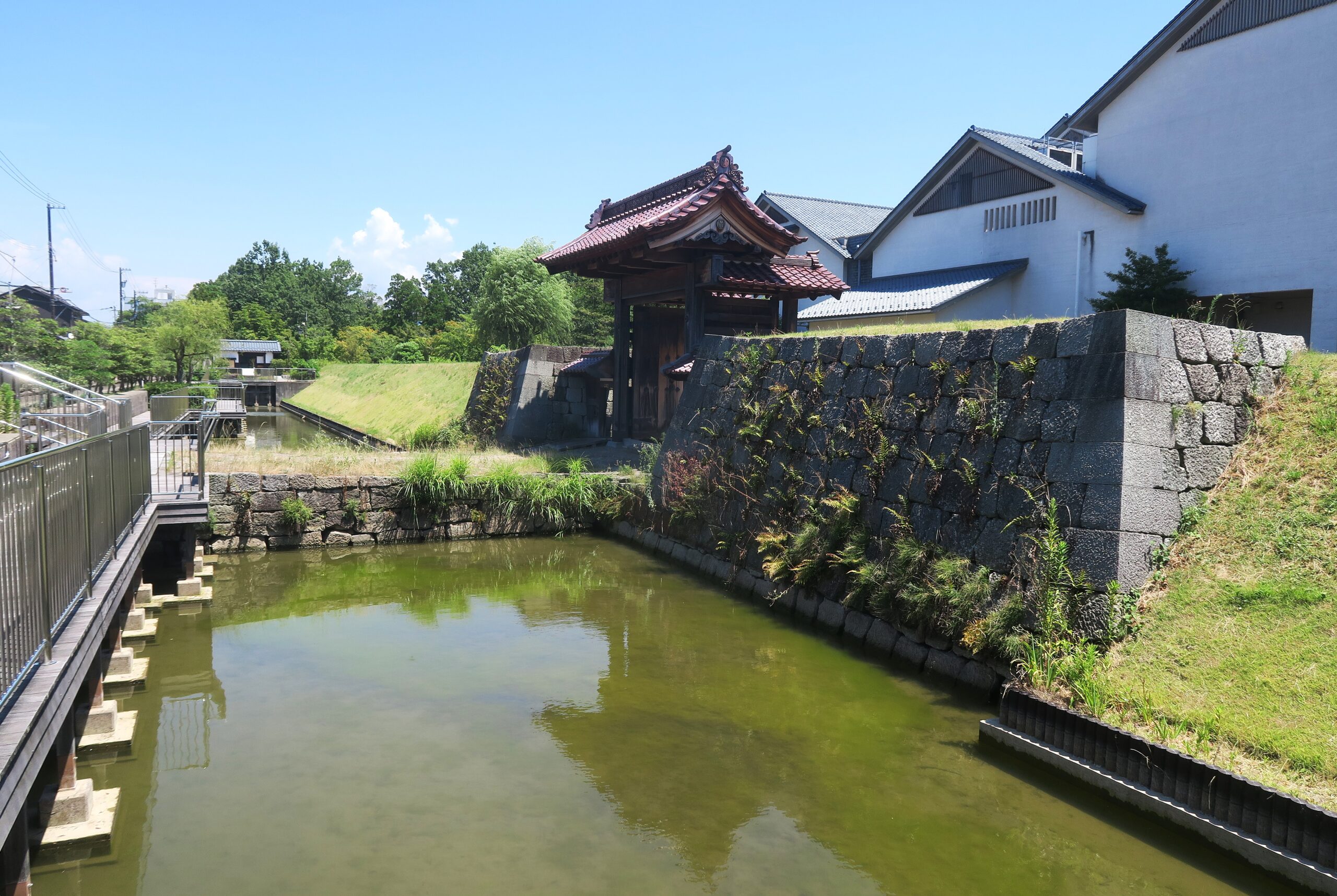 櫓門の屋根に葺かれているのが北の庄城でも見られた笏谷石製の瓦です。城内の石垣も、笏谷石が使用されていて、どこか青緑色の趣ある色合いをしています。