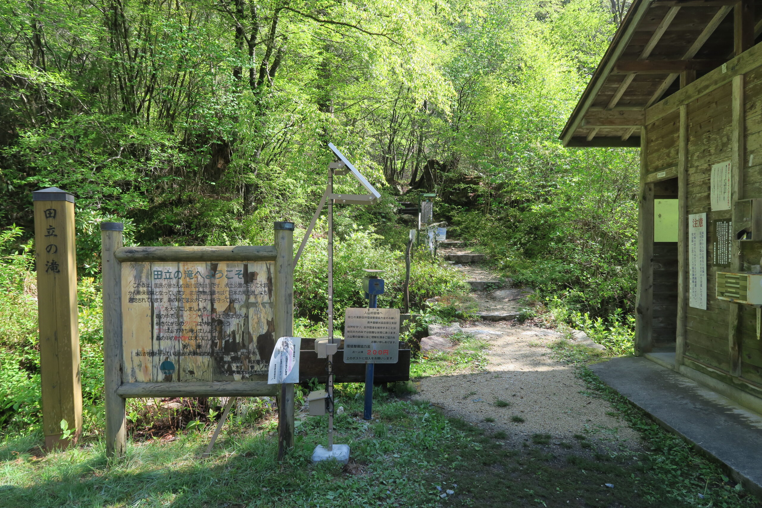 田立の滝へは、国道19号から田立の交差点を曲がり集落の中を縫うように走って行きます。田立オートキャンプ場を過ぎ、さらに車で10分程行った突き当りが粒栗駐車場(無料)。20台程停められ、右手奥の探勝路入口横にはトイレがあります。途中にトイレは最奥の丸淵までありません。また自動販売機もないので、飲料水は事前に用意しておきます。用意万端整えて、設置されている熊よけの鐘を鳴らして出発します。あと、忘れないように環境整備協力金200円を置いていきます。