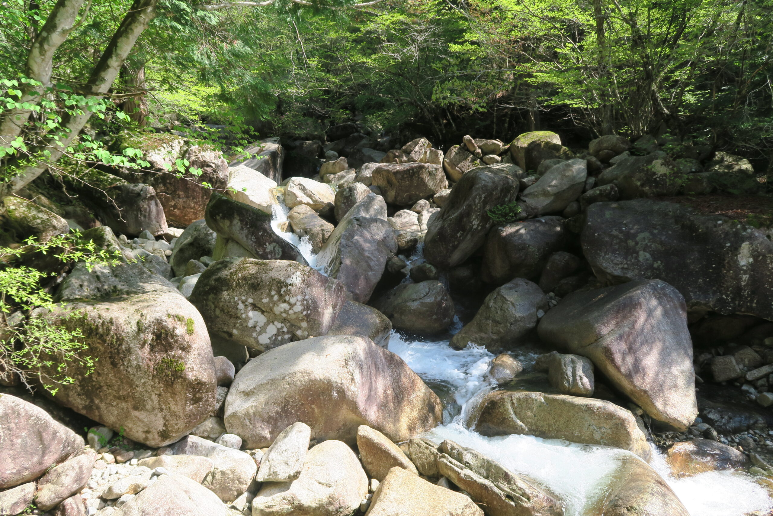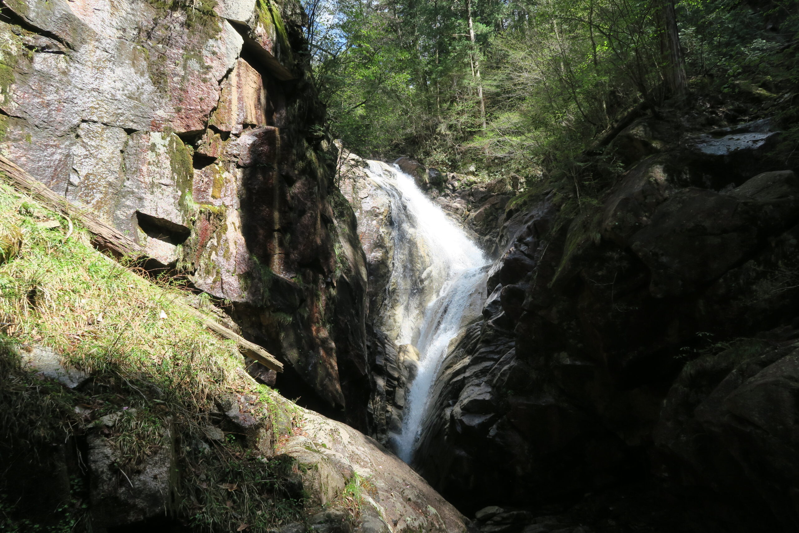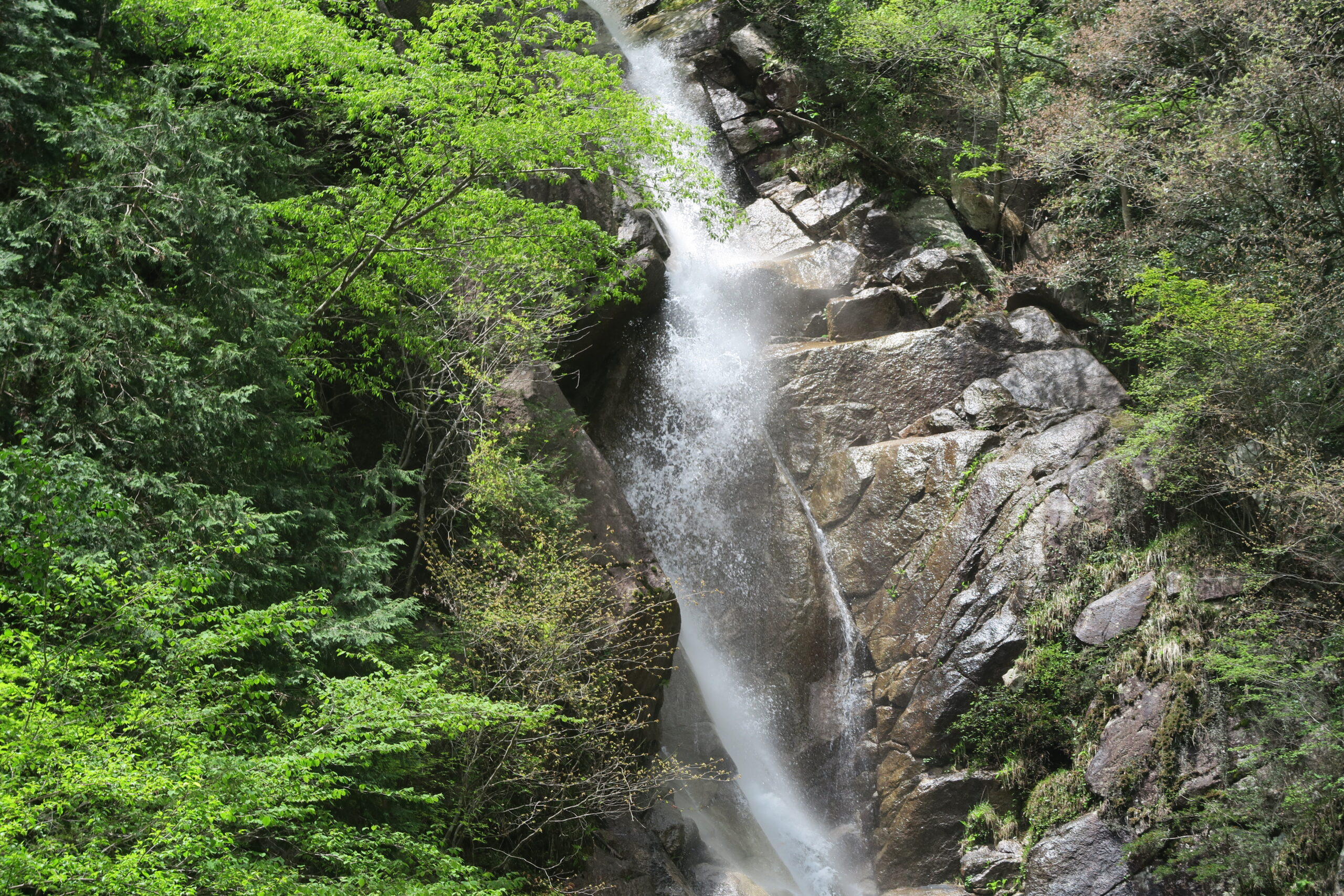 標高1200mほどの場所に突然落差40m、幅13mの「天河滝」の一枚岩が現れます。自然のダムを思わせる切立った巨大な花崗岩のてっぺんから大滝川が崩れるように豪快に流れ落ちる様はまさに圧巻です。今はこの名勝の地に誰でも入れますが、明治後期まで里人たちがこの天河滝を神聖視し、雨乞いの神事を奉る目的以外は立ち入りが禁じられていたというのも頷けます。この辺りは平らな場所も多くゆったりと撮影できます。