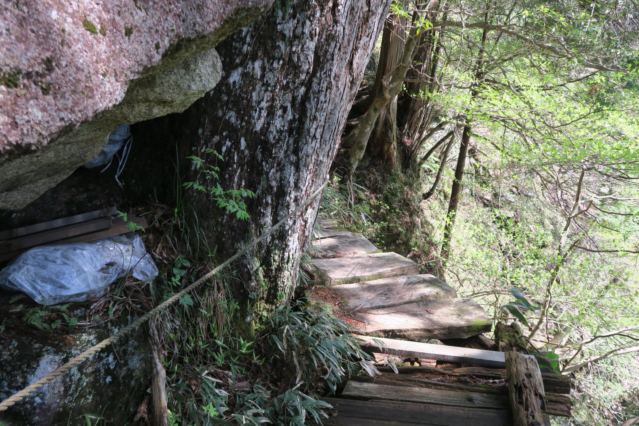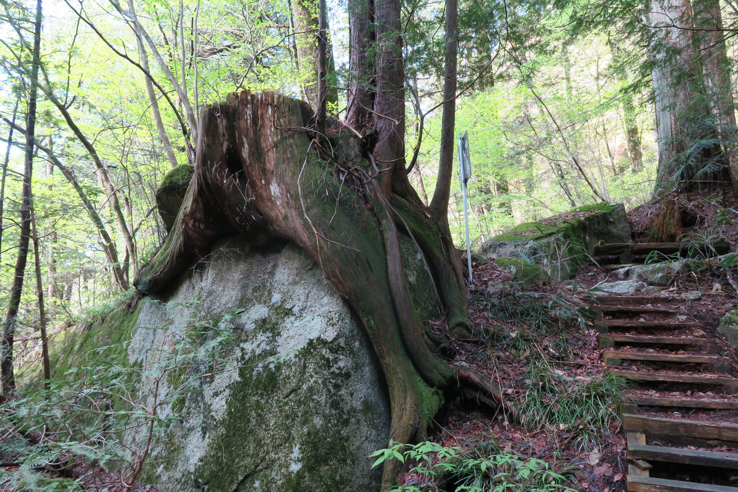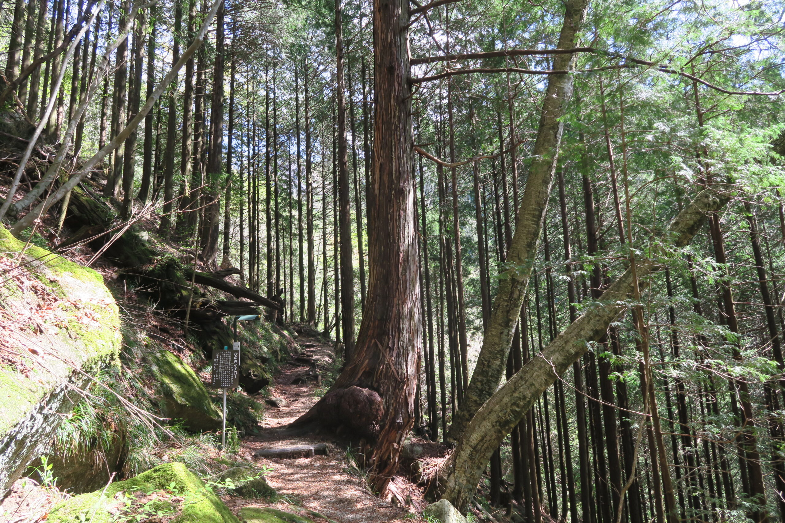 さらに360mで写真の「ひのきイチロー」が現れます。木曽地域に自生する天然のひのきを木曽ヒノキと呼び、登山道脇の触れるものの中で一番太く樹齢400年前後と推定されています。