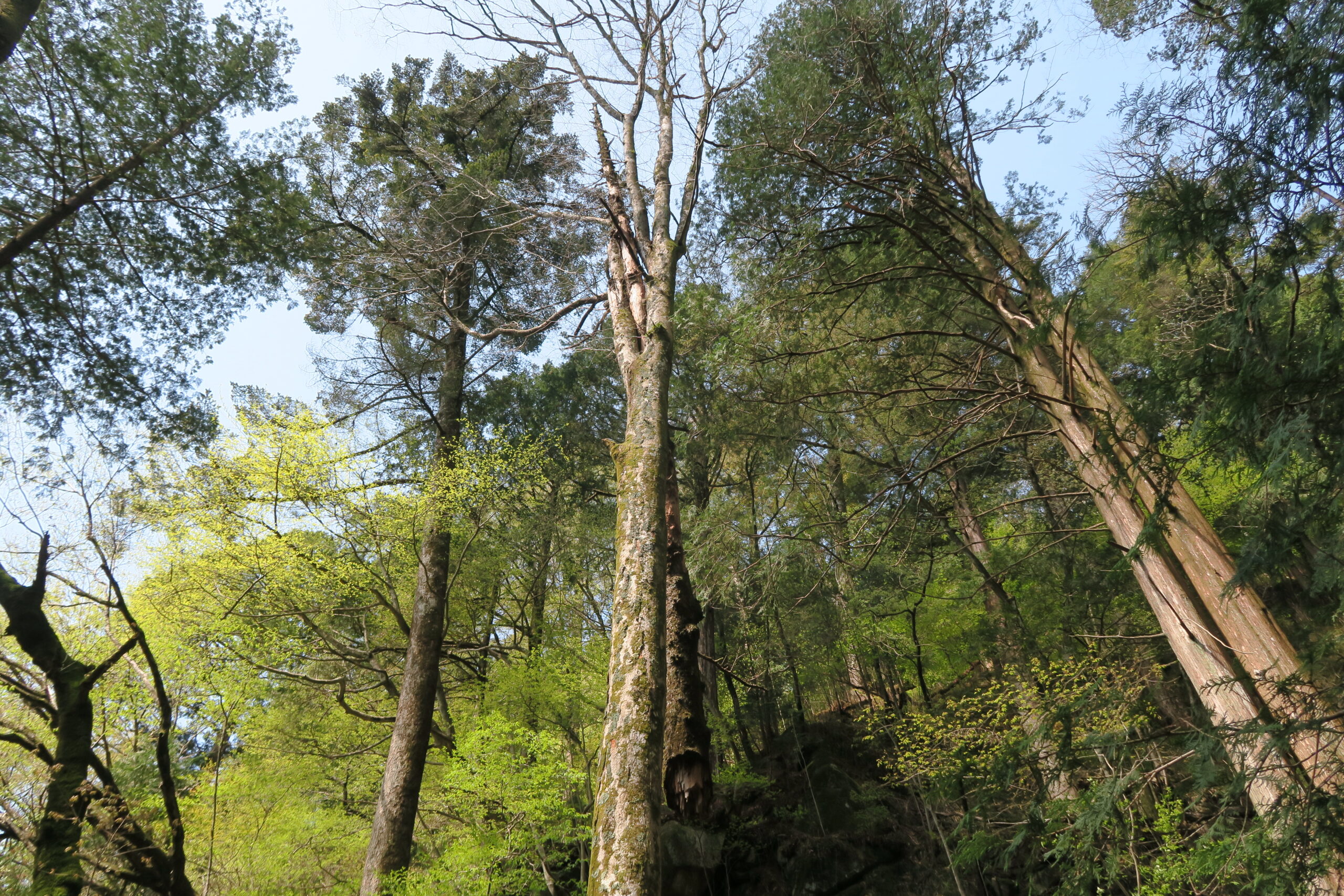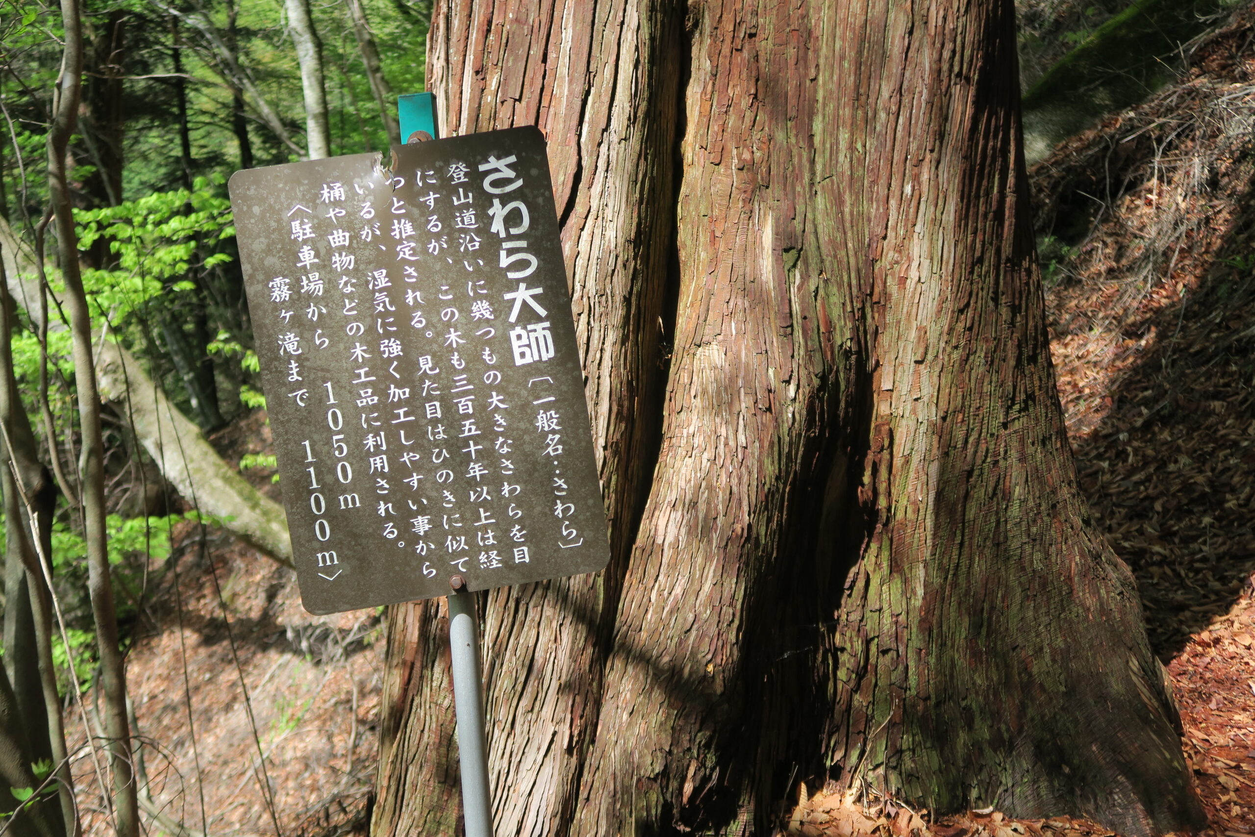 さらに160m歩くと登山道沿いに二本目の「さわら大師」が直立しています。樹齢350年以上と推定されるサワラの大木です。
