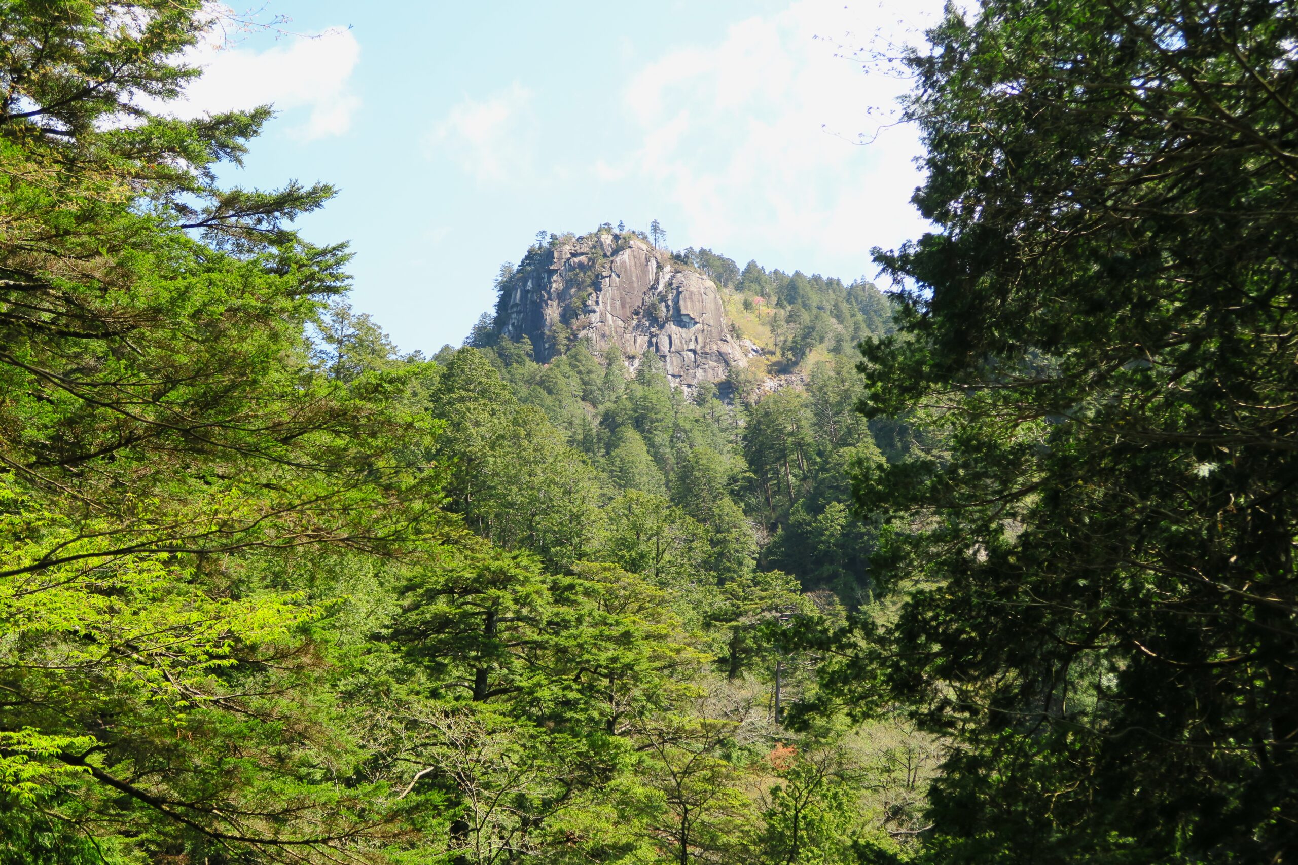 「まきチャン」と「つがえもん」の途中、駐車場から約1.5kmほどのところで、木々のすき間からポッカリと顔をのぞかせる断崖絶壁の不動岩を眺めることができます。ベンチもあり、ちょっと小休止できます。不動岩上の展望台からは、越百山、恵那山などの山並みや中津川市内方面が眺望できますが、登山道は狭く急峻なので時間のある方や健脚向きです。