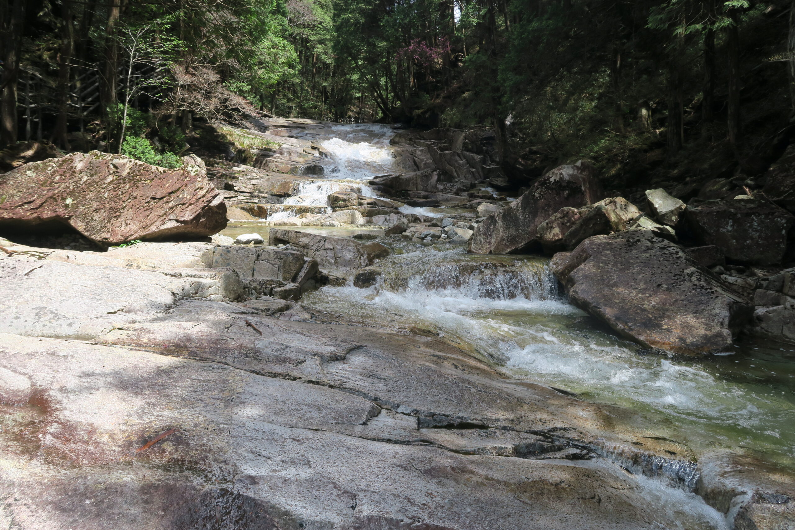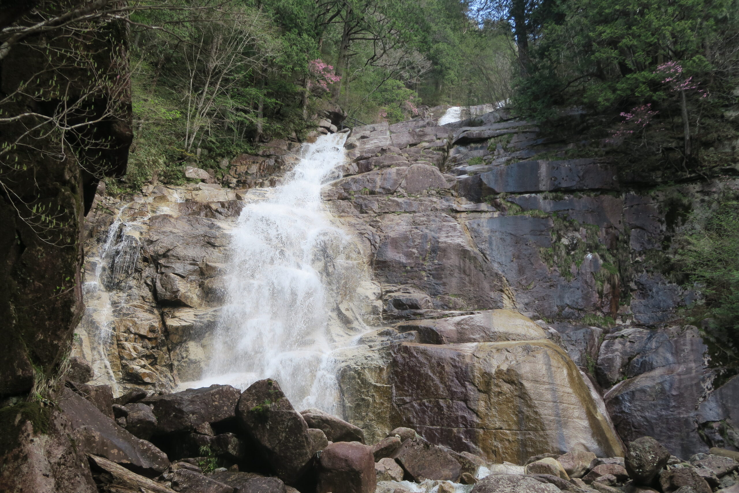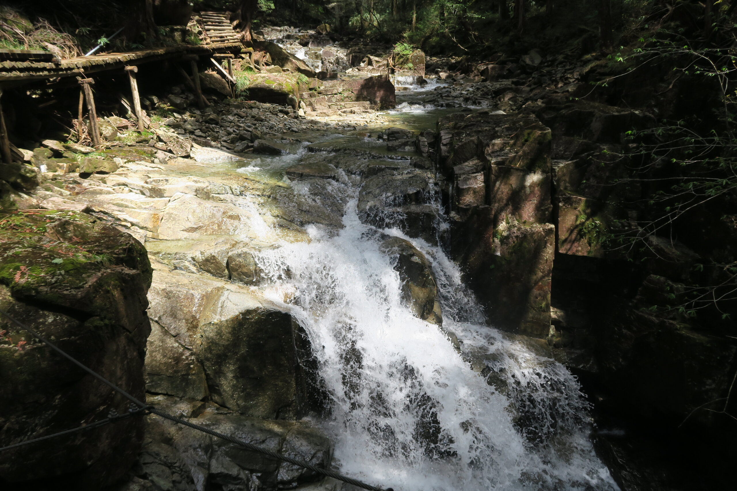 駐車場の標高が約800m、遊歩道を上流に向かって歩いていくのですが、最初のらせん滝まで約50分、標高1200mの主瀑「天河滝」までもう20分、さらに最奥の丸淵まで40分の道のりになります。その間、急な山道が続いたり、ハシゴ階段があったりするので、それなりの装備でのぞみたいものです。