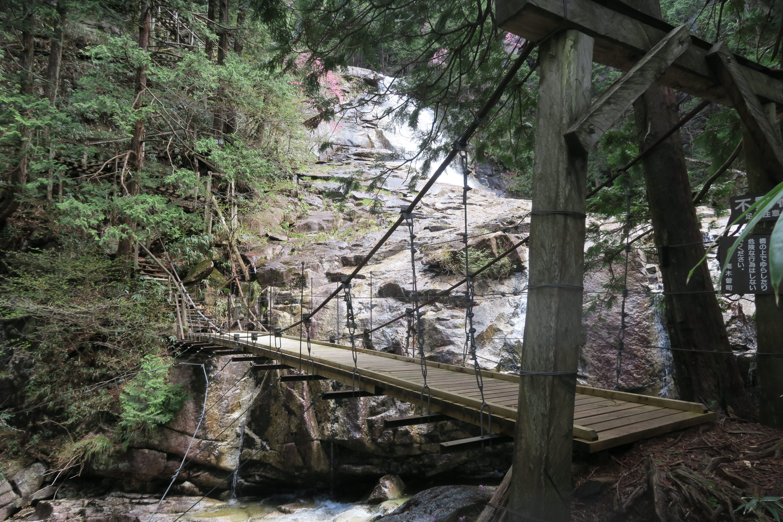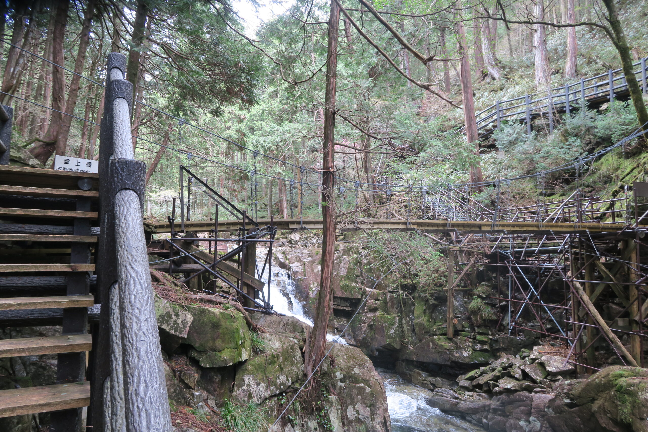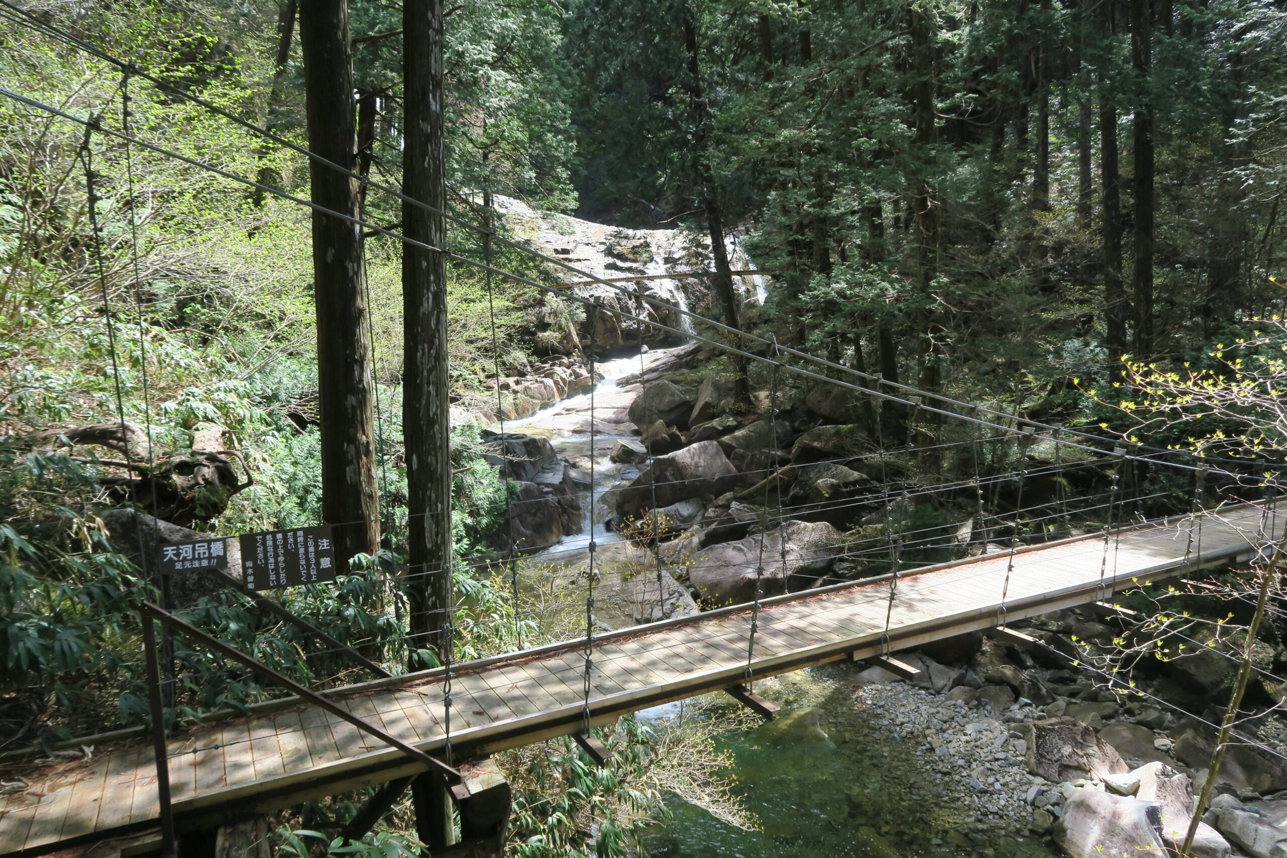 さらに「不動滝」を目指して280m上っていきます。階段も整備され、天河滝の絶壁を横から見ながら上っていくと、天河吊橋に出ます。橋の上から天河滝の天辺を眺めることができます。