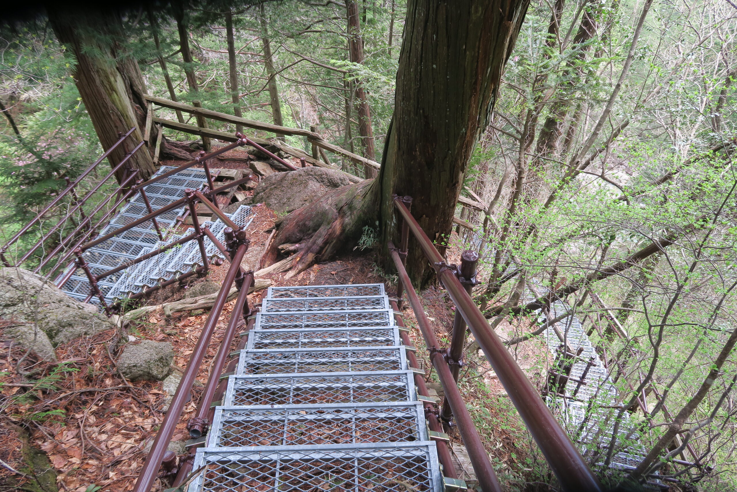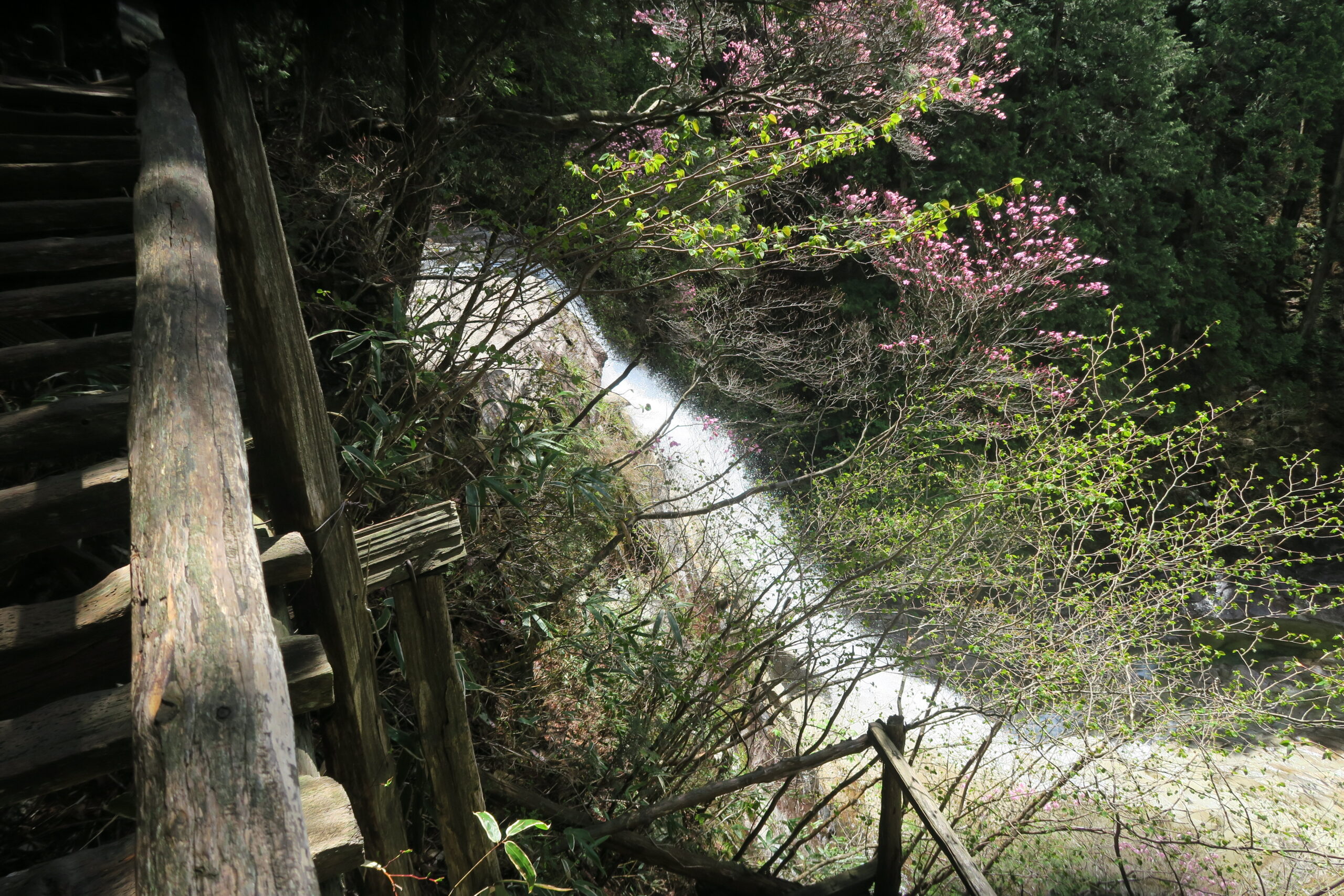千鳥棧橋と名付けられたこの九十九折の階段は、壁面にへばりつくように設けられています。その木組みの階段の幅は狭く、隙間があるので、足元に気を付けながら歩を進めます。最上部では不動滝の真上(滝口)から下をのぞくこともできます。スリル満点ですが、やっぱり滝は全体を見たほうがいいです。