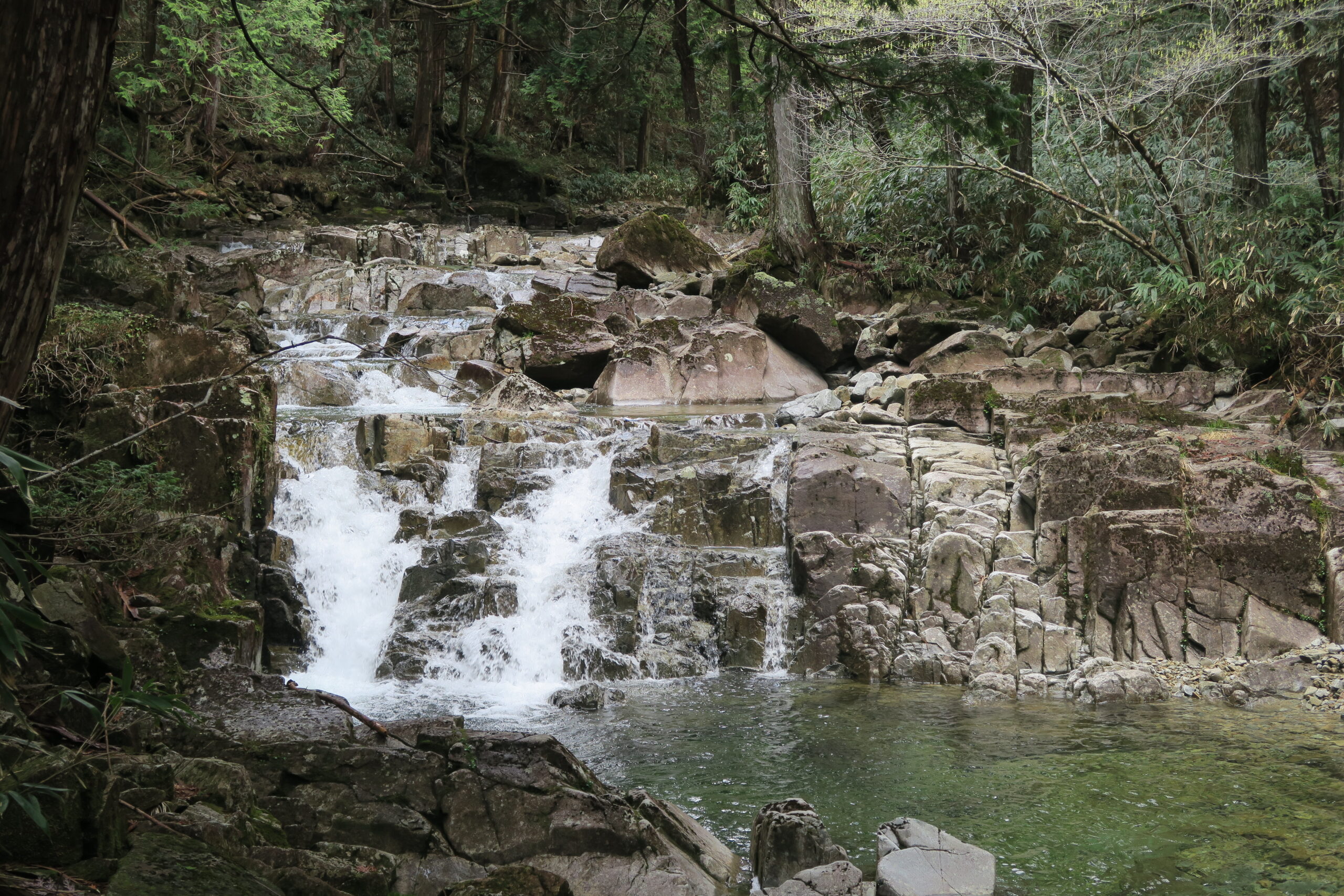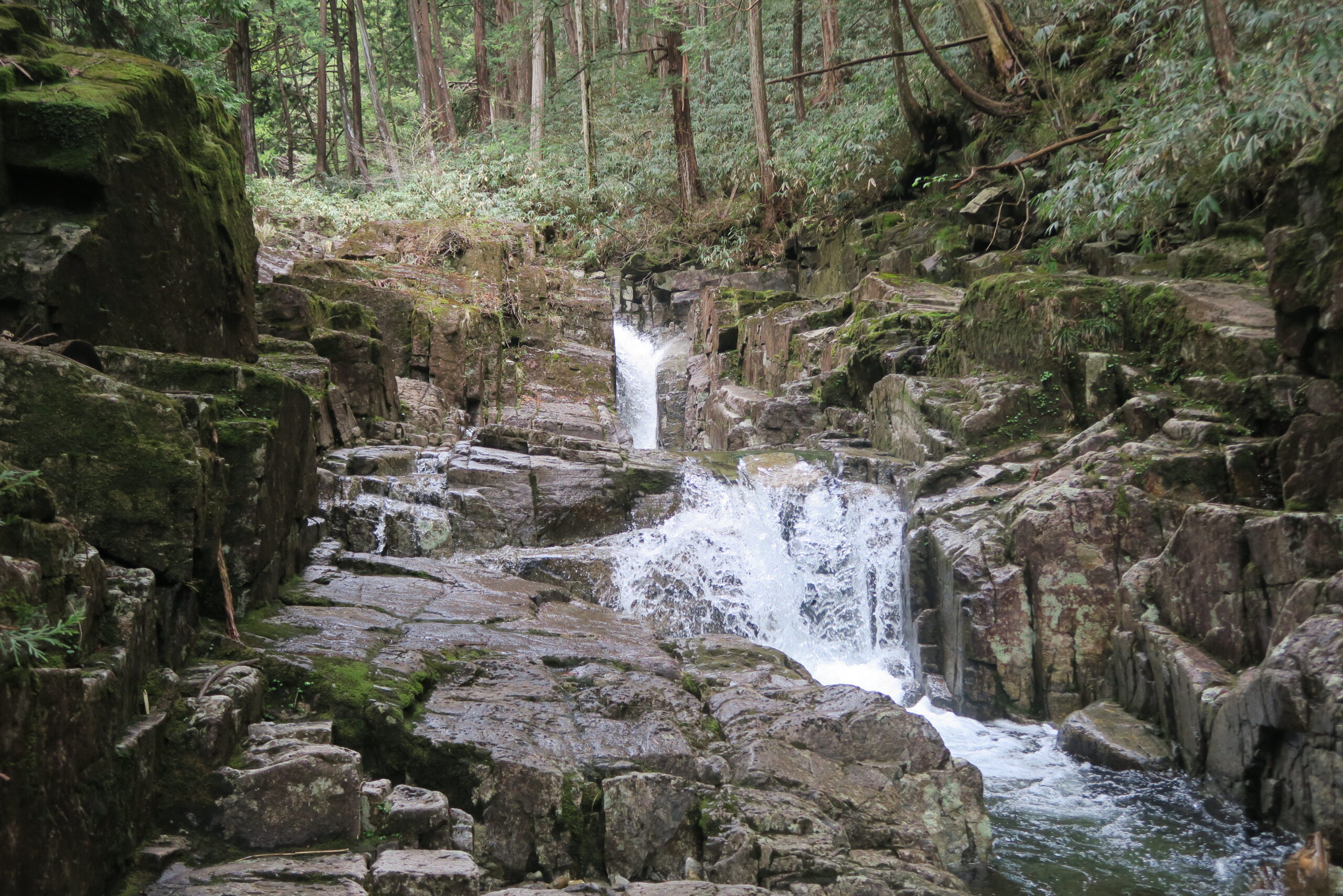 もう少し滝めぐりがしたいので直進し、上流に向かいます。「丸渕」までの間に、雲上橋の真下に落差5mほどの比較的小さな「鶴翼滝