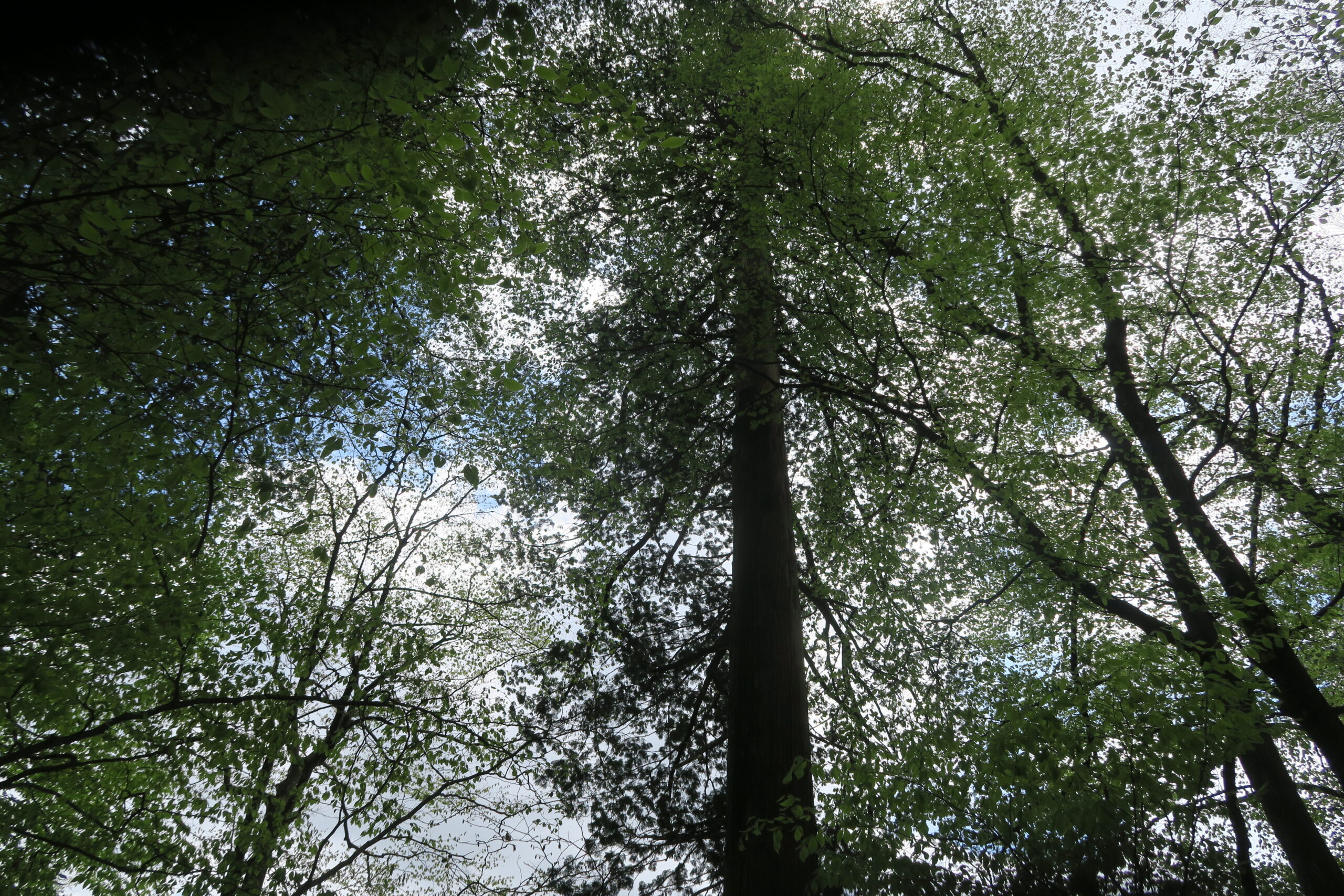ここからしばらくユニークな名前を付けられた巨木を楽しみに森林浴をしながら遊歩道を歩いていきます。駐車場から680m、周囲にモミとツガの大木を見ることができます。葉の先が二つに分かれ、とがっているほうがモミで、付けられた名前が「もみたろう」。まっすぐに天に向かって伸びています。