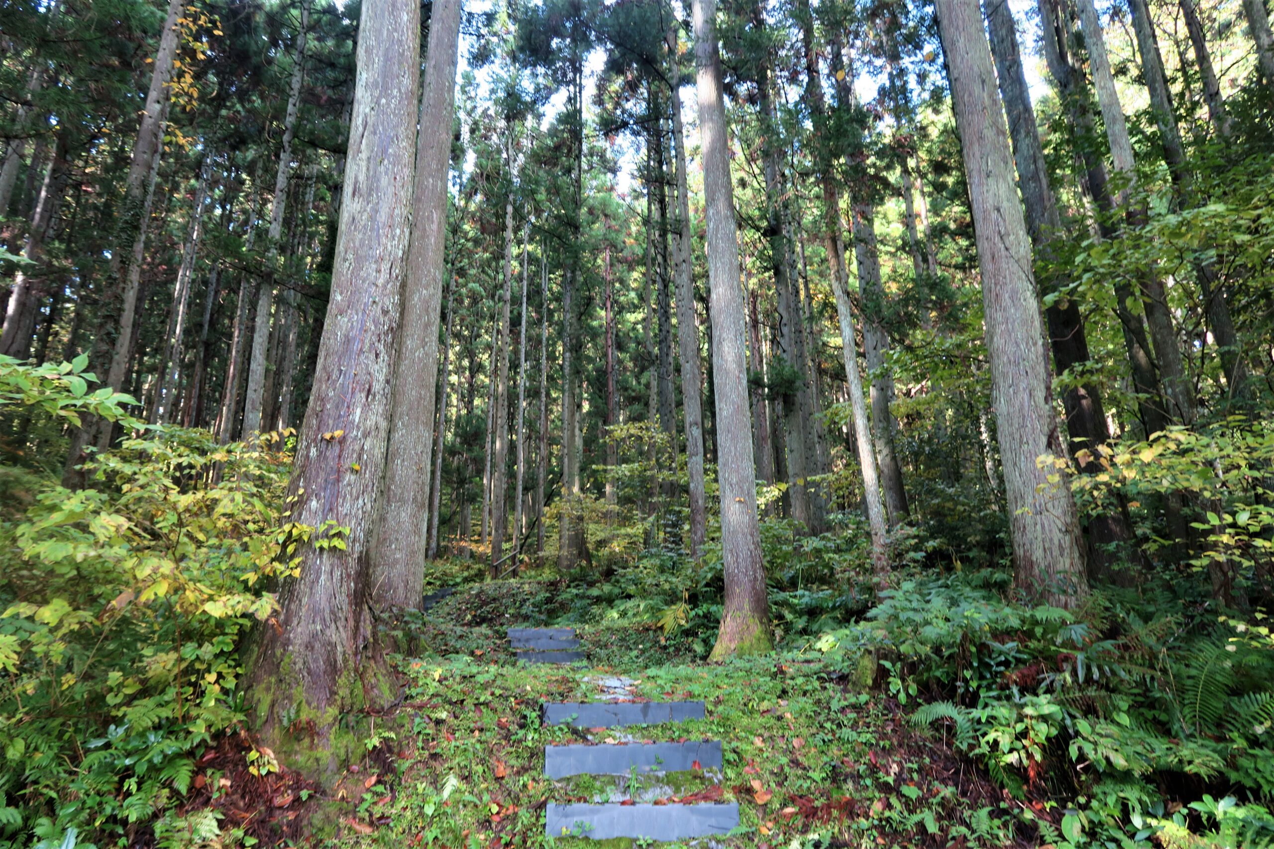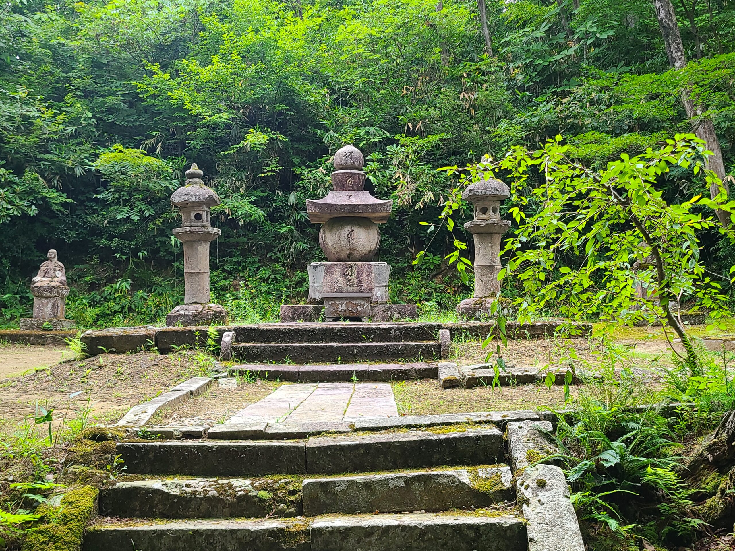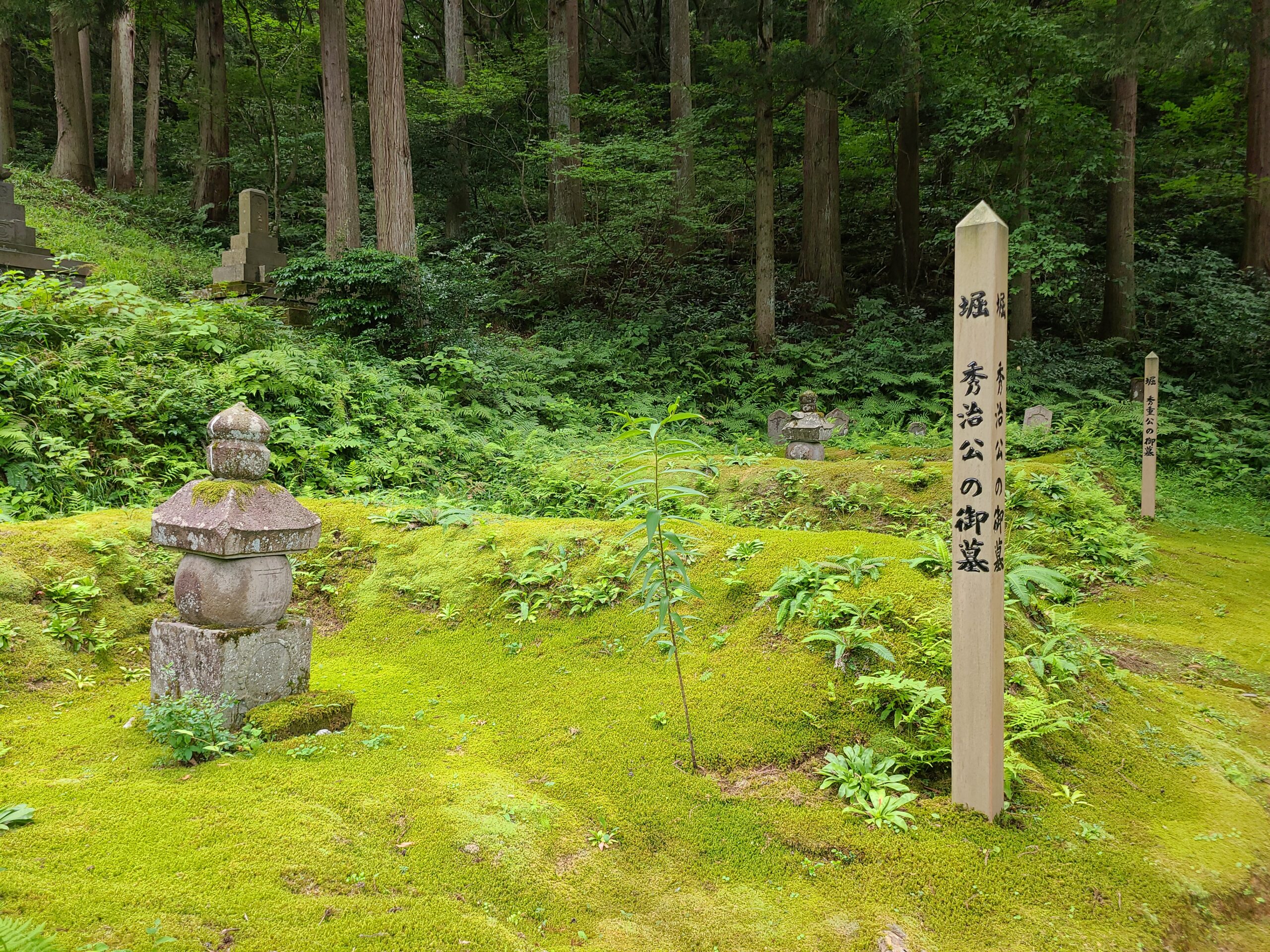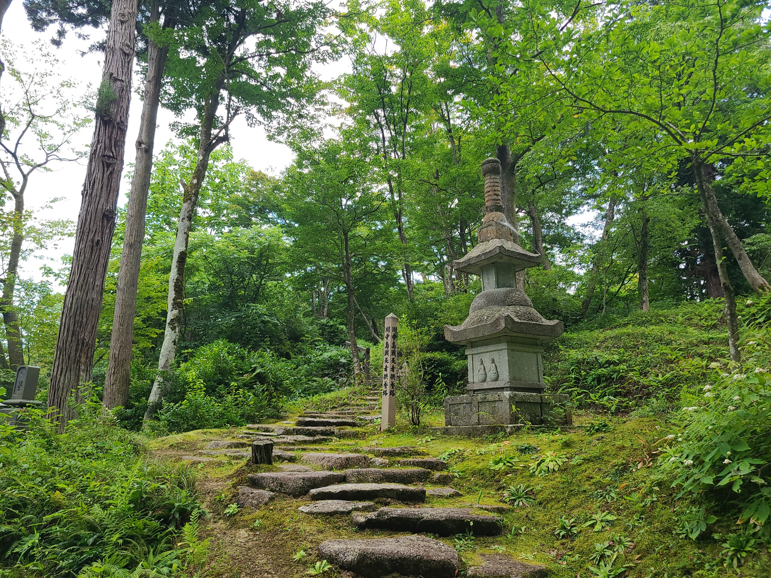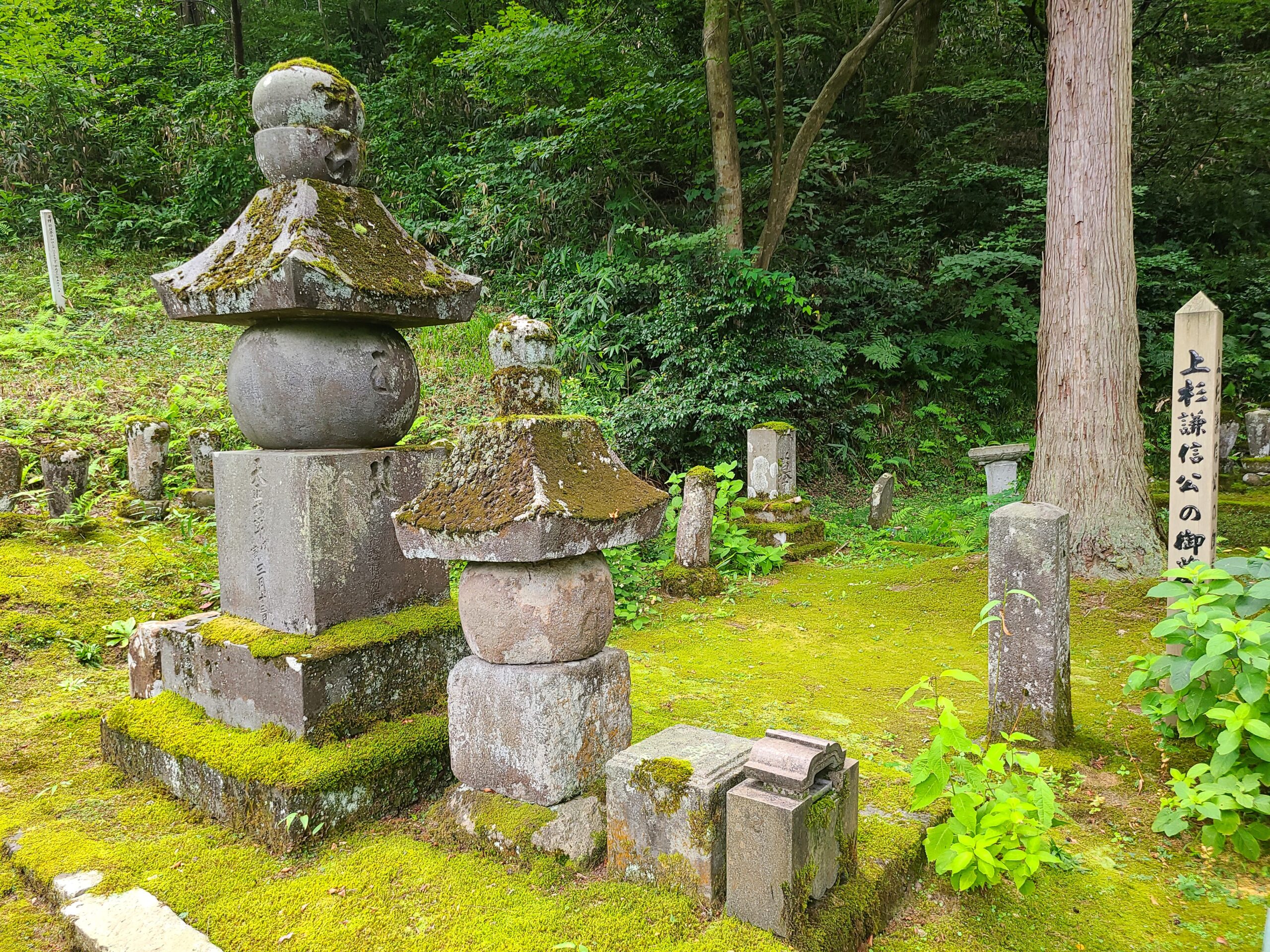本堂左手から謙信の墓へ向かいます。墓へは石段を上がっていくのですが、その苔むした自然の石を配した石段が美しく、墓の前で思わず立ち止まってしまいます。墓所入口の近いところから堀家の墓(手前越後春日山30万石堀秀治、奥祖父堀秀重、奥に父堀秀政)