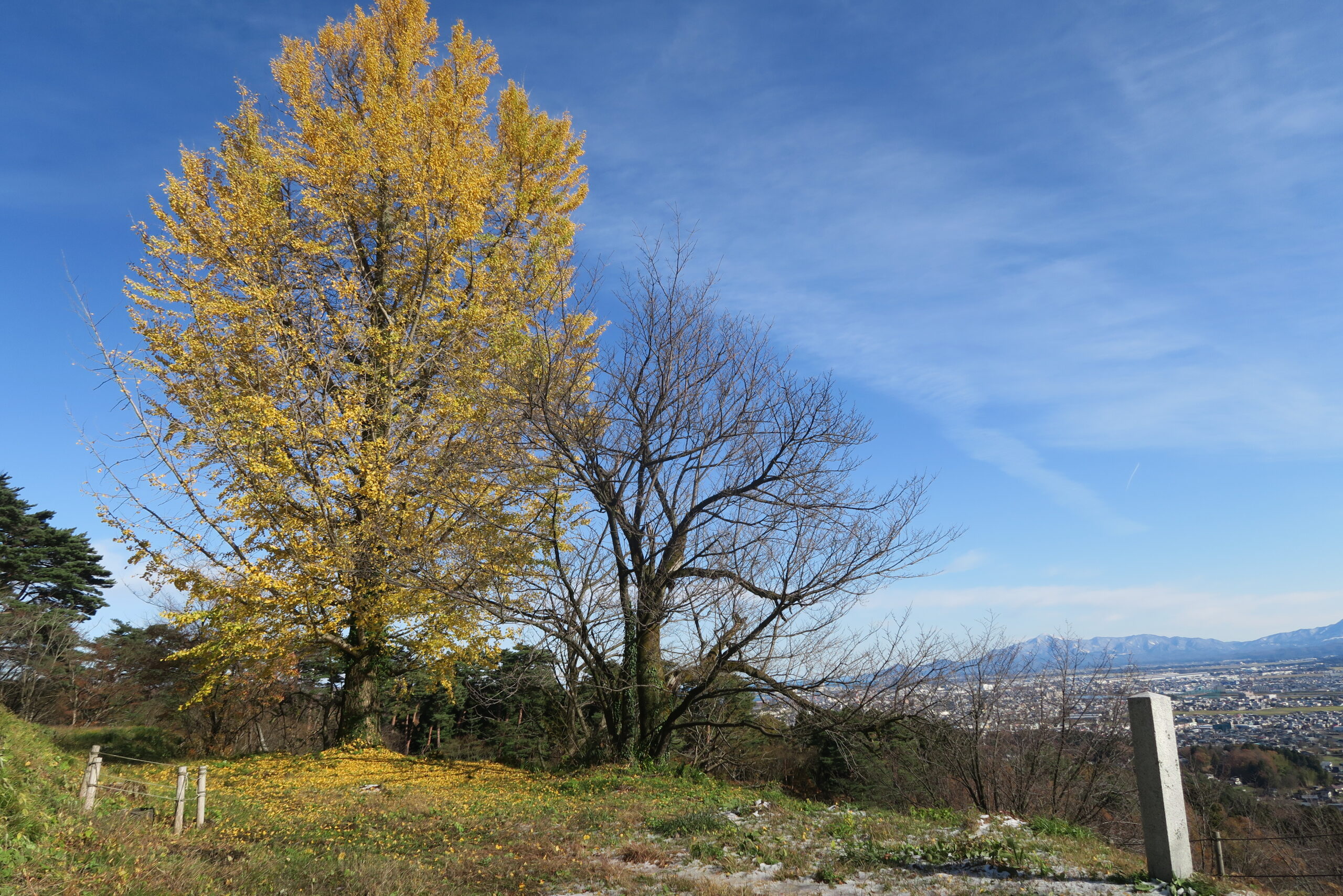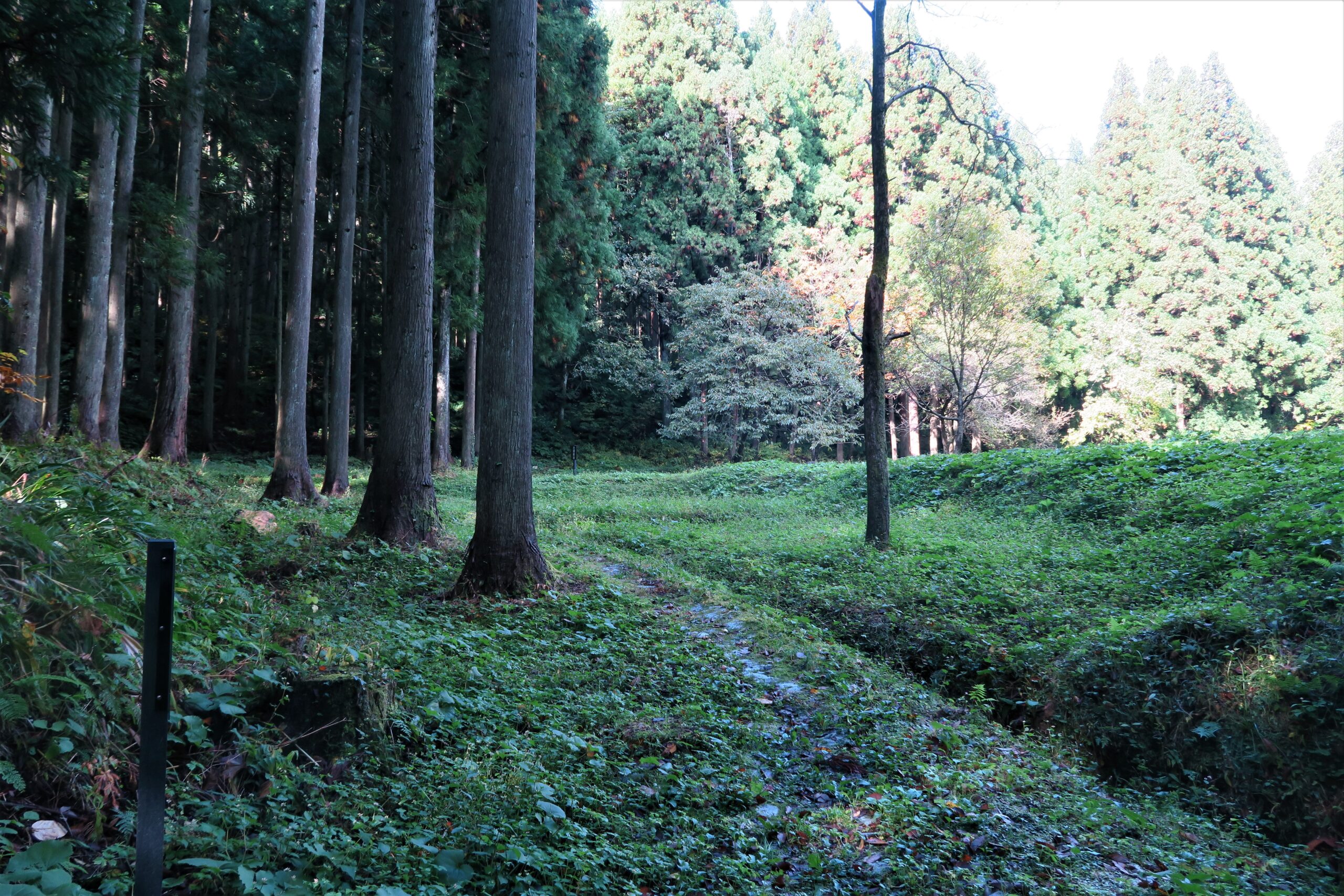 途中本丸より一段低い「二の丸」へ。本丸の直下にあって、本丸を帯状に囲っている様子は、本丸の警護として造作されたことを示しています。ここは堀切により独立した郭で、台所や笹井戸の遺構が残されています。一本のイチョウの木があり、11月下旬から12月上旬には黄金色に輝きます。