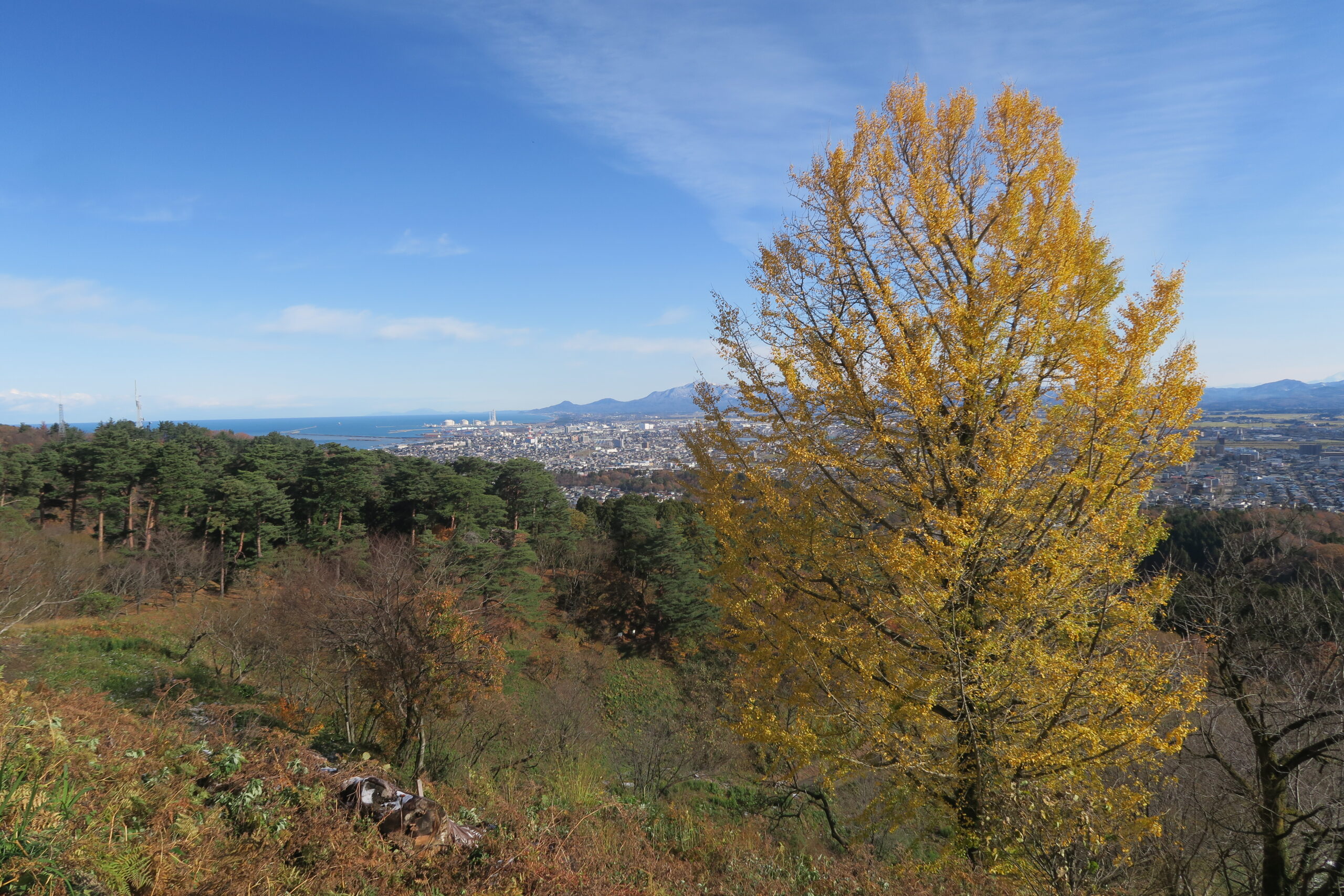 本丸のすぐ下にある二の丸越しに、謙信公も当時眺めていたであろう、頚城平野と直江津市街、北東方面には日本海が見え、海のそばに巨大な火力発電所も目にとまります。日本海から米山(越後富士)、尾神岳、黒姫山などの稜線の大パノラマが楽しめます。