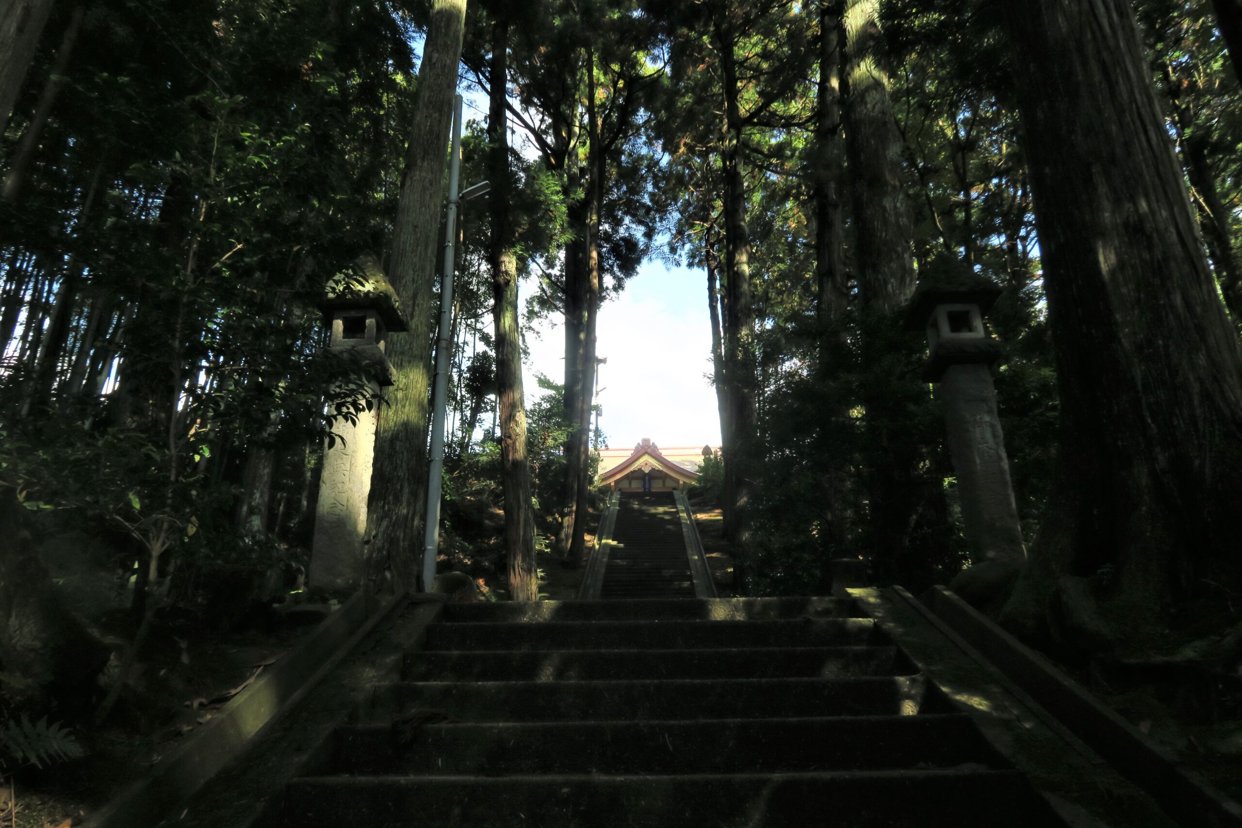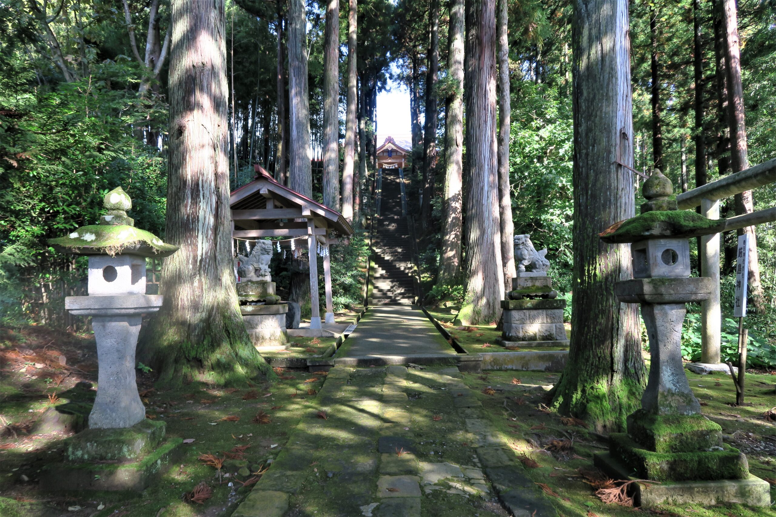 天を突くように伸びる杉木立の参道と急勾配の石段が印象的で、境内に立つ苔むした春日灯篭は江戸時代の作といわれます。
