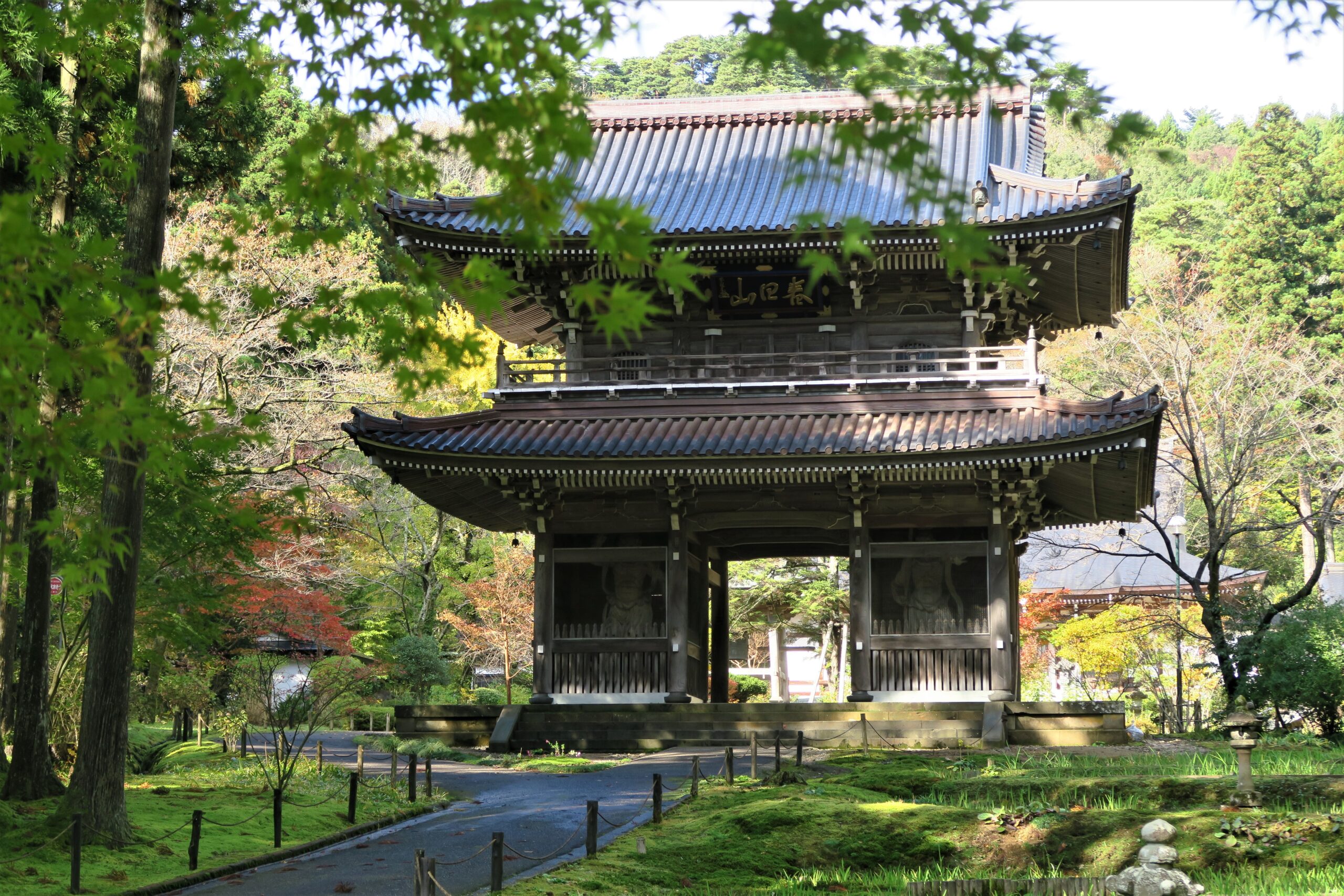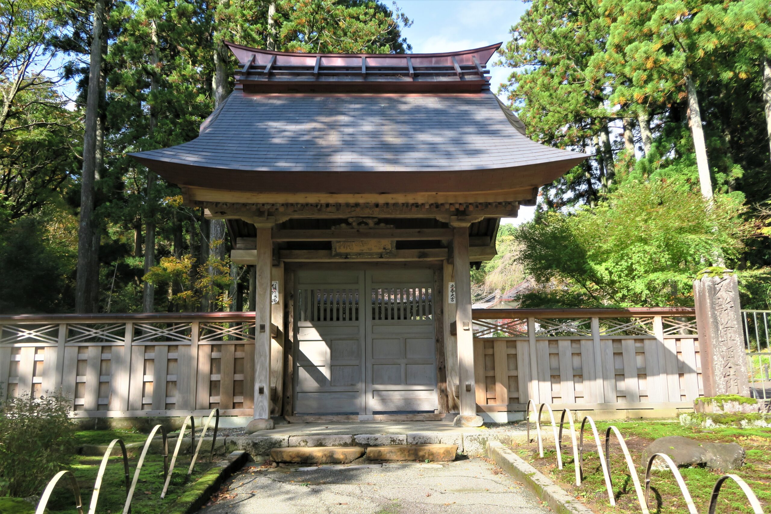 上杉謙信公寄進の山門は江戸末期の地震によって焼失しましたが、鎌倉時代の様式を取り入れた大正14年(1925)建立の名作です。掲げられている謙信が揮毫した「春日山」「第一義」の扁額は、かつて掲げられていた額を複製したもので、宝物館で実物が見られます。