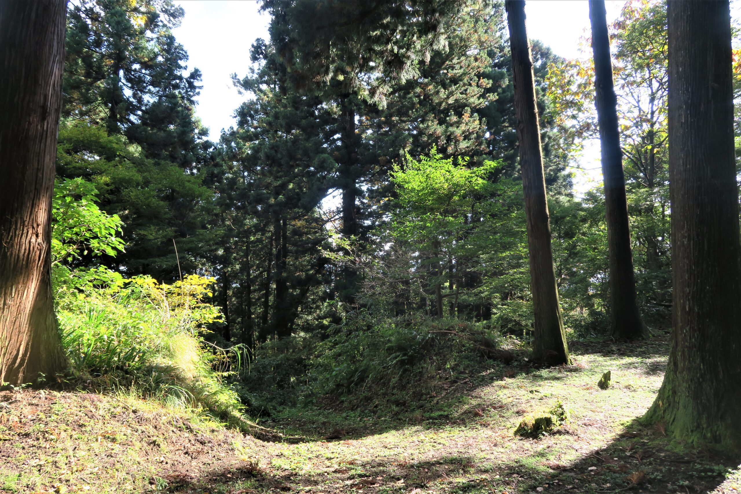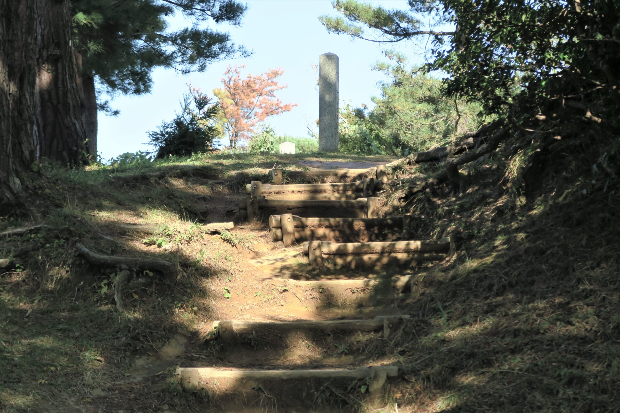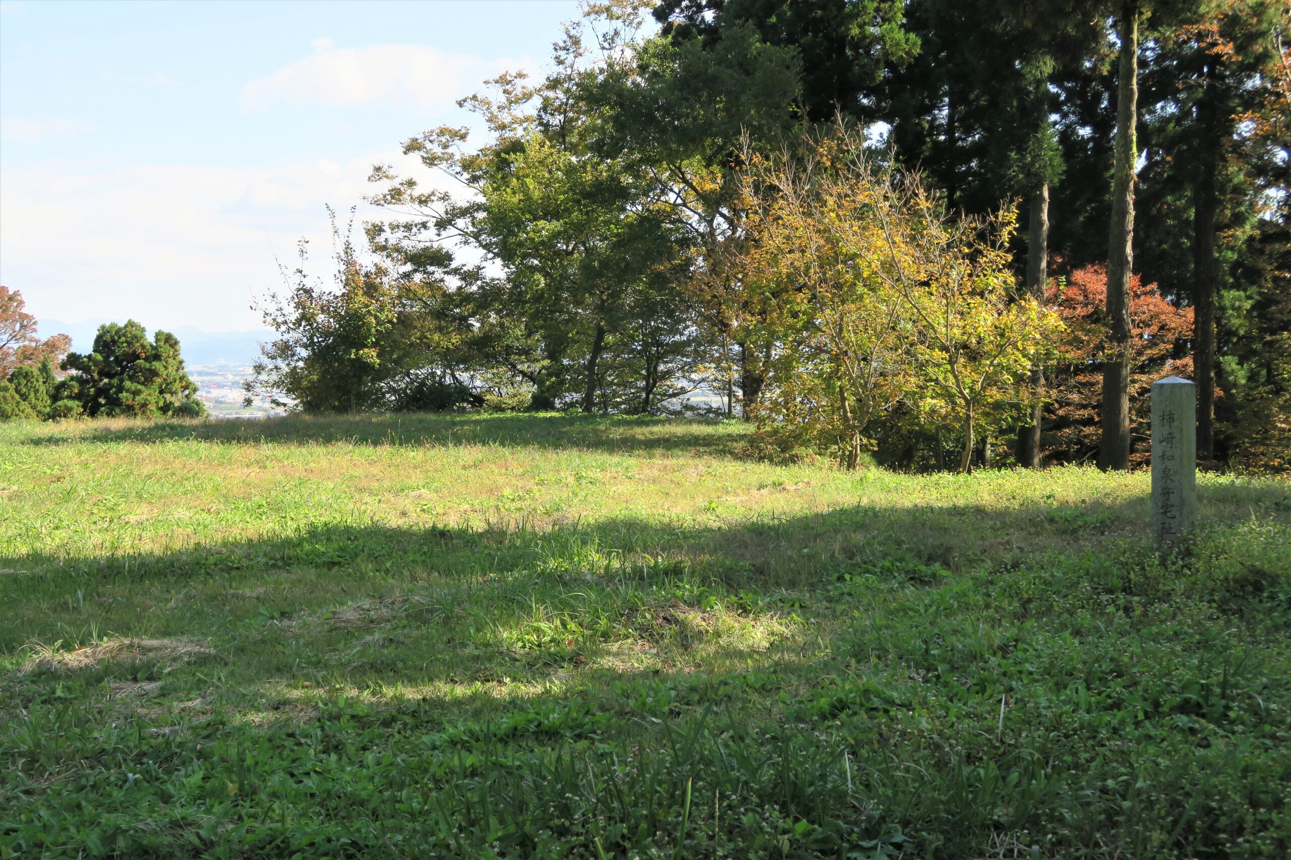 さらに歩くこと約10分、標高182mの山頂付近に築かれた本丸、「天守台跡」に到着です。頂上は堀切で南北に分断されていて、北側が本丸、南側は天守台跡と呼ばれています。日本海を見るなら本丸のほうがよく見えます。