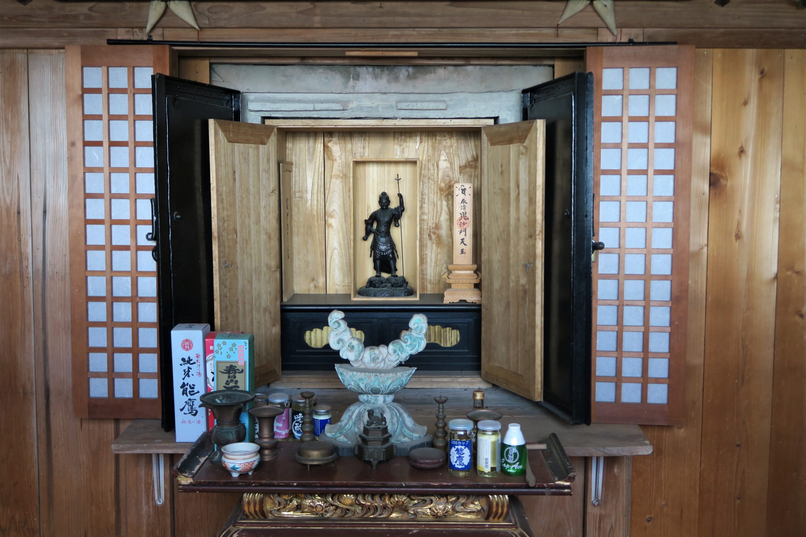 この御堂には謙信が信仰した毘沙門天像(青銅製、約50cm)が安置されています。尊像は嘉永2年(1849)の火災で被害を受け、昭和3年(1928)高村光雲によって修理されました。
