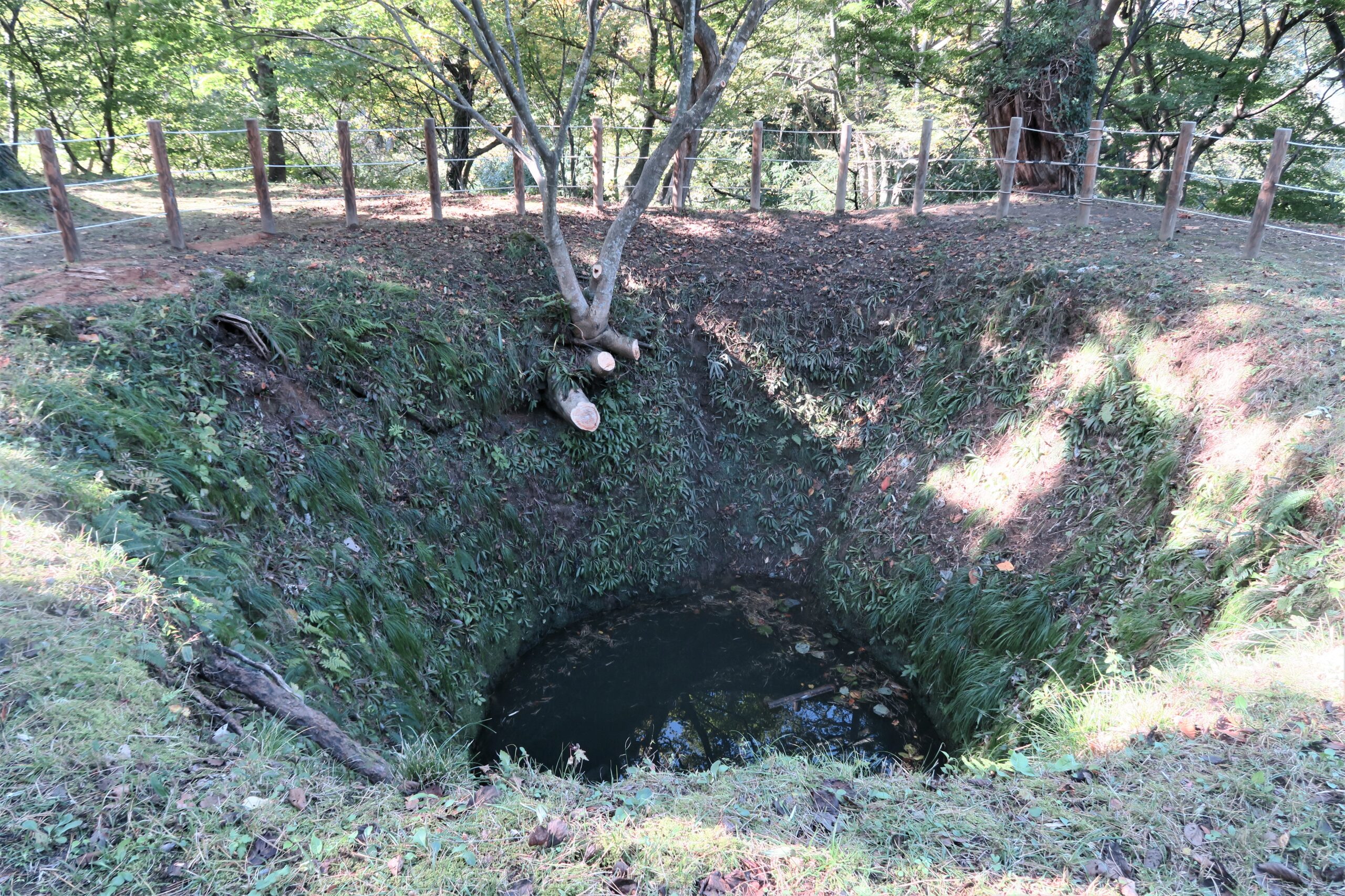 ここからは下りになり西側すぐに「大井戸」があります。山城としては最大級の規模で、標高1000m以上の高所にかかわらず、廃城後400年以上を経ても涸れることなく、現在も満々と水をたたえる不思議な井戸です。