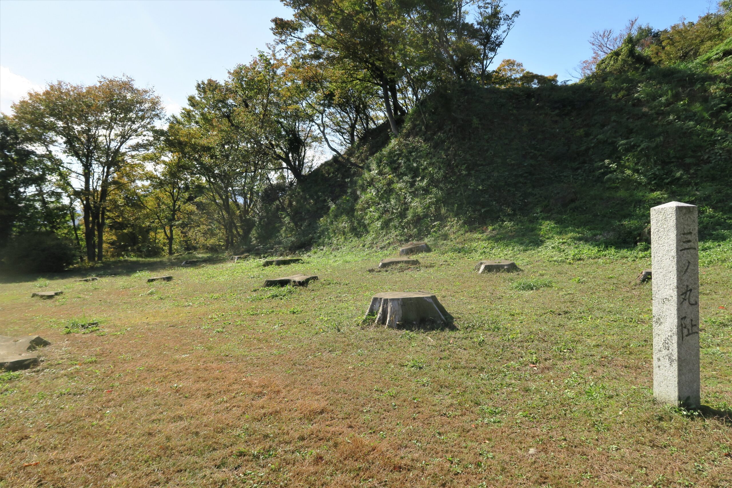 急な階段を下ると「三の丸」です。ここには北条氏康の七男で謙信の養子にとなった上杉三郎景虎の屋敷があった置かれていました。同じく謙信の養子となっていた上杉景勝との後継者争い「御館の乱」の際、景勝軍が山頂部の本丸と金蔵を占拠し、三の丸の景虎屋敷に鉄砲を撃ちおろしたともいいます。ものすごい至近距離の戦闘です。この三の丸と道を挟んで向かい側にある米蔵には最も良好な状態で土塁が残されています。