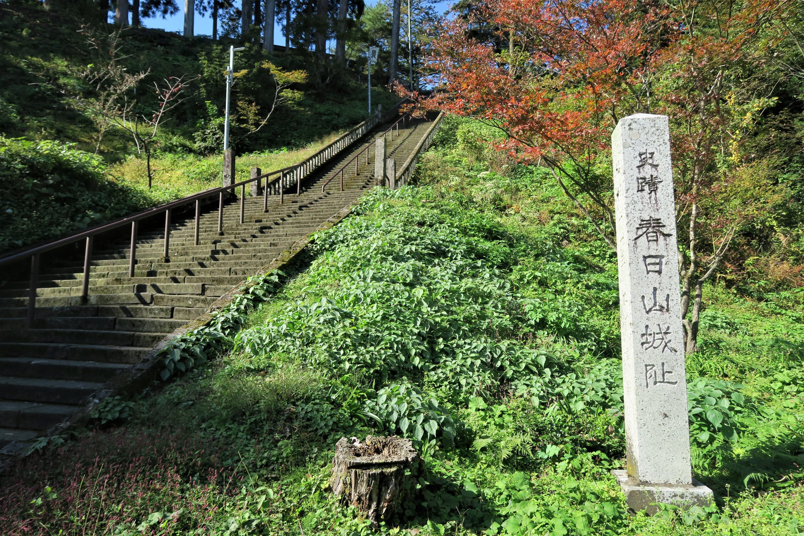 道は春日山神社鳥居前にでれますが、今回は春日神社参道の石段下の駐車場に出ることにしました。急な136段の石段を上ると、春日山神社鳥居前に到着です。
