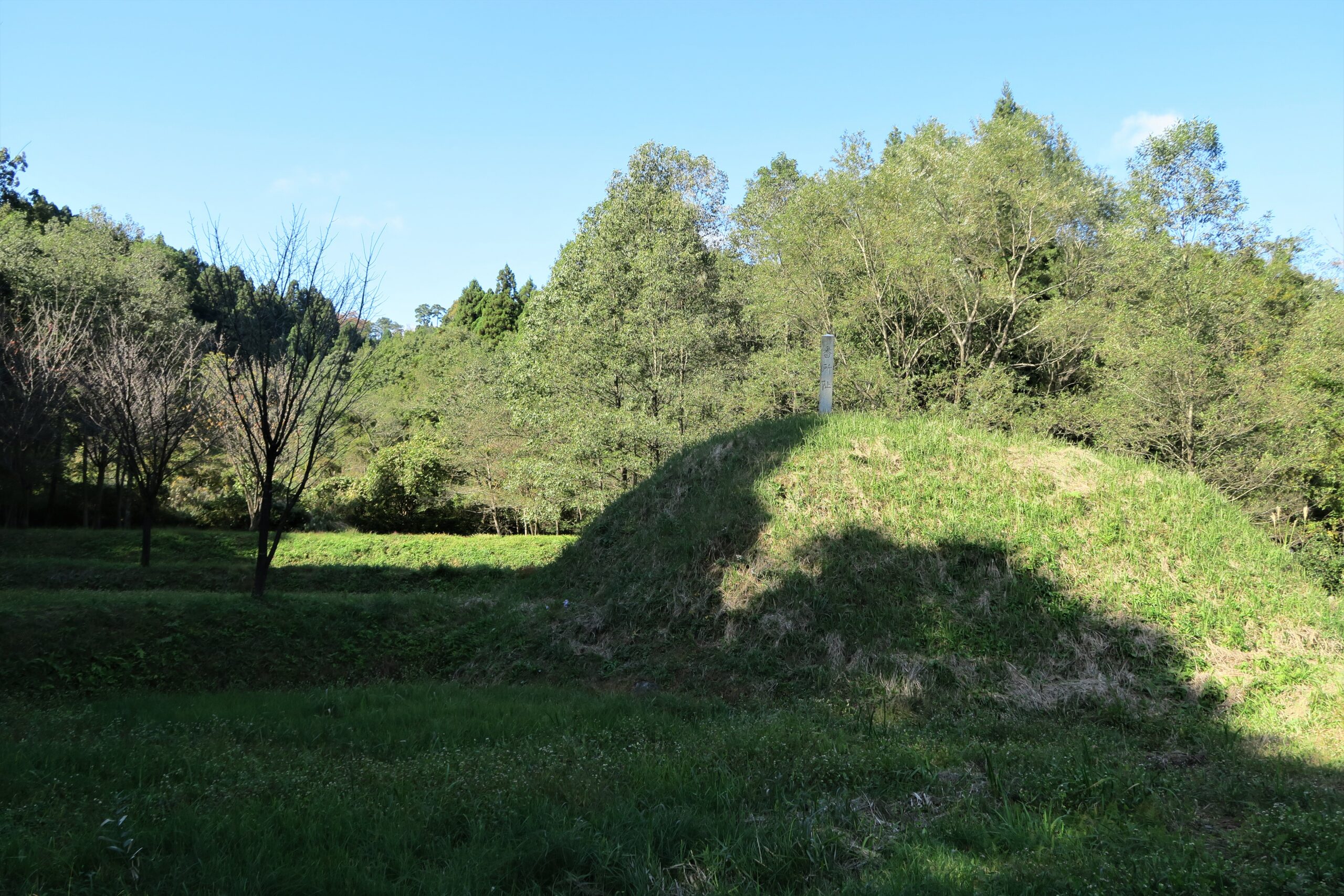 三方が土塁と土手に囲まれ、左に二本、一見道と思われる切通しがあるが、実は空堀のあとといった遺構が残っています。土塁にはシャガが群生しています。5~6月には白い花を咲かせるアヤメによく似たシャガは、すらっとした姿の葉が魅力で冬でも枯れない丈夫な性質をしていますが、根つきが浅く、土塁を登ろうと掴ると滑り落ちてしまうため防御のために植えています。