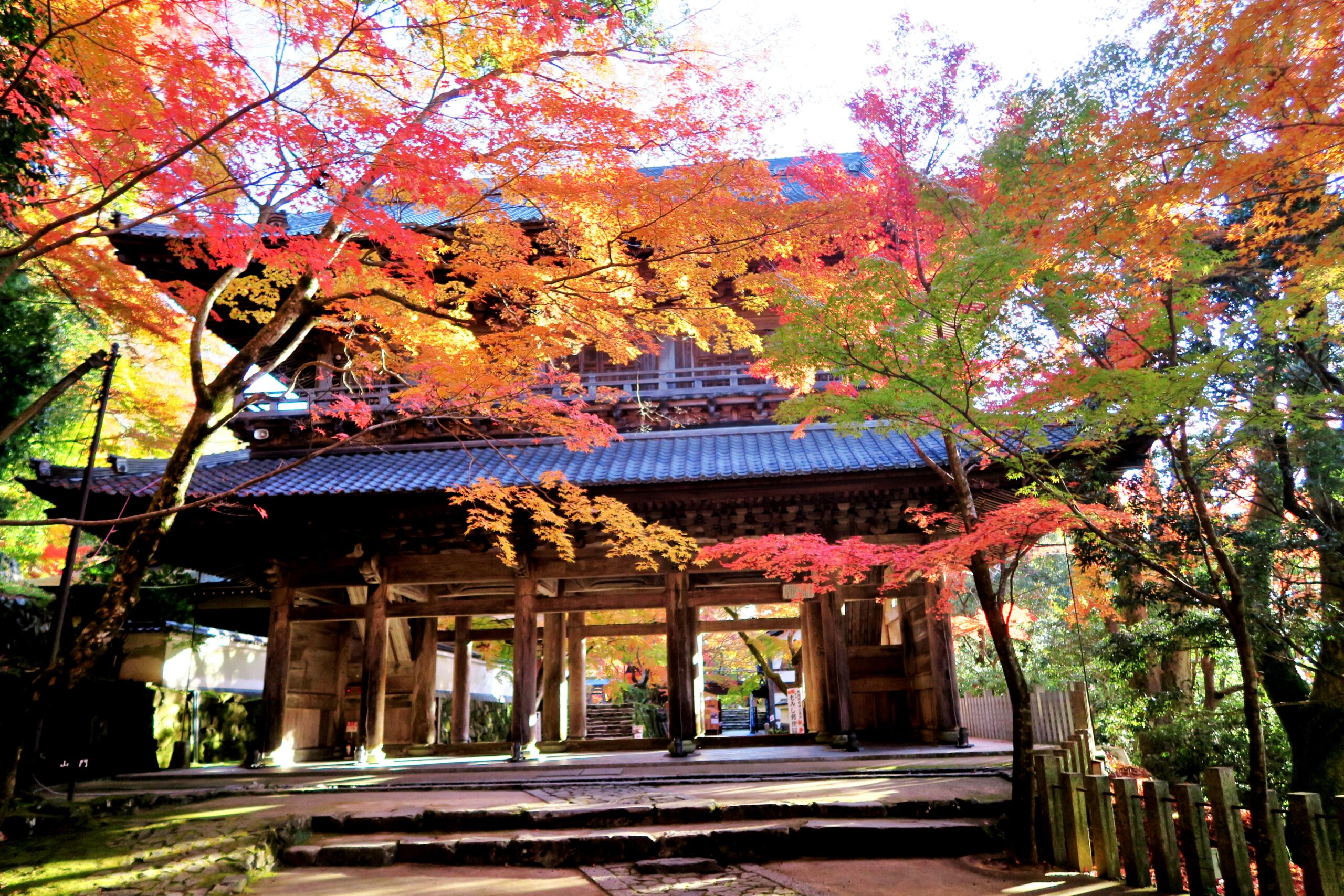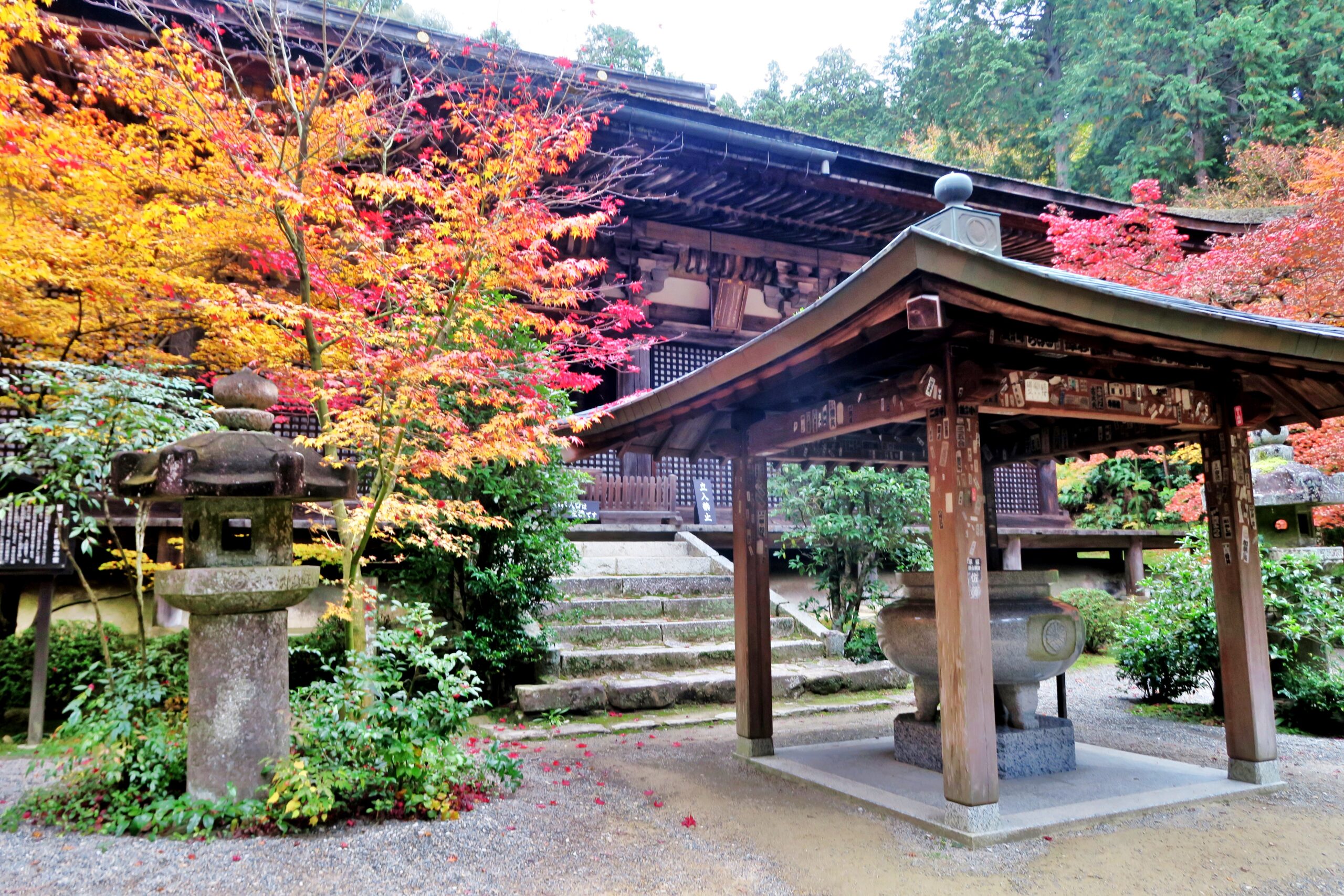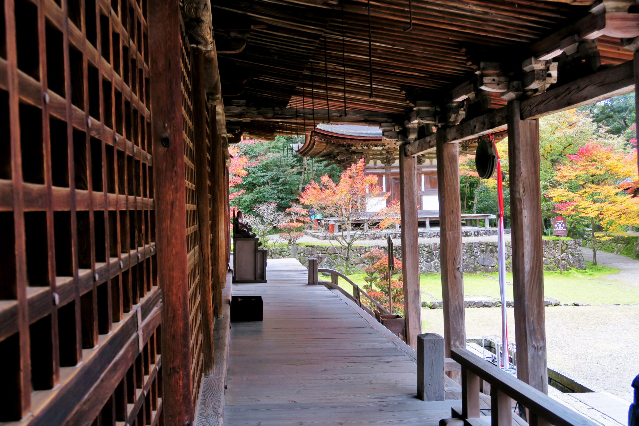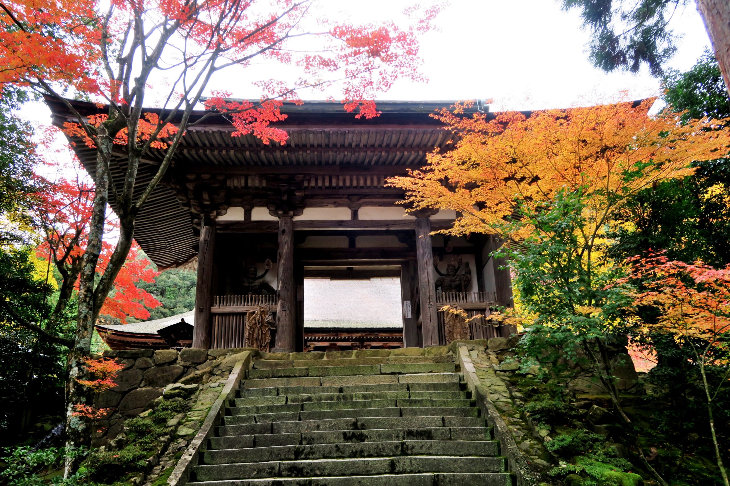 平安時代初期の承和元年(834)三修上人が仁明天皇の勅願により開創され、 「日本100の古寺」の中に選ばれた天台宗の古刹です。最盛期の平安時代には、17の堂と300の僧坊を数えたといわれる。織田信長によって焼討ちされましたが、国宝第一号指定の本堂や飛騨の匠が釘を一本も使用しないで建てた総檜造りの三重塔、 室町時代初期建立の二天門が火難を逃れ現存していてます。歴史を今に伝える貴重な建築物と、紅葉が織り成す絶景はじっくり見ておきたいものです。