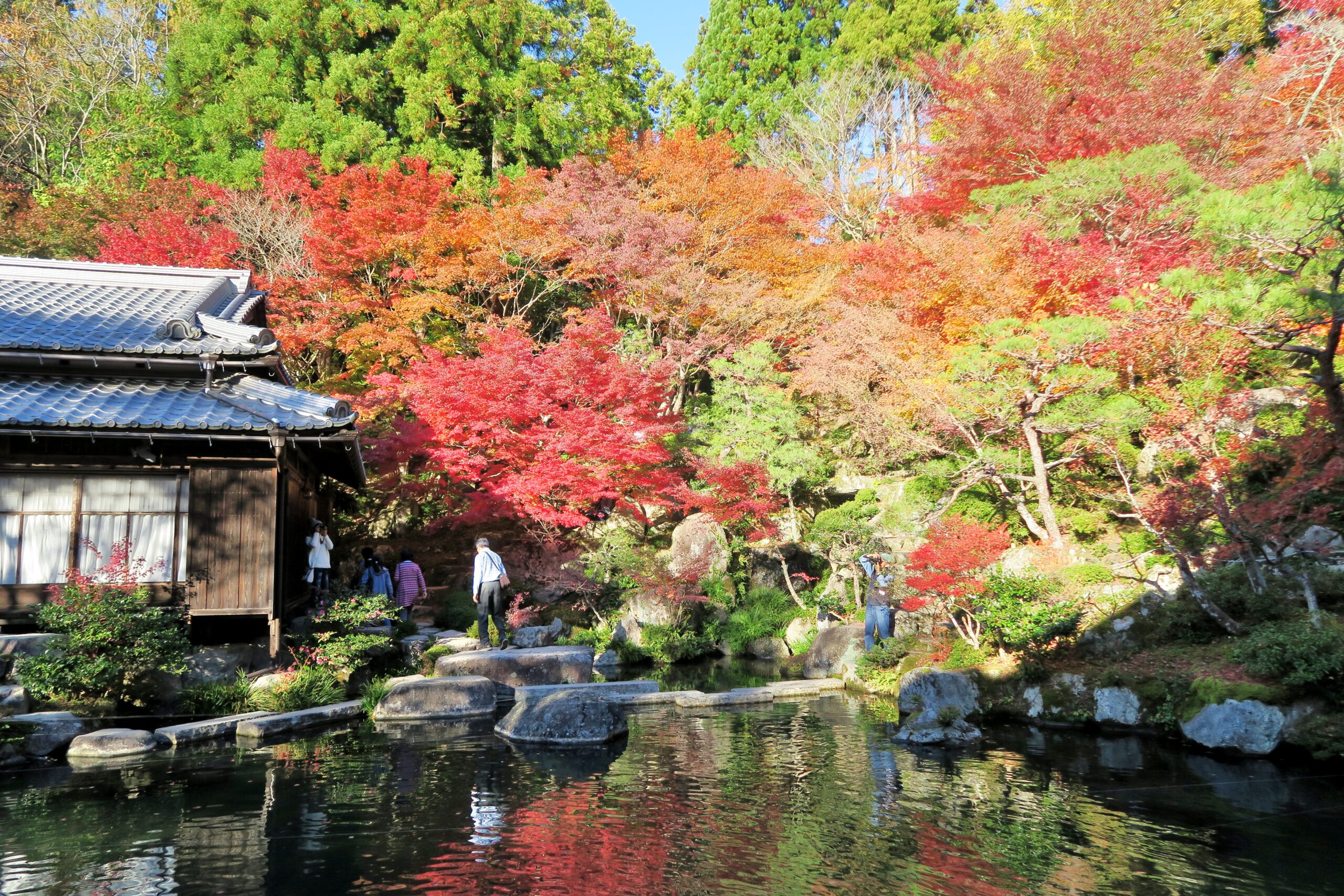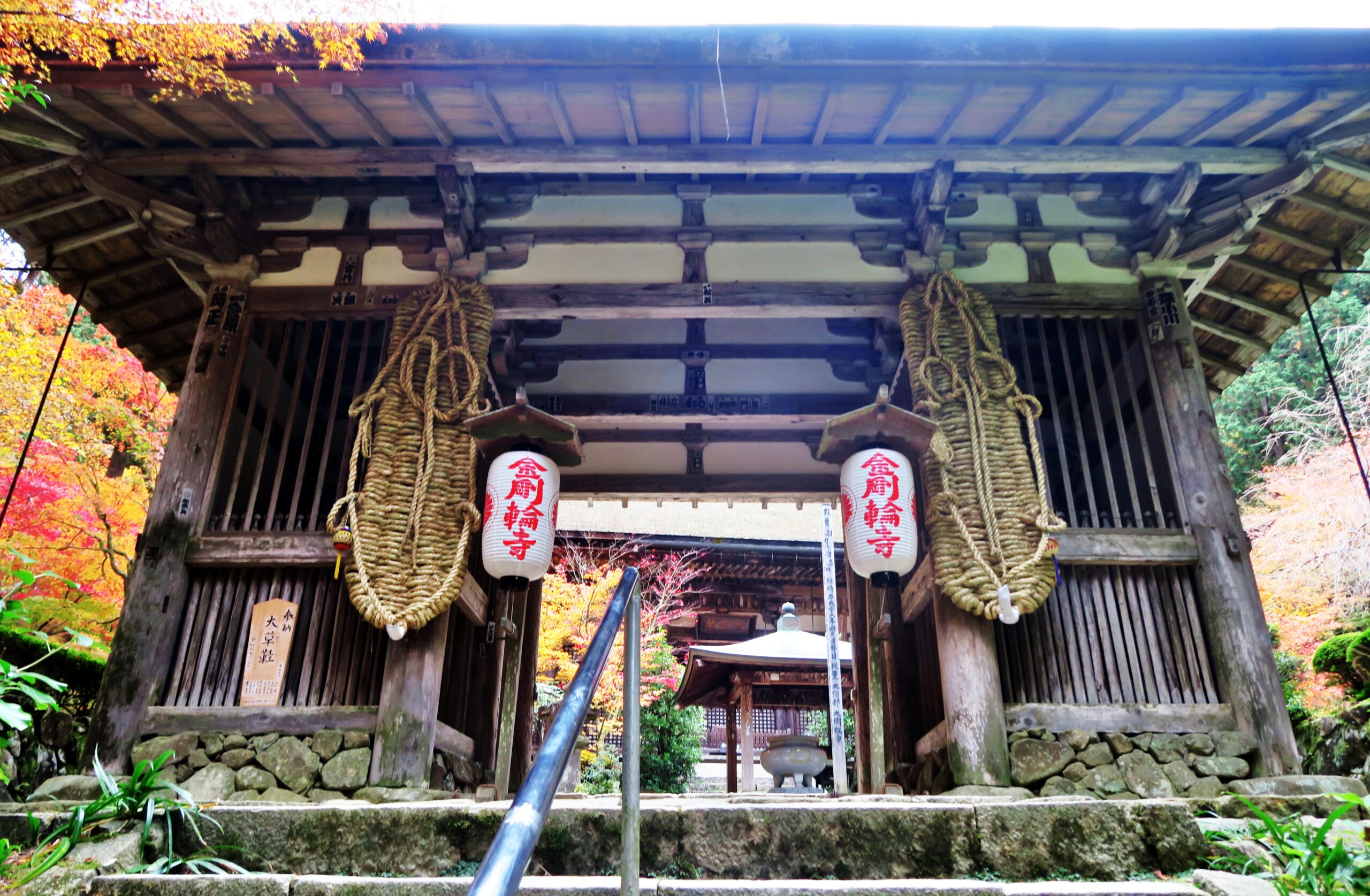 湖東三山まん中のお寺が愛荘町にある「松峯山 金剛輪寺」です。今から1200年以上の昔、聖武天皇の勅願によって行基菩薩により天平13年(741)に開山された天台の巨刹です。 秋はヤマモミジやイロハカエデを中心に全山が色鮮やかに紅葉し「血染めのもみじ」と呼ばれるほどに深紅に染まります。