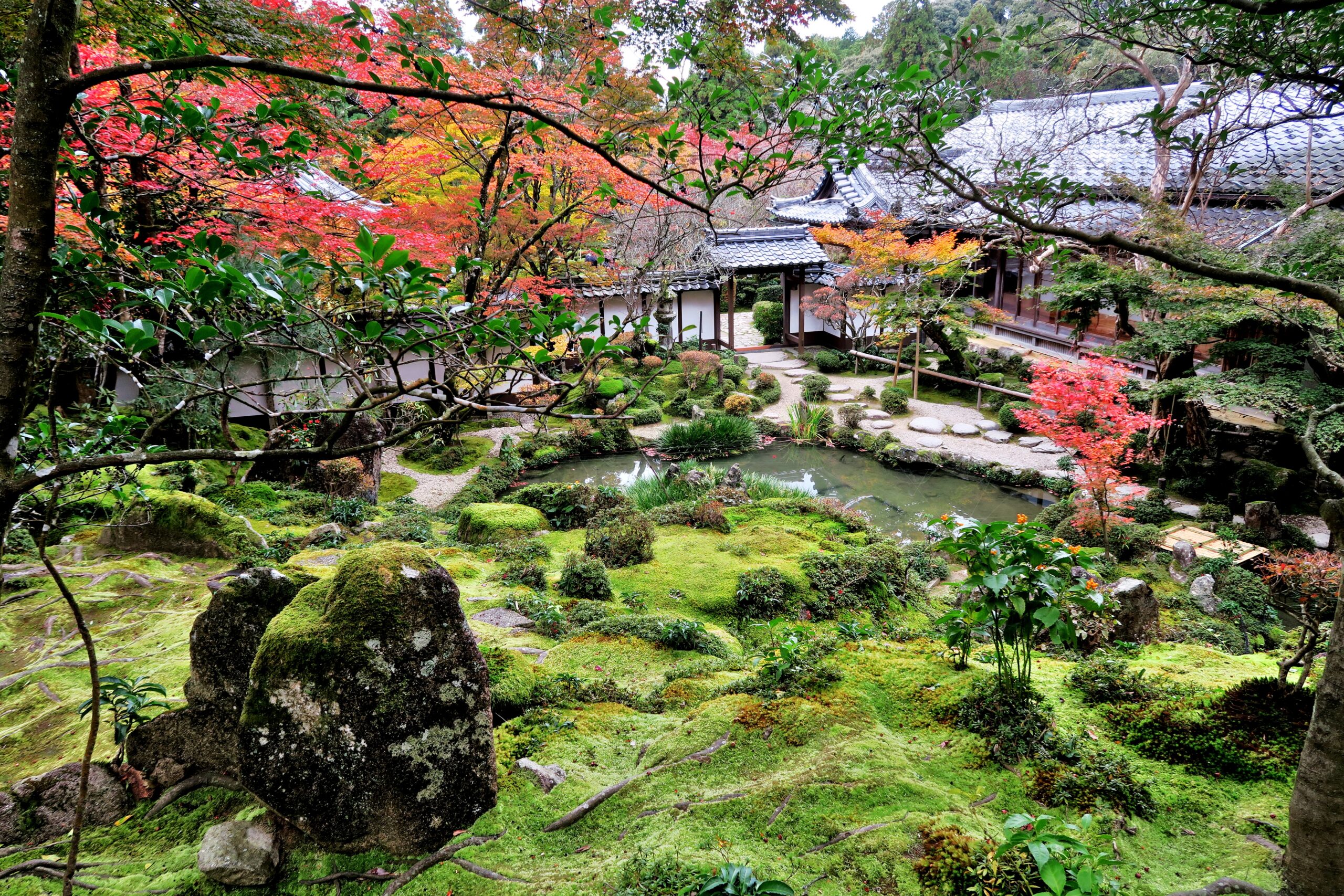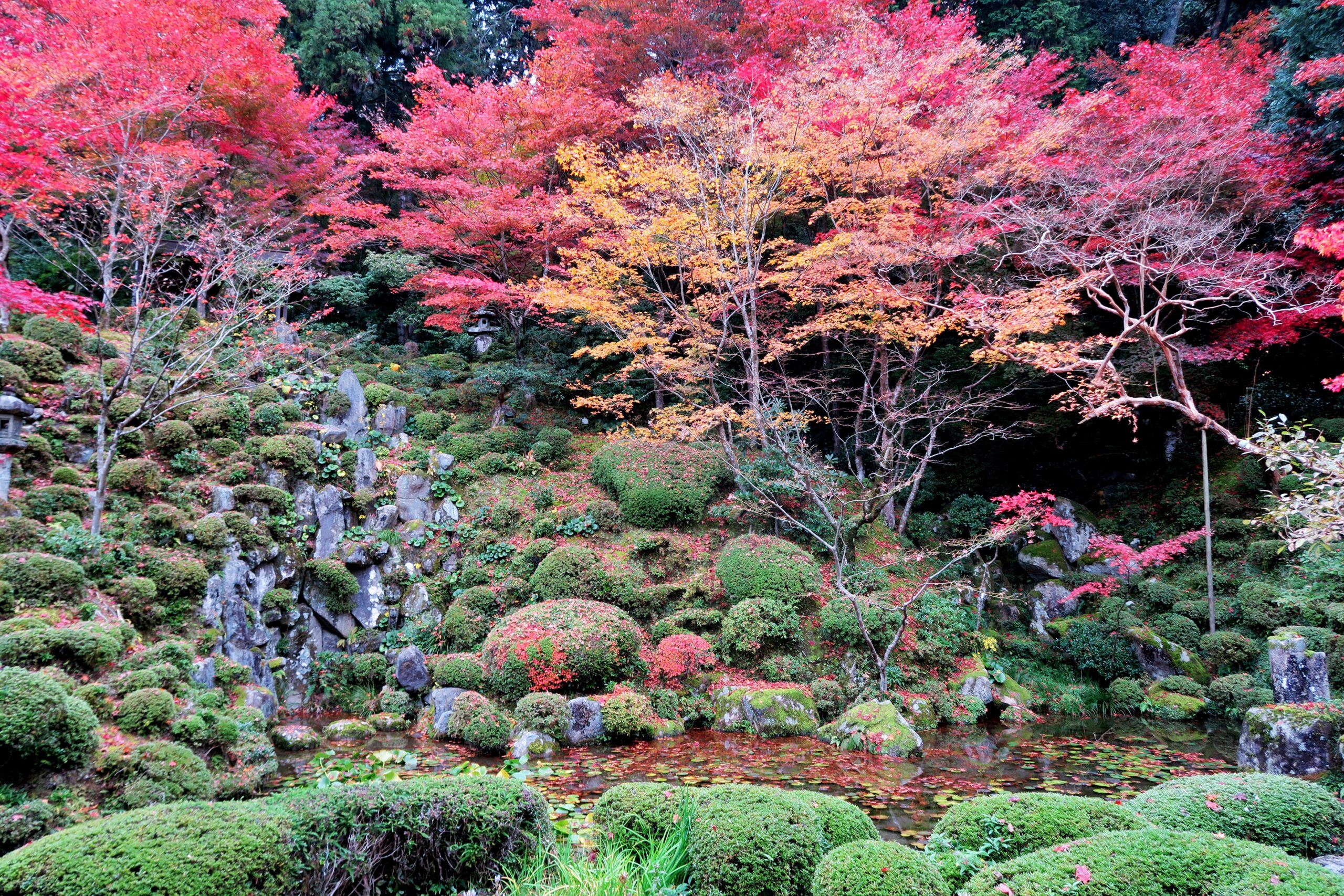 書院を中心に三つの池庭が連続する池泉回遊式庭園で南庭は桃山時代、主庭をなす東庭は江戸時代初期、北庭は江戸時代中期の作と推定される三庭からなります。作者不詳ですが老杉蒼松の自然を背景に、灯籠泉石樹木の配置が素晴らしく紅葉がこの時期映えます。