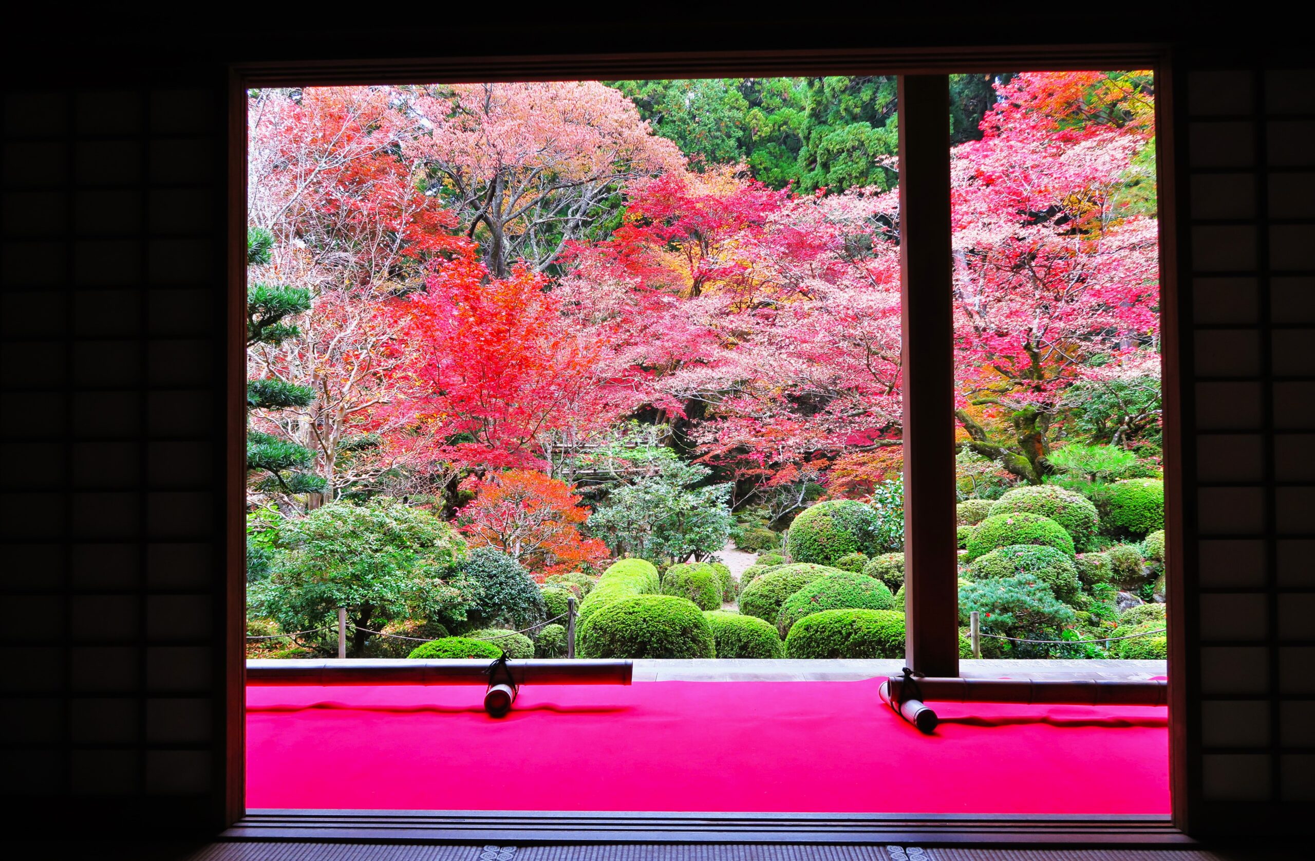書院の縁にこしかけて紅葉を心ゆくまで愛でれば、心の洗濯ができますよ。