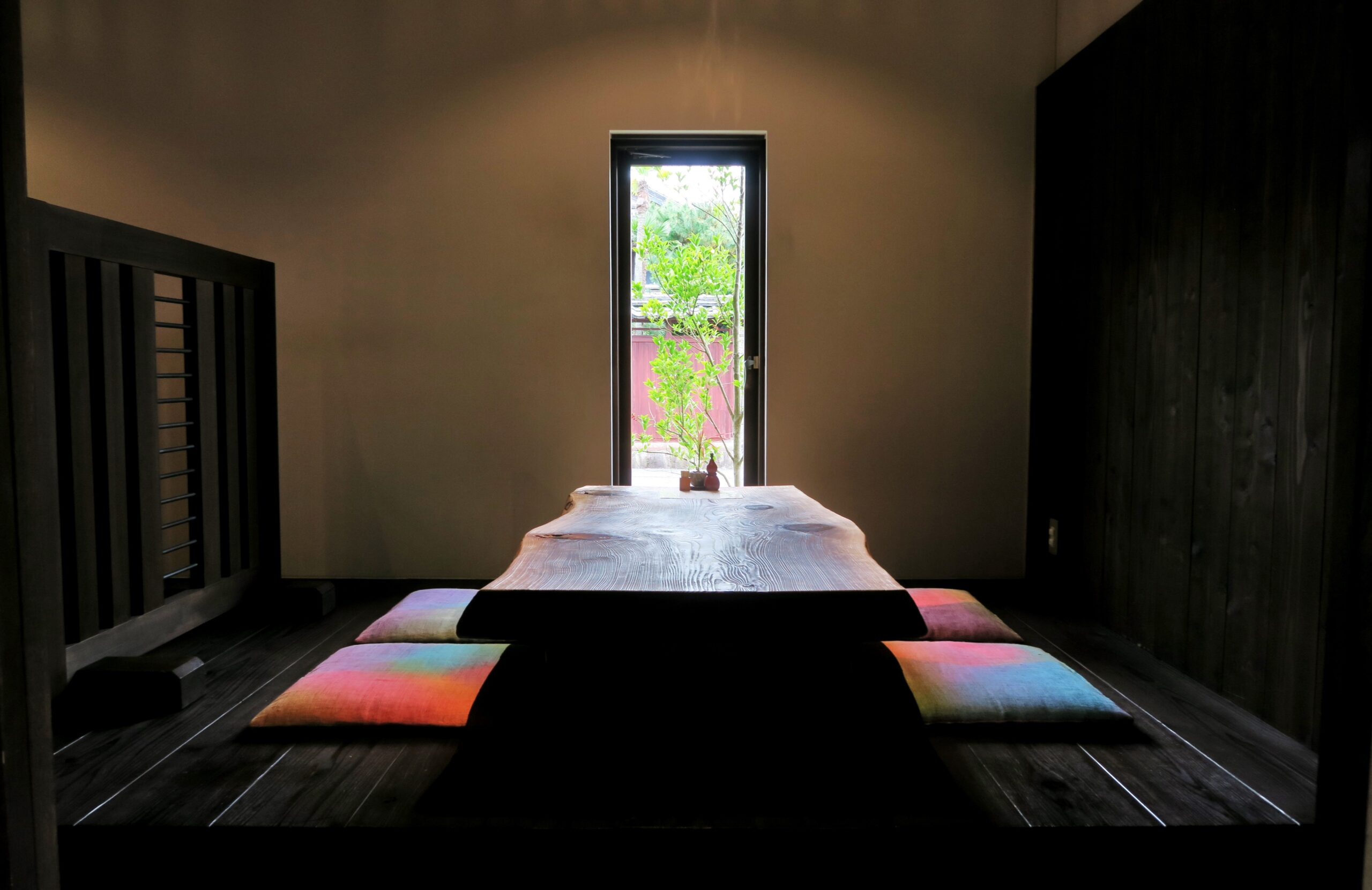 暖簾をくぐり京都の町家を思わせる長いアプローチを抜けると窓の外に映える鮮やかな木々が見事な借景となって目に飛び込んできます。