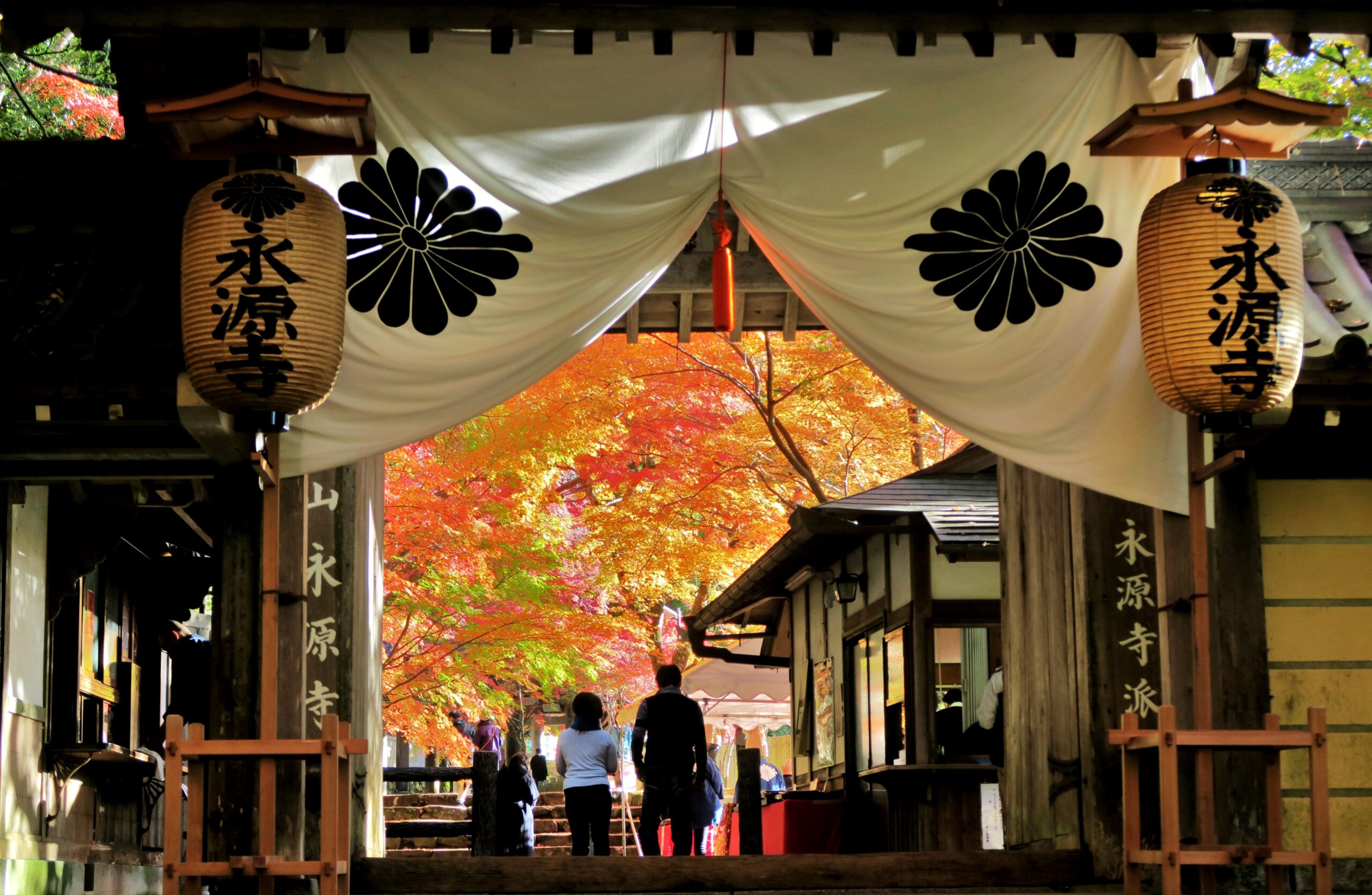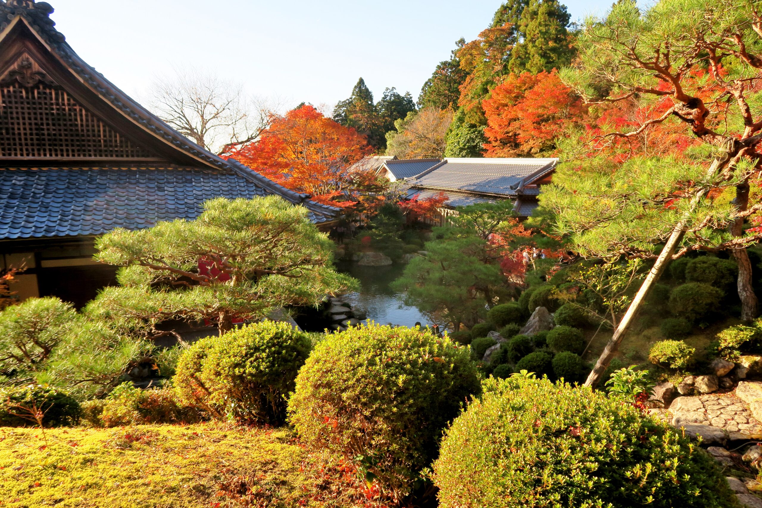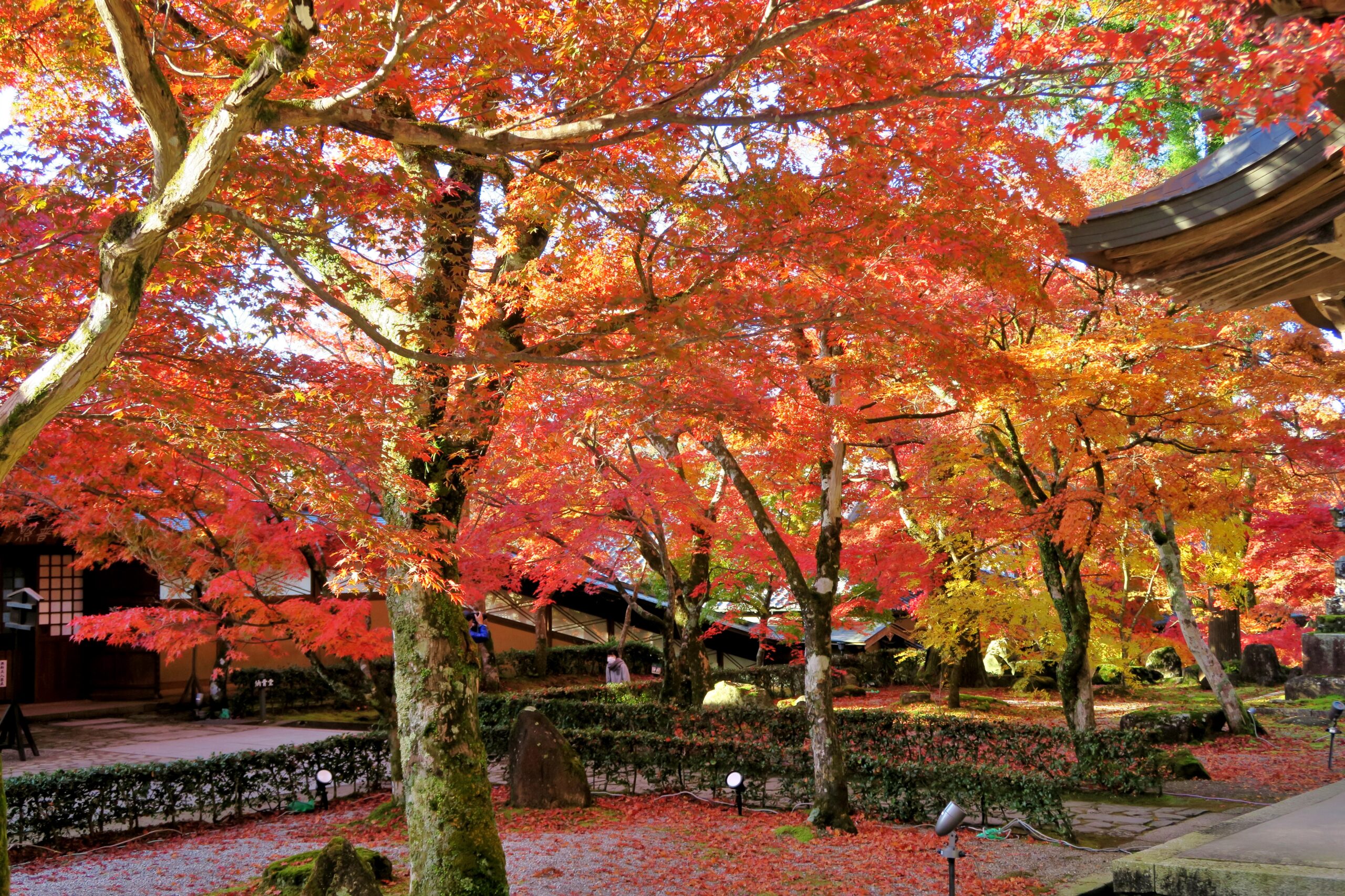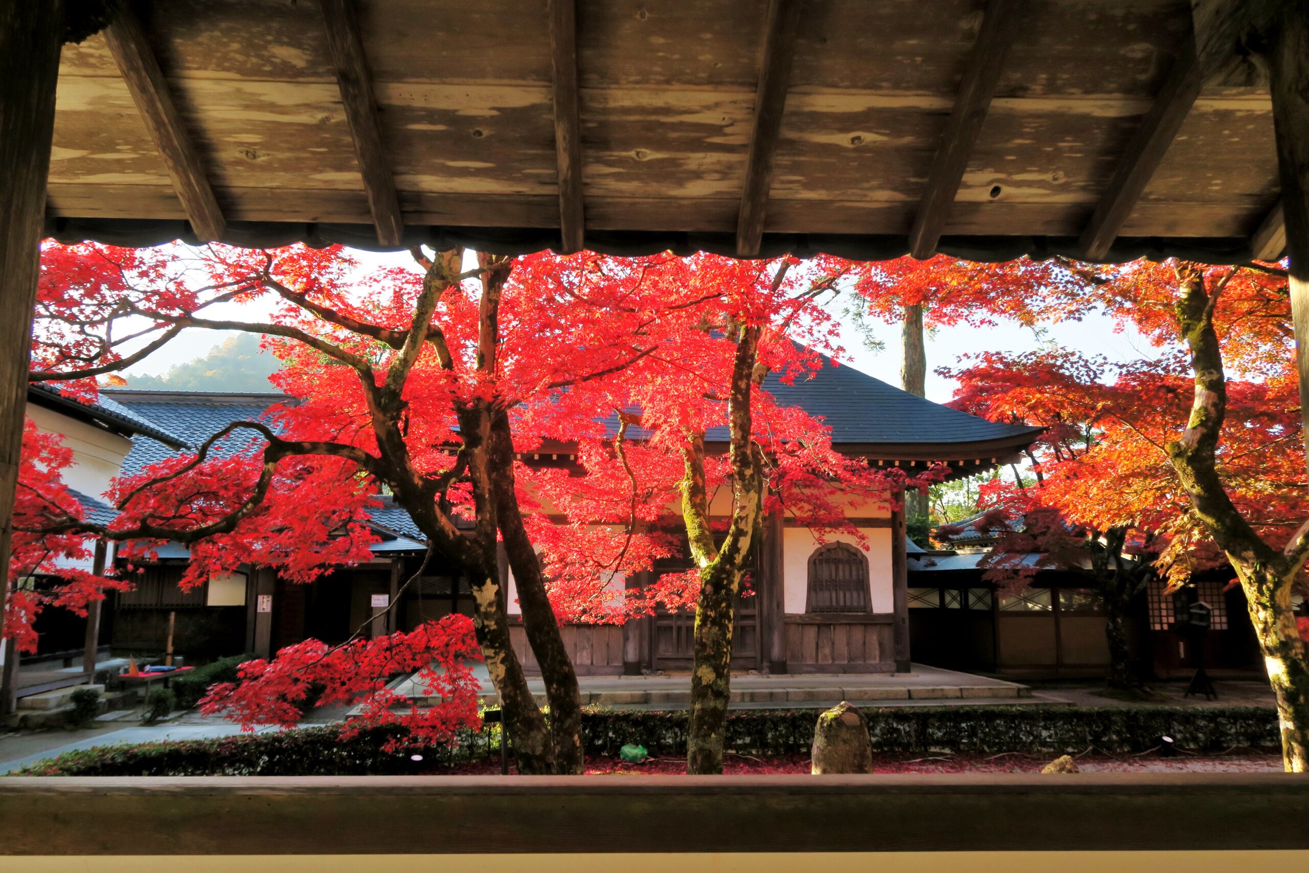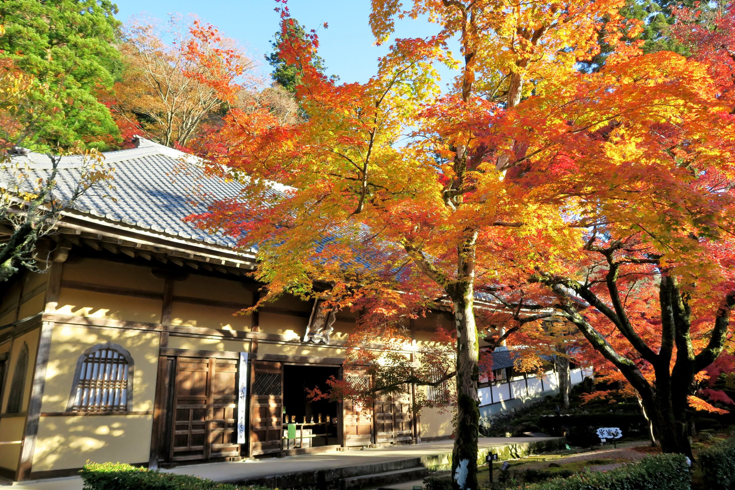 燃えるような紅葉が目を楽しませてくれる山門をくぐり、鐘楼の脇を通ると、本堂、法堂、開山堂などが甍を連ねる往時の様子をいまに伝える壮大な伽藍が点在し、その見事な寺院建築に彩りを添える紅葉に目を奪われます。広々とした境内を楓の老樹が埋めて錦織り成す秋の景色を見せてくれます。境内でゆっくり紅葉狩りを楽しんでください。