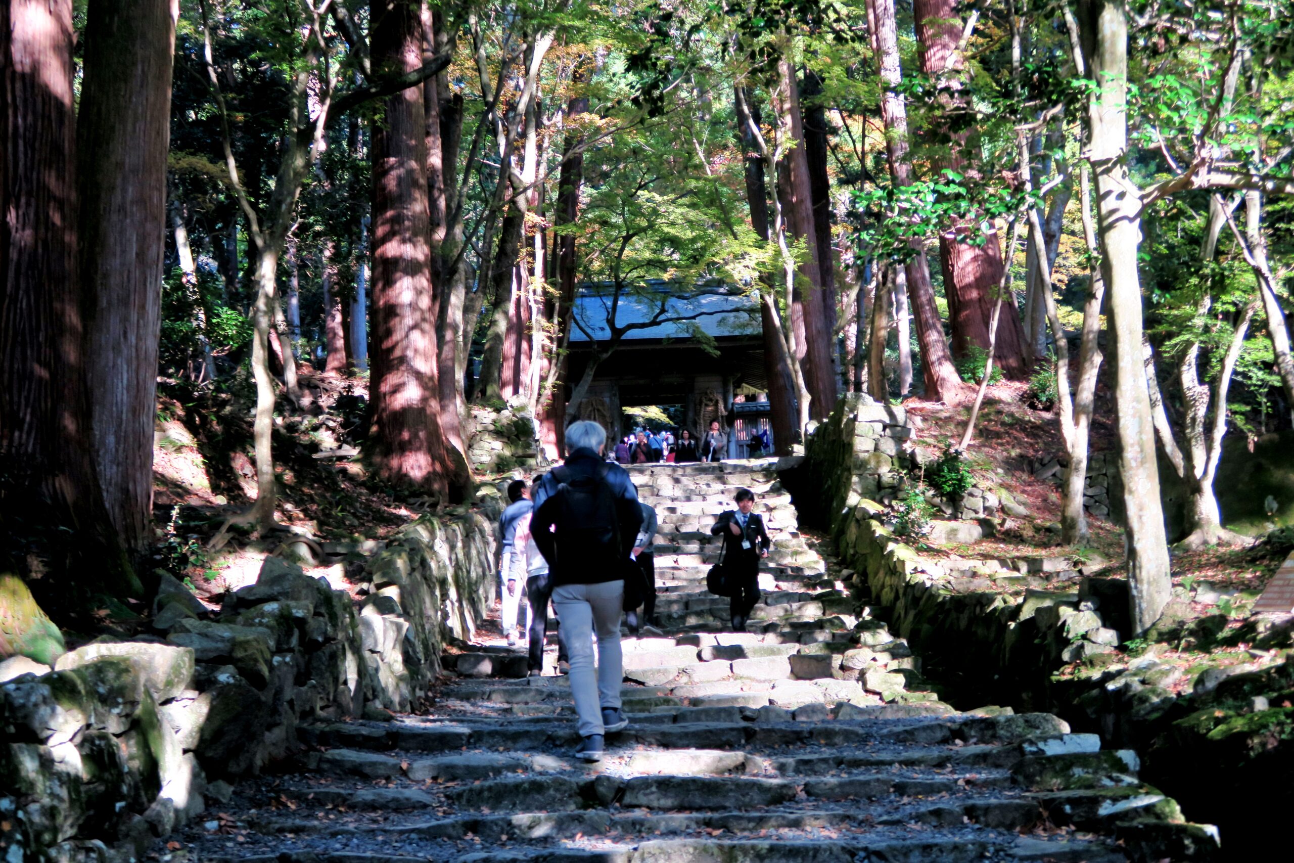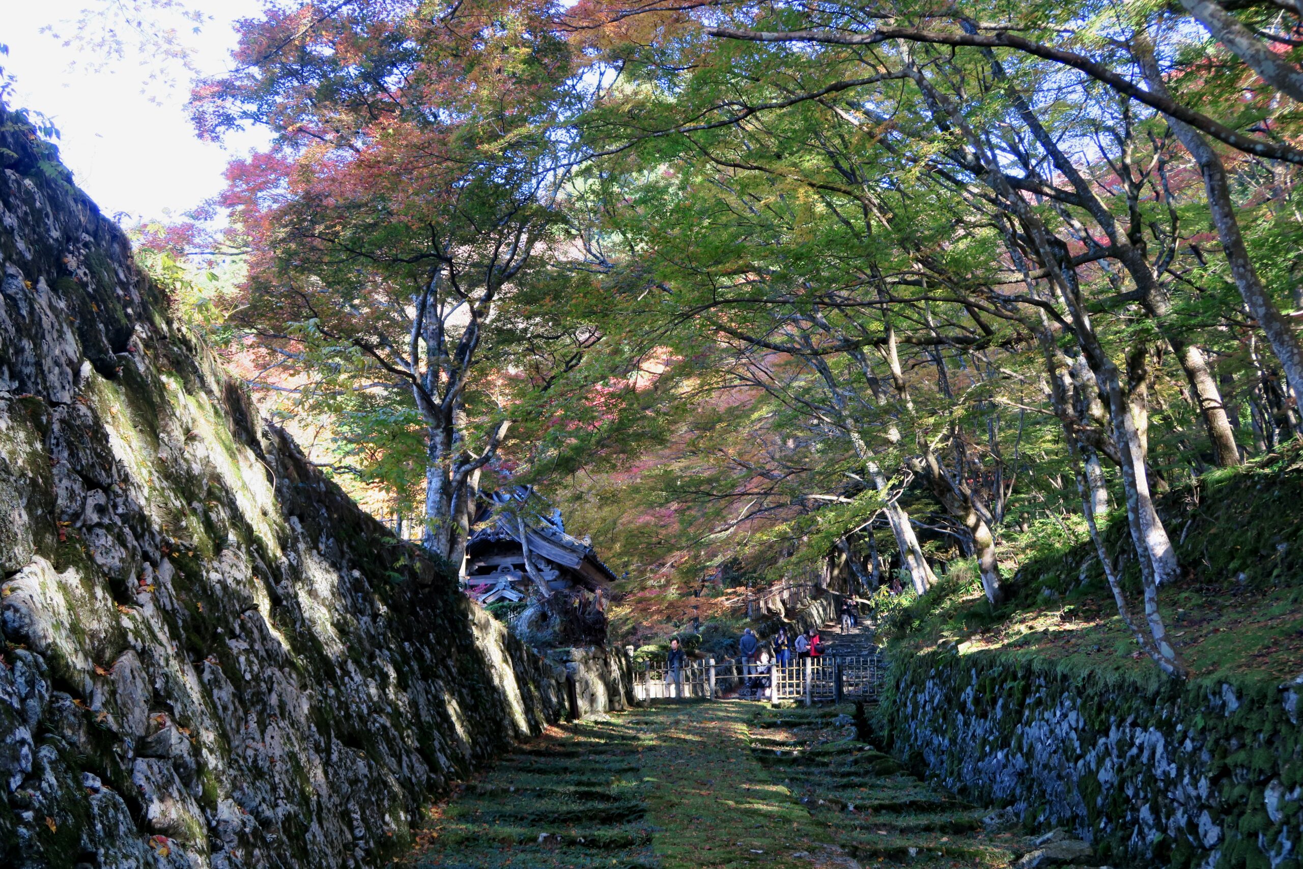 参道脇の上に残された平らな土地はかつての「僧坊」跡です。天正元年(1573)4月11日の信長の焼討ちに遭い往時の姿は「石垣参道」、棚田のような 「坊跡遺構」からしか偲ぶことができませんが幾度もの兵火や火災をくぐり抜けてきた寺の境内を1300本のカエデが美しく彩ります。(今年はまだ早かった)