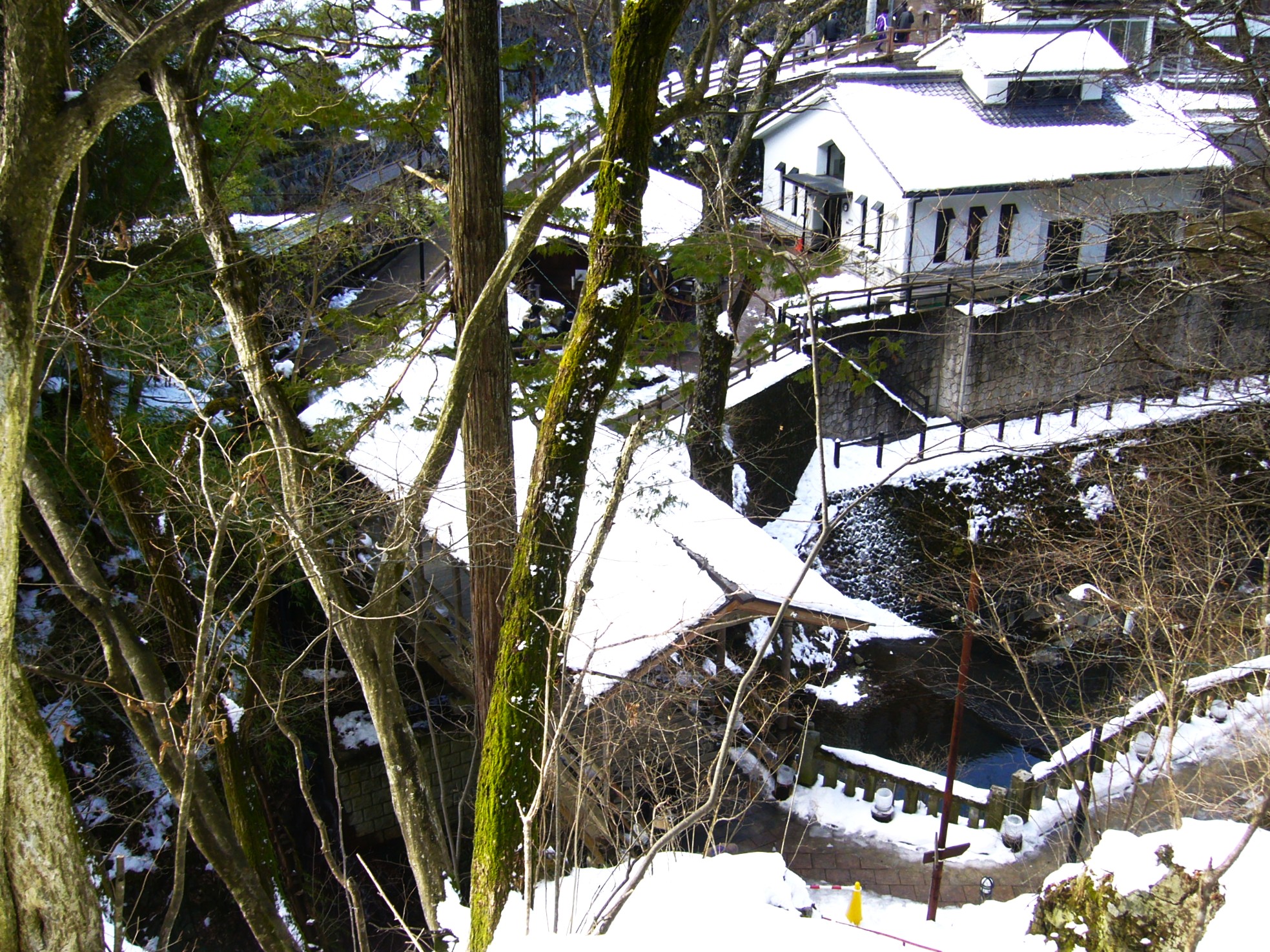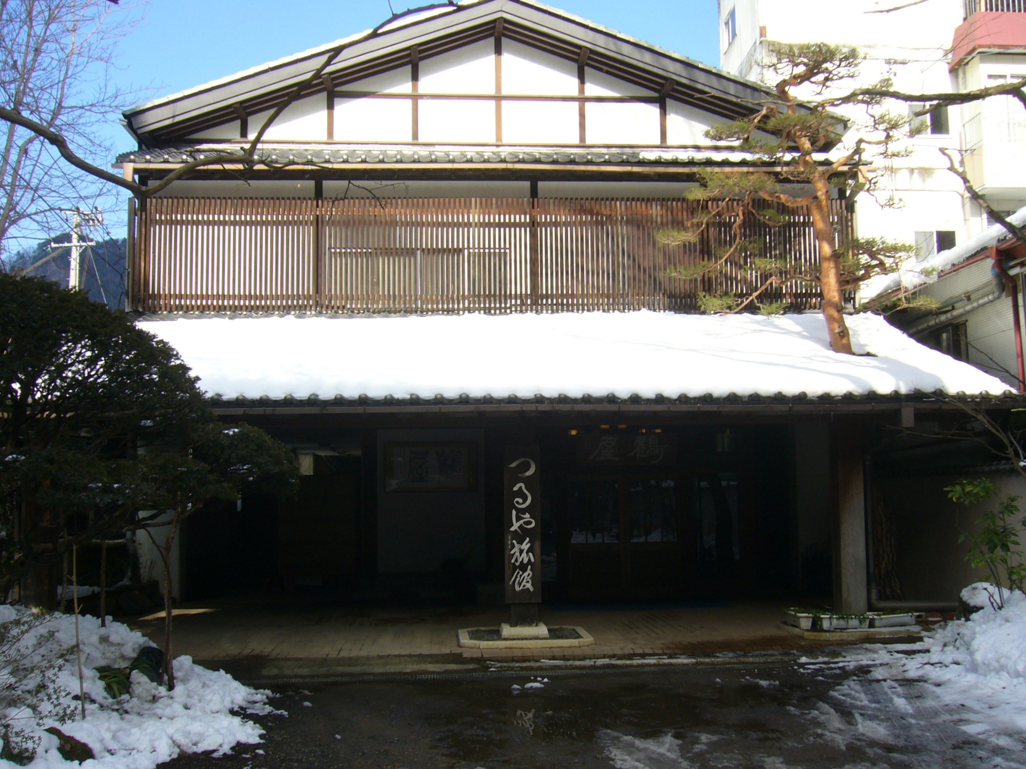 冬の寒さには温かい温泉の温もりが一番。湯端通りまで戻って今回はムササビの舞う渓谷に面した露天風呂が名物の「つるや旅館」を訪れる。浴場は2か所で玄関の位置が3Fにあたり、3Fにあるのが「文殊の湯」で男女別の内湯と混浴のムササビつき?露天風呂です。2Fは「薬師の湯」で男女別の内湯とそれに続く露天風呂があった。どちらも同じ湯で飲泉可能である。泉質は弱アルカリ性単純温泉で高血圧症、リウマチ、神経痛とあるが、小生にはまだ用のない効能であるが飲泉しながらの”ぬる湯の長湯”はデドックス作用があるように感じるのであった。ムササビの巣だけではあるが雪のつもった森を眺めながらの渓谷の露天風呂はぬるめのお湯とあいまってのんびり湯に浸かれます。2Fの薬師の湯もこじんまりとしている。