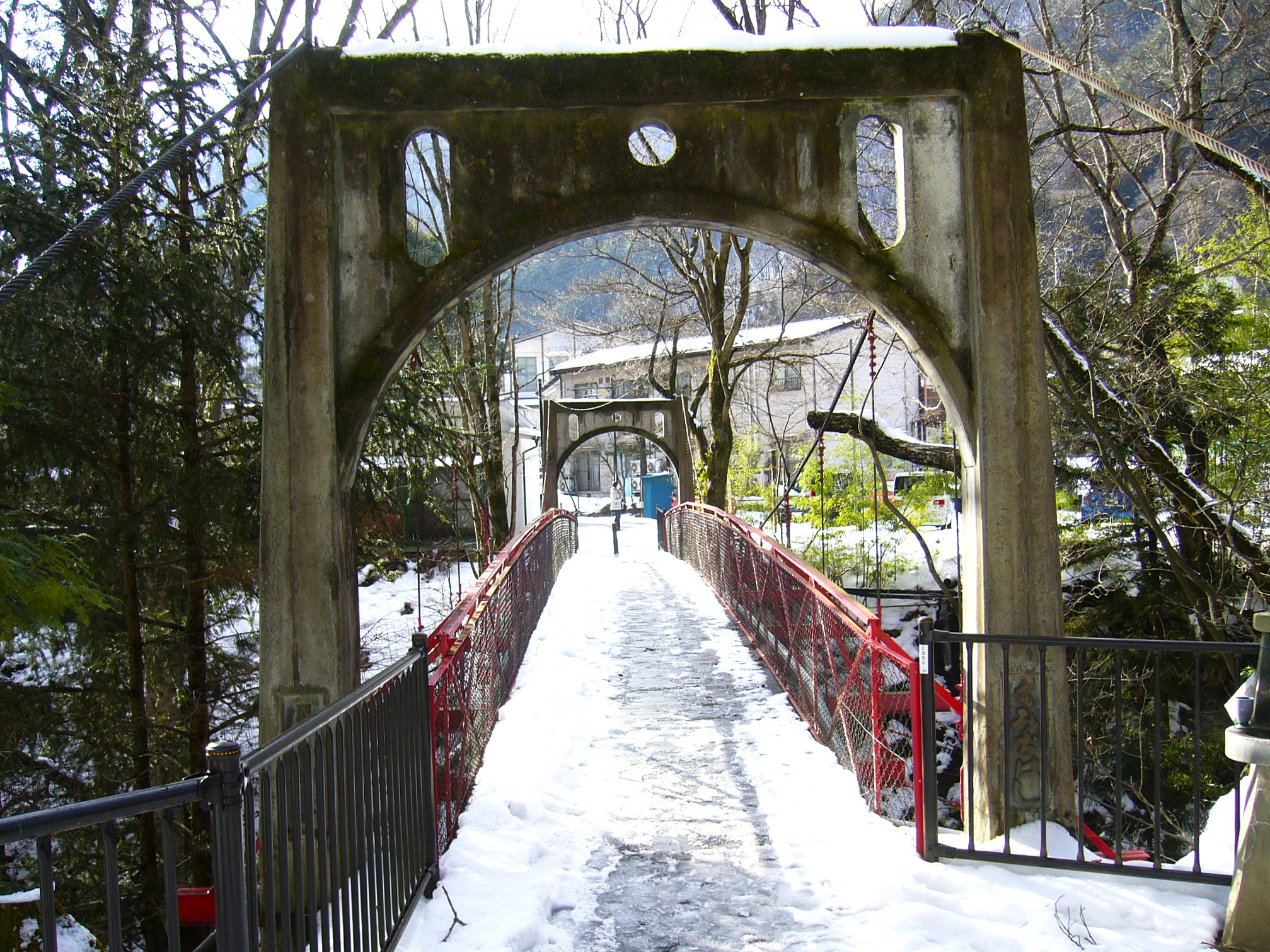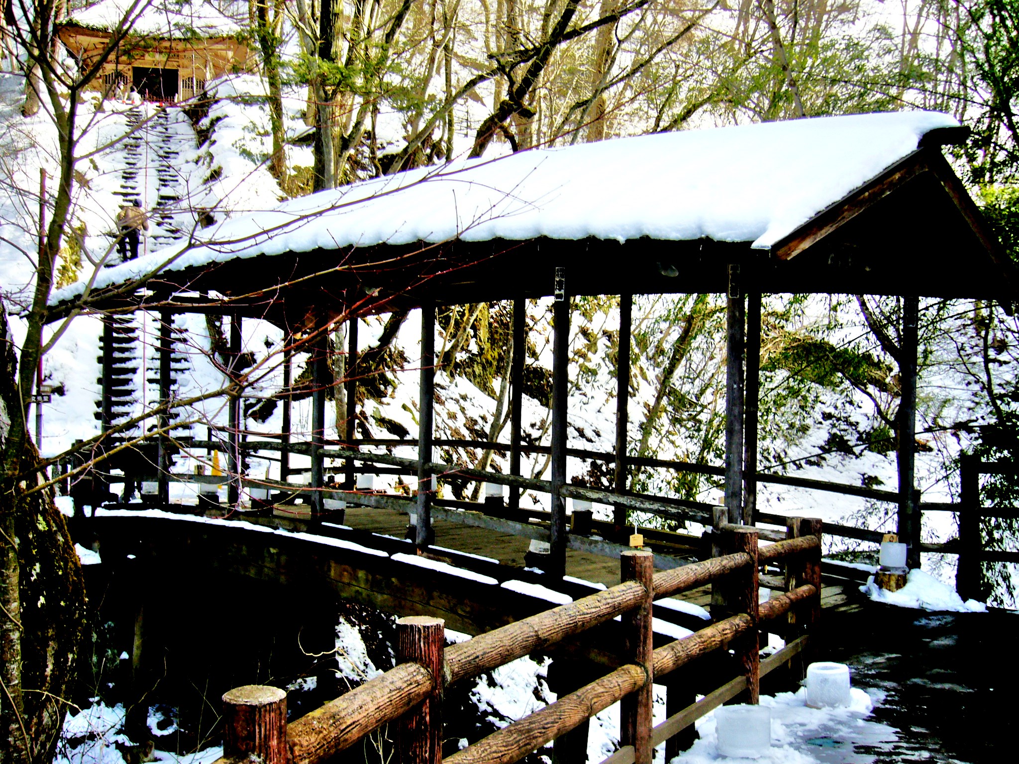 公共の湯の文殊の湯を横目に内村川に架かる「日本のマディソン郡の橋」と呼ばれる珍しい屋根付き木造橋の五台橋が目に飛び込んでくる。正確な築造年は定かではないが、書物によると、元禄15(1702)年には既に修繕の記録があり、300以上はここに橋が架けられてきたことになる。「現世と神の世界を結ぶ橋」としても知られ、木々がしげり、川のせせらぎが心地良く響くその場所は大自然にくるまれているような静けさと安らぎに満ちていて神聖な趣があるが、毎年12月から「鹿教湯温泉氷灯ろう夢祈願」といって約200個の氷灯ろうに火が灯されますます幻想的です。                                          「信州「鹿教湯温泉氷灯ろう夢祈願」は氷の炎と湯の温もり」はこちらhttps://wakuwakutrip.com/archives/235
