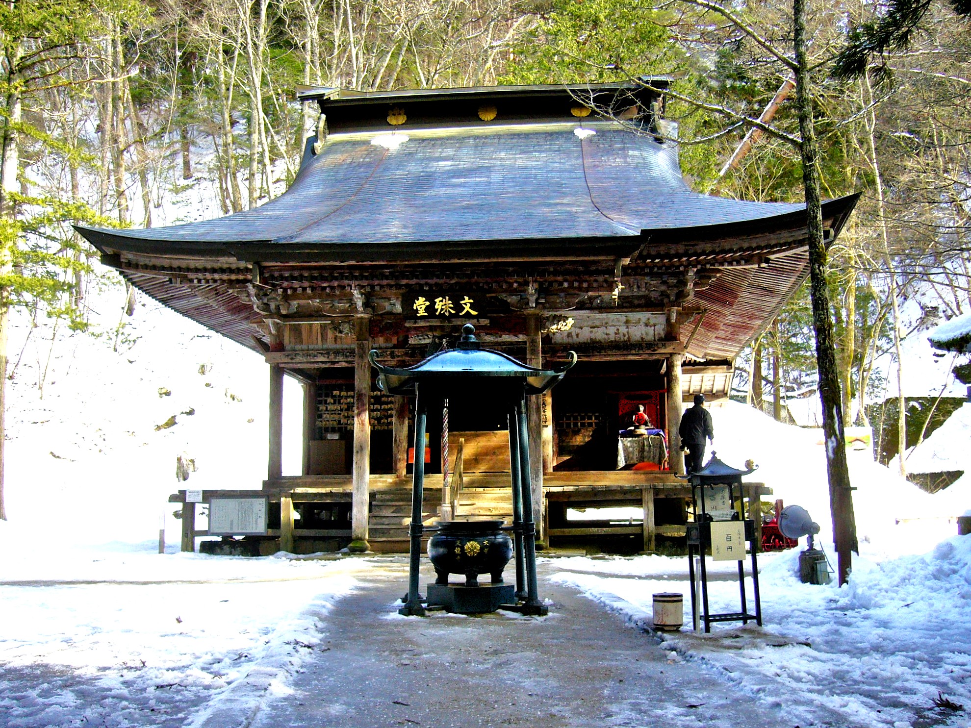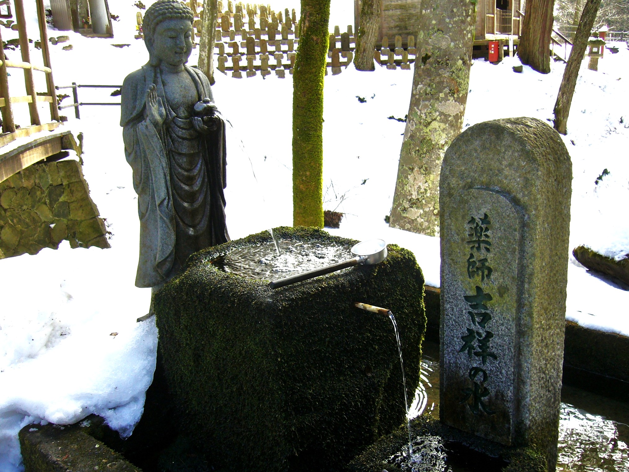 もう一つの屋根付の橋「寺沢橋」をはさんで佇む文殊堂には、その文殊菩薩が祀られています。薬師堂から文殊堂に通じる小径の途中、幻想的な木立の中に吉祥水があります。美ヶ原を源とするこの湧水のそっと触れてみてください。水場から飛び出す水にも愛嬌を感じてしまいます。