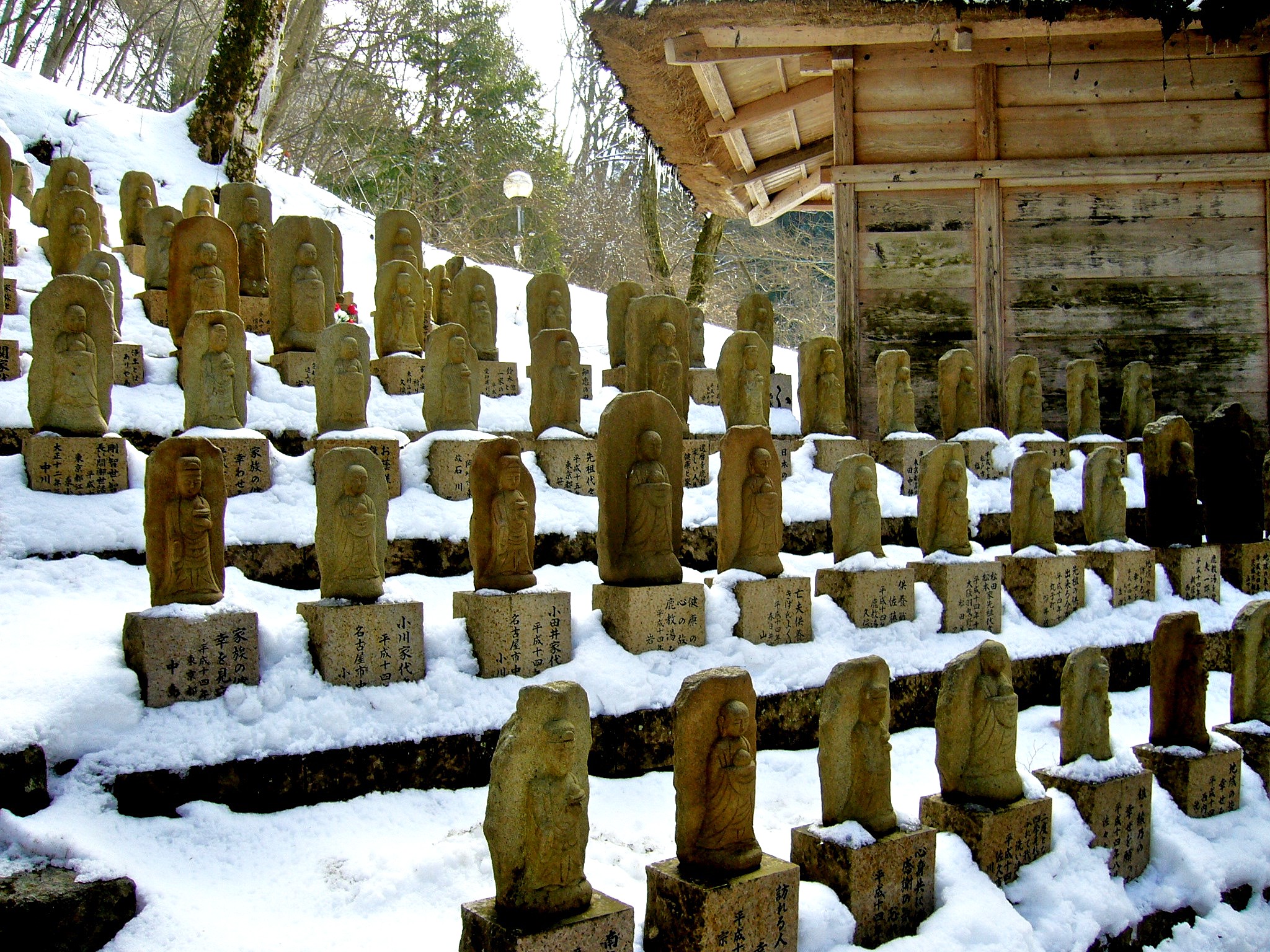 薬師堂の傍らには、温泉を訪れた人々がそれぞれの願いを託した石仏を造り奉納した数多くの石仏が林立しています。