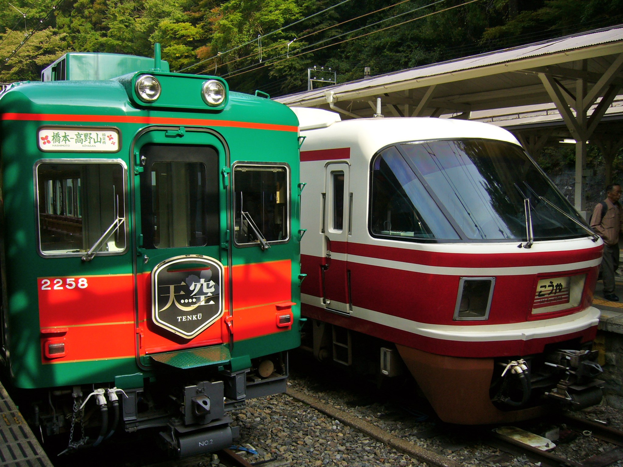 高野山の麓・橋本駅から極楽寺橋までの19.8km、急勾配の斜面、24ものトンネルをくぐりながら標高差443mの山岳区間を駆け上がっていく区間は、南海高野線「こうや花鉄道」と呼ばれ、「天空」という特別列車が走っています。こちらも別途座席指定料金500円が必要ですが、窓向きの座席や展望デッキがあり、山の空気や自然をたっぷり楽しむことができるちょっとリッチな鉄道旅情が満喫できますよ。