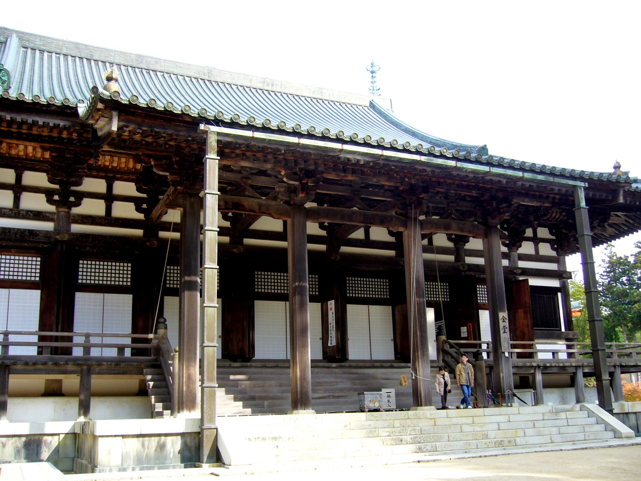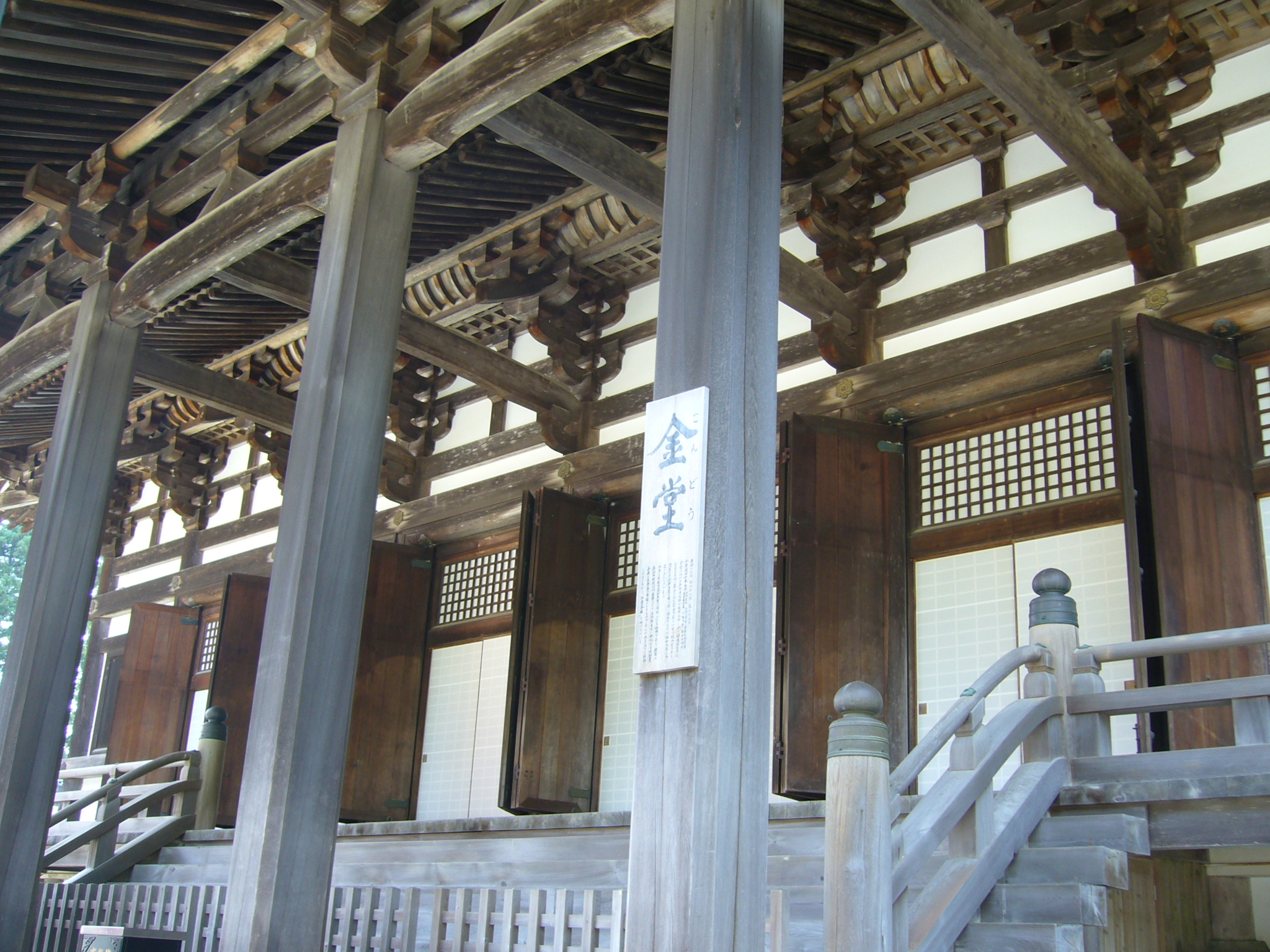 大師私願の堂として造営が進められ、完成後は嵯峨天皇御願の堂とされたものとのこと。金堂の裏手には延歴23年5月に入唐した大師がその2年後帰朝する際、明州の浜から伽藍建立の地を占うために空に向けて投げた密教法具の三鈷杵が光を放ちながら掛かっていたと伝えられる松葉が三本という珍しい松である「三鈷の松」がある。